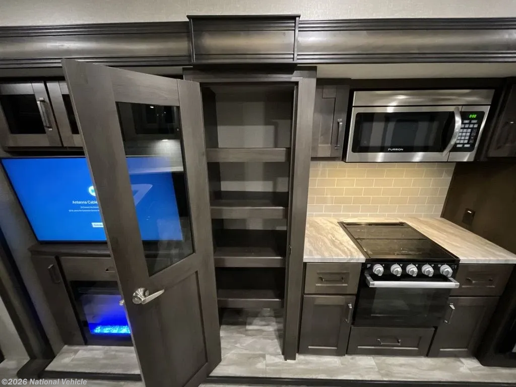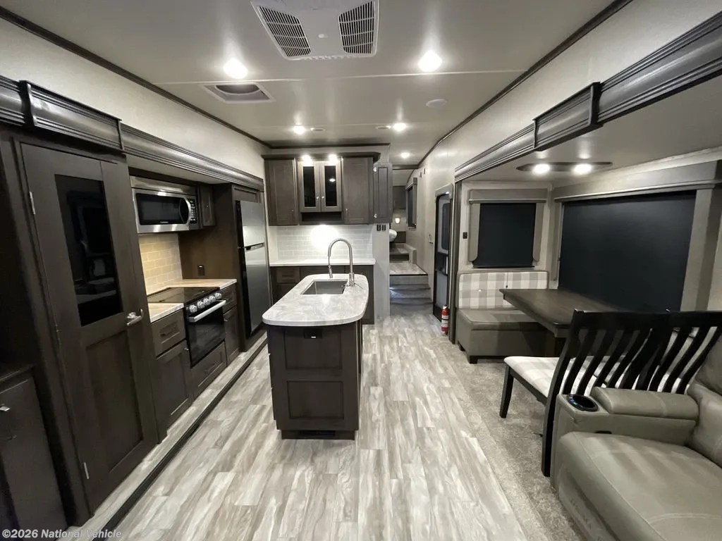 The heart of this fifth wheel is the well-appointed kitchen, complete with solid surface countertops, a spacious island with extra prep space, a three-burner cooktop with oven, microwave, and a refrigerator. Whether you?re preparing a full meal or a quick snack, you?ll appreciate the thoughtful layout and ample storage throughout.