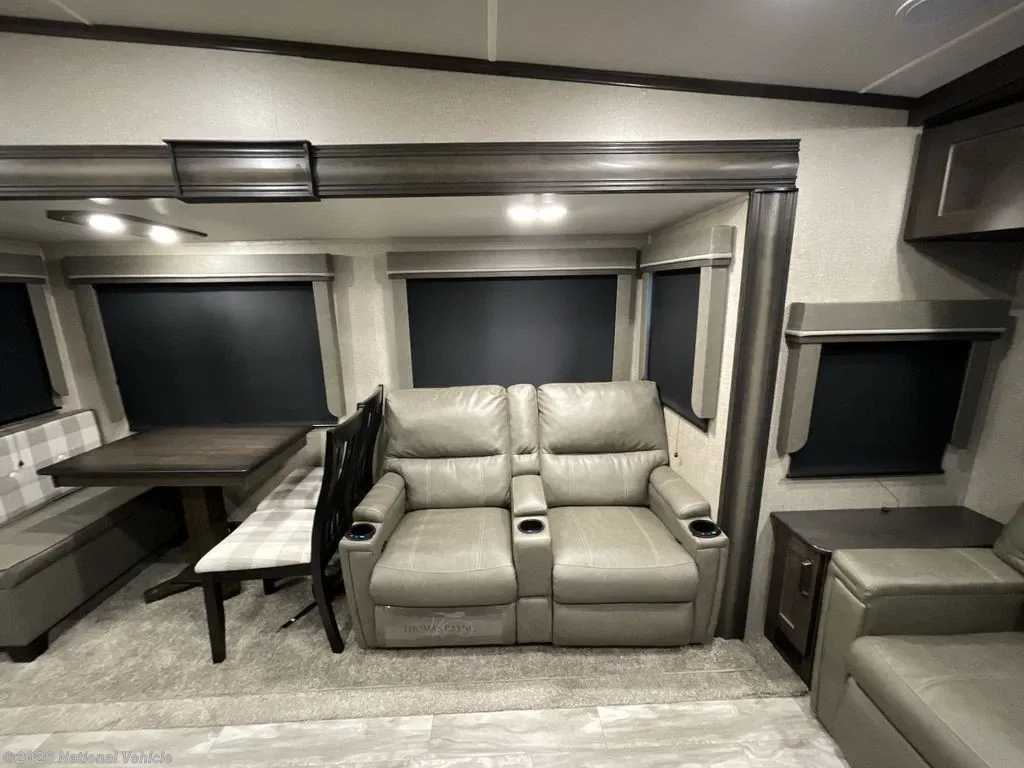 The rear living area features comfortable seating options and an entertainment center - perfect for cozy nights in or hosting friends and family. The adjacent dining space offers a dinette table with panoramic views, making every meal a pleasure.