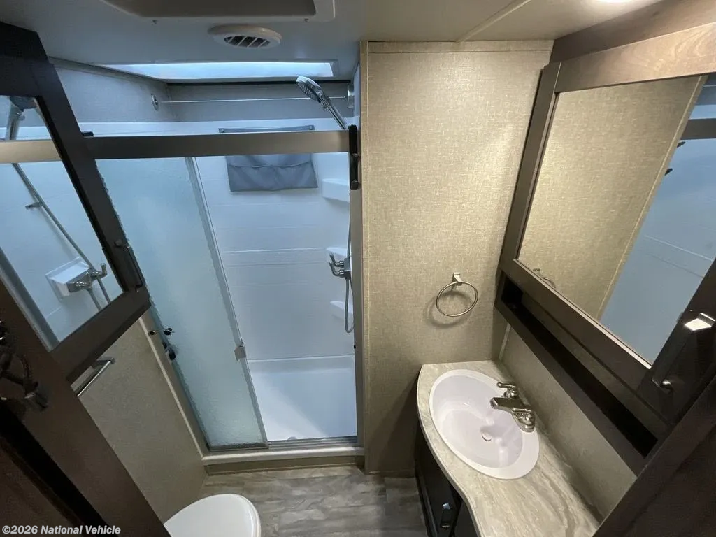 Toward the front of the coach, the private bedroom provides a peaceful retreat with a queen-size bed, wardrobe storage, and more natural light. A spacious bathroom with a large shower, vanity, and toilet adds convenience and comfort to your travels.