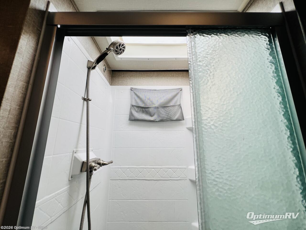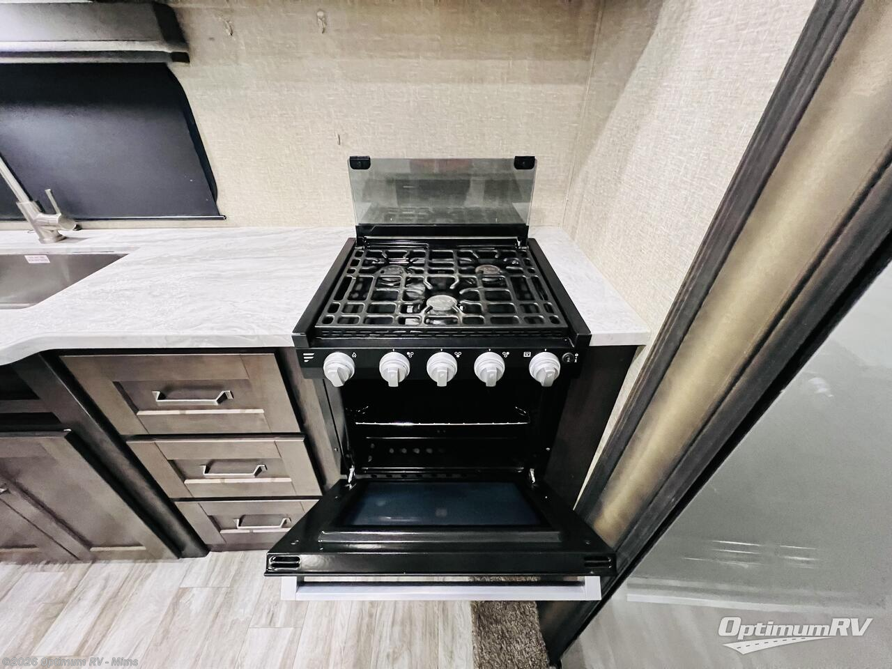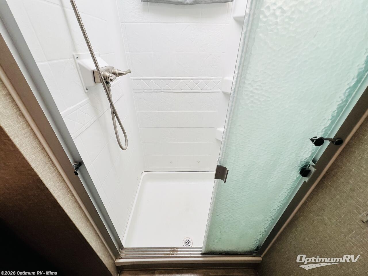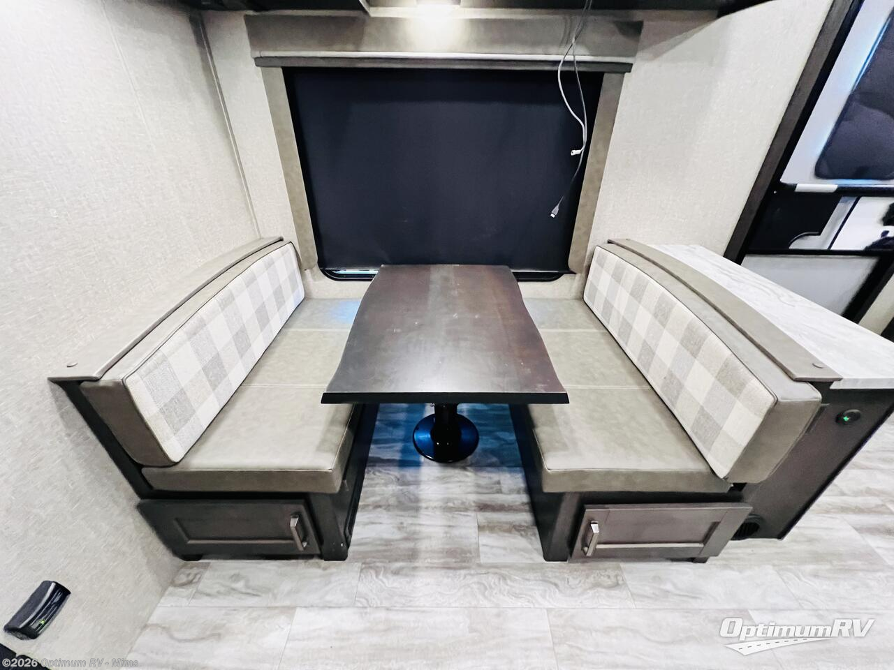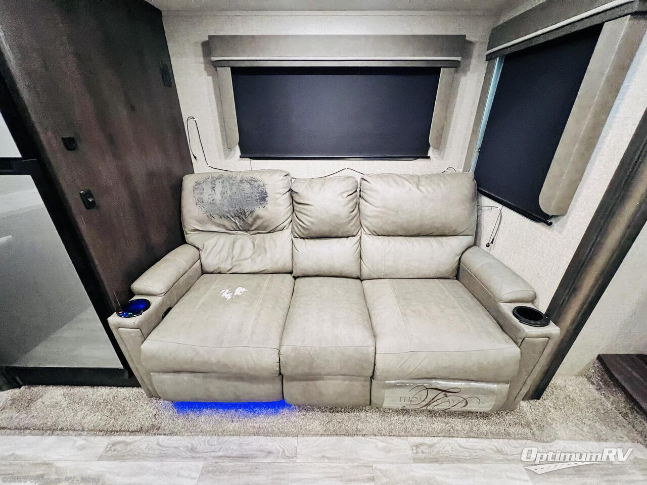 Enjoy a weekend getaway at a campground or off-grid in this fifth wheel! The front private bedroom has a queen bed for you to lay your head on at night and overhead cabinets to keep things out of the way. Inside the full bathroom there is a shower with a skylight for added natural lighting as you get ready each morning. Once you have prepared a delicious home cooked meal at the rear kitchen, head to the booth dinette for a comfortable place to enjoy it. What better way to wind down your nights than to relax on the 70" theatre seating and watch your favorite movie on the 40" LED HDTV. The theatre seats can also be switched out for an optional tri-fold seating if you would prefer that type of seating.