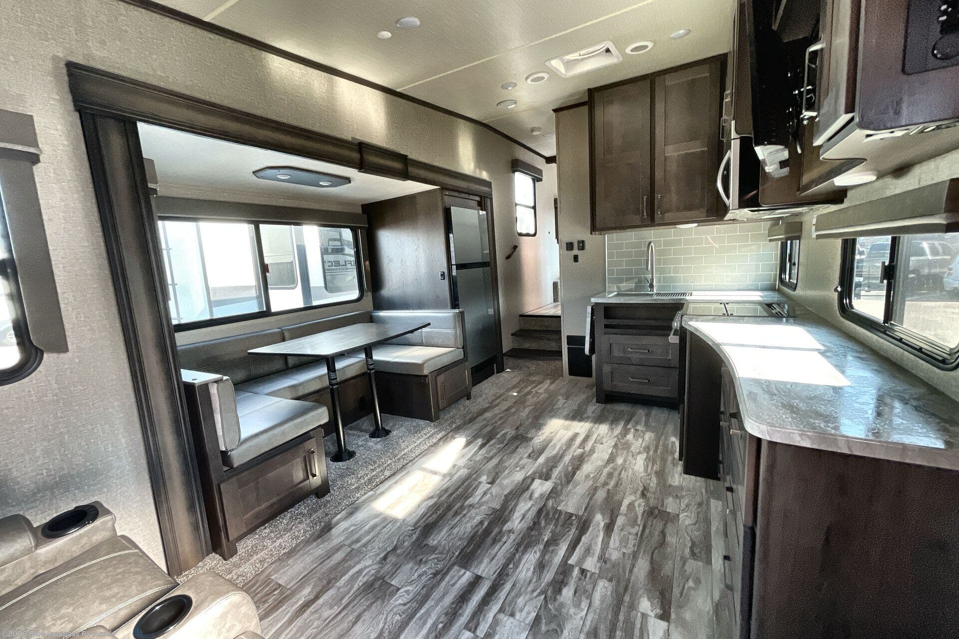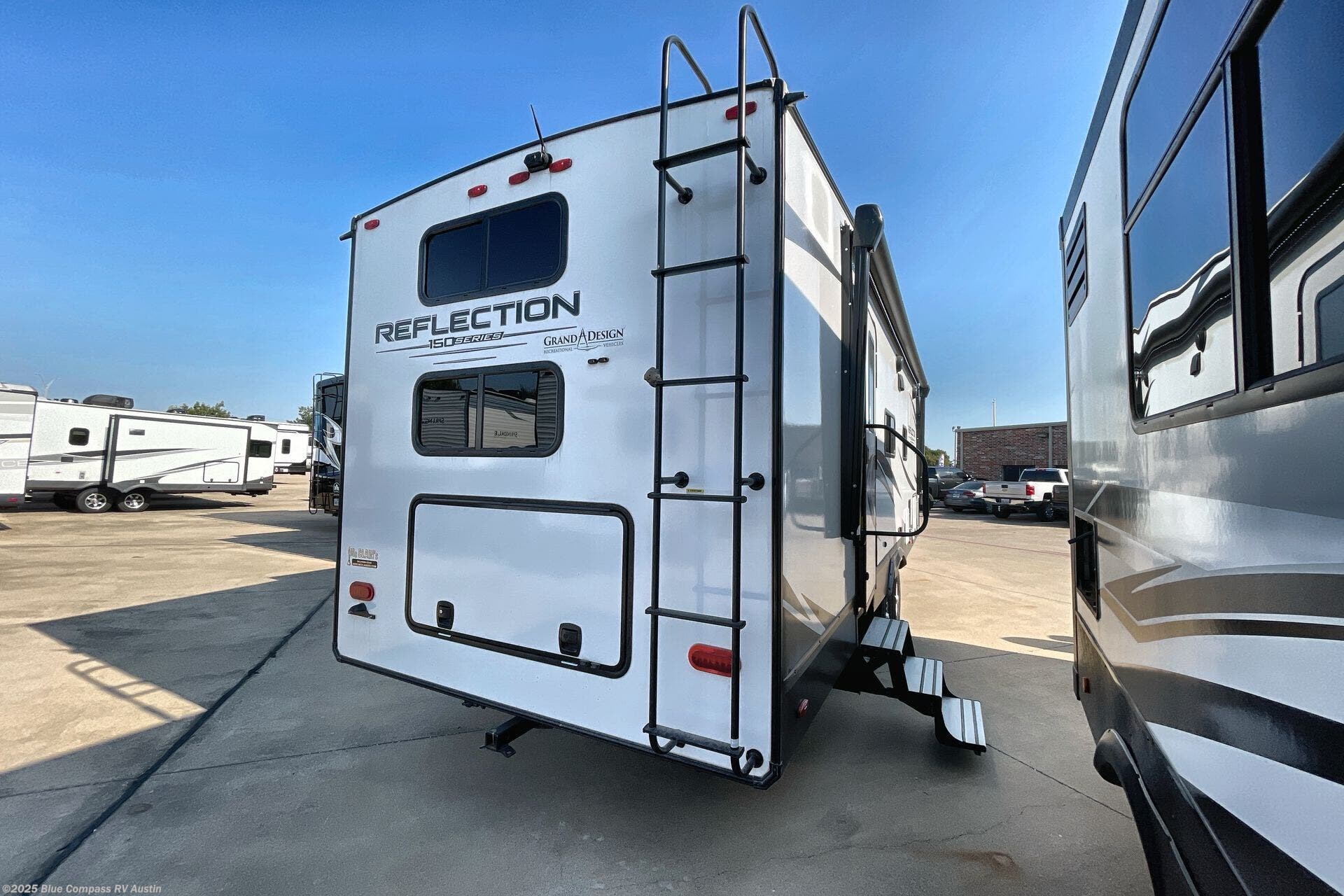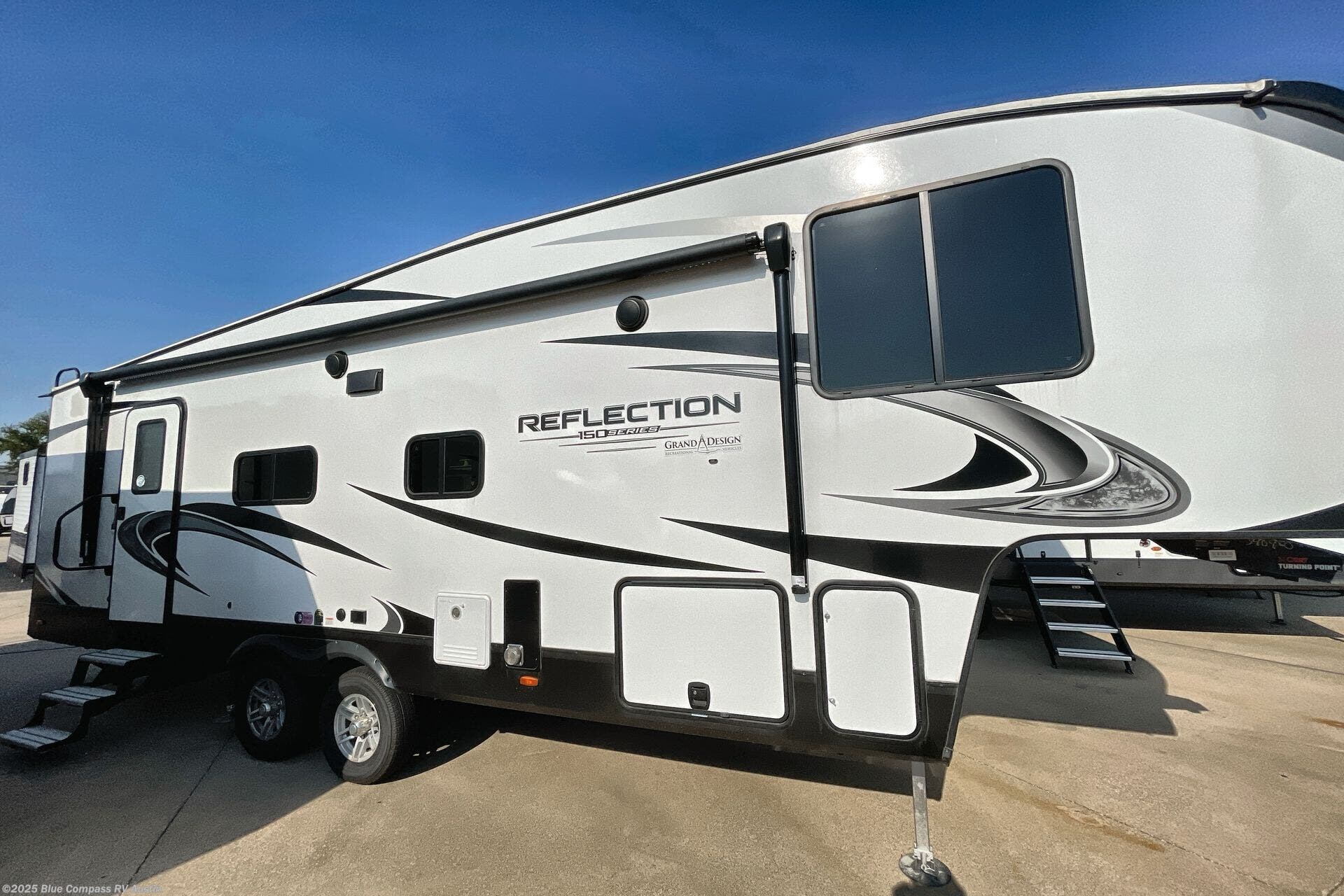 With any Reflection 150 Series fifth wheel by Grand Design, there is more available payload capacity and a broader range of half-ton trucks capable of towing this fifth wheel, and no slider hitch is needed thanks to the 90-degree turning radius which makes them short bed friendly and easier to tow. The mandatory Ultimate Power package provides a "One-Touch" automatic leveling system and a detachable power cord with LED light for easy setup, plus motion sensor pass-through lighting and entry lighting, and the Tire Linc TPMS will help you stay safe on the road. The interior offers residential luxury from the cabinetry and gunstock hardware plus the booth dinette to the residential-style window treatment. Make your refined decision today!