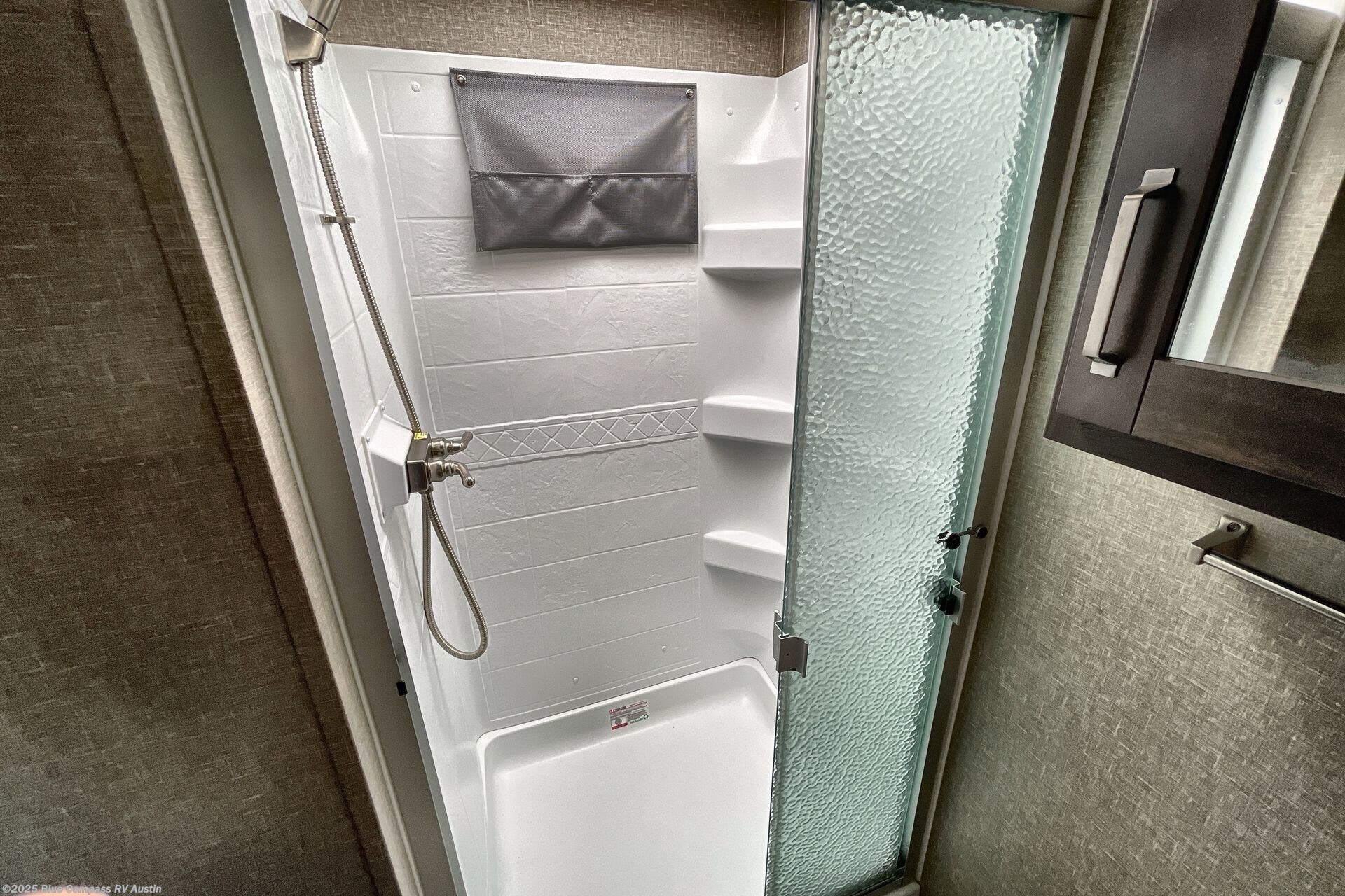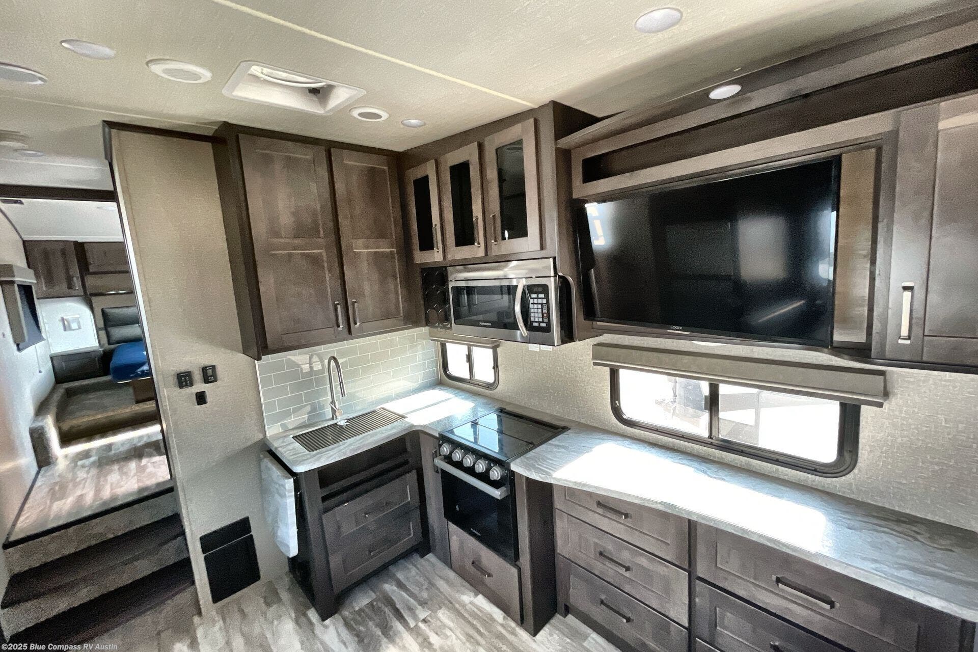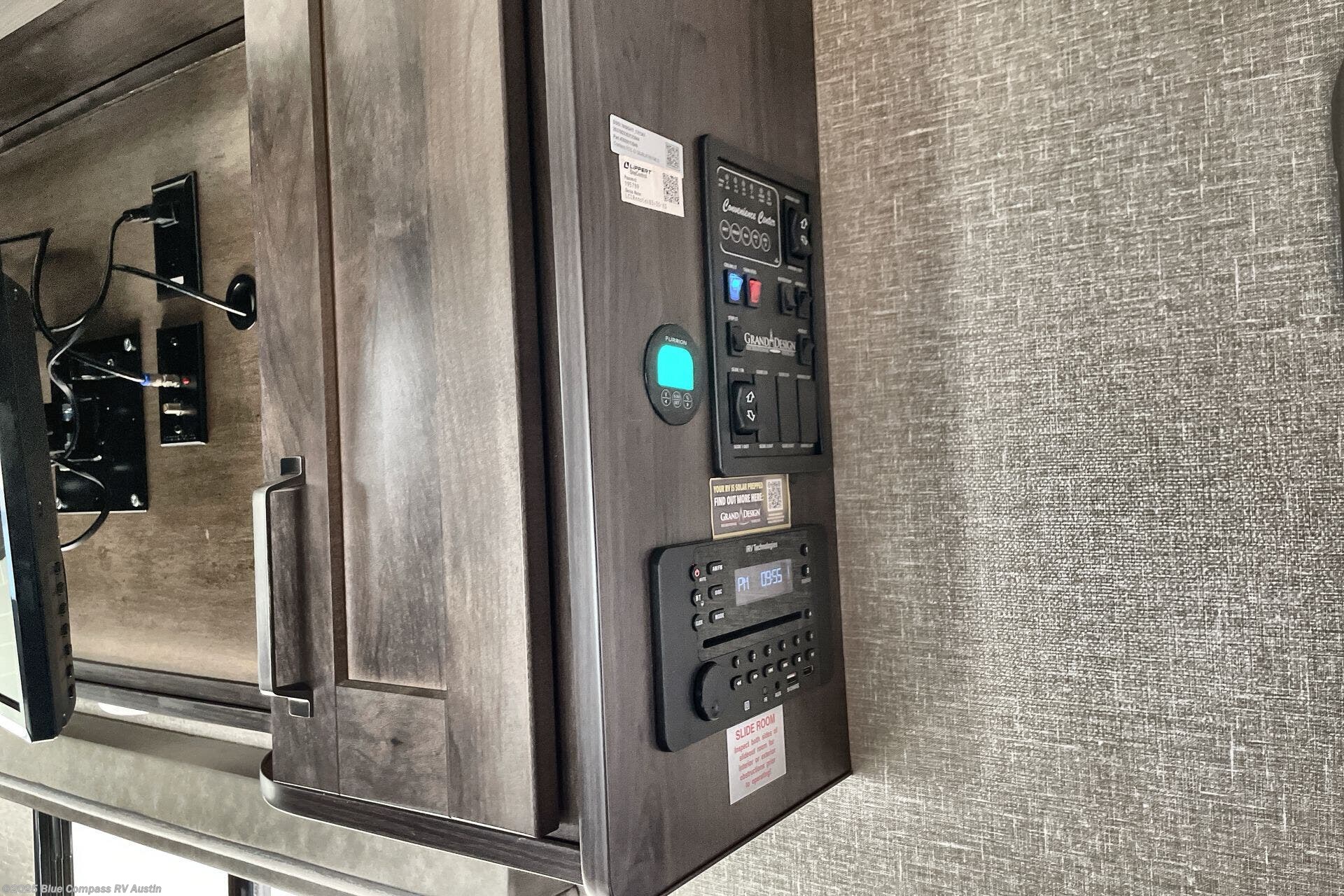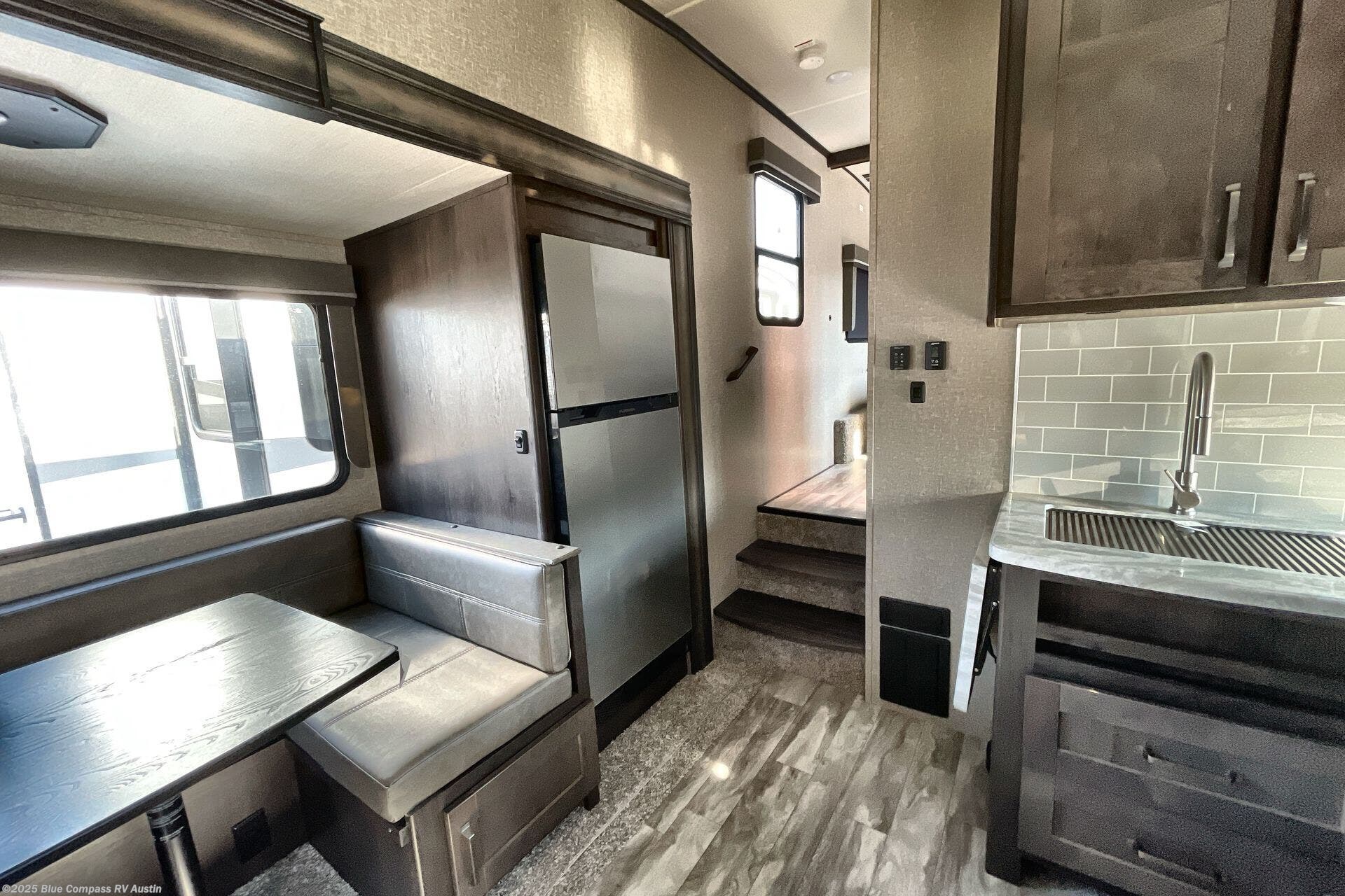 With any Reflection 150 Series fifth wheel by Grand Design, there is more available payload capacity and a broader range of half-ton trucks capable of towing this fifth wheel, and no slider hitch is needed thanks to the 90-degree turning radius which makes them short bed friendly and easier to tow. The mandatory Ultimate Power package provides a "One-Touch" automatic leveling system and a detachable power cord with LED light for easy setup, plus motion sensor pass-through lighting and entry lighting, and the Tire Linc TPMS will help you stay safe on the road. The interior offers residential luxury from the cabinetry and gunstock hardware plus the booth dinette to the residential-style window treatment. Make your refined decision today!