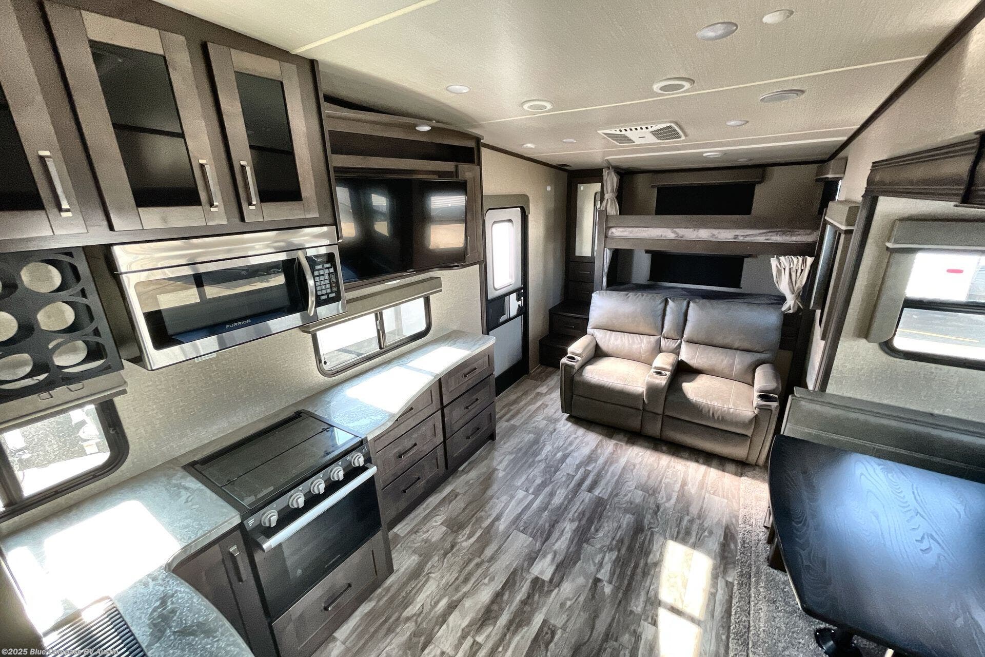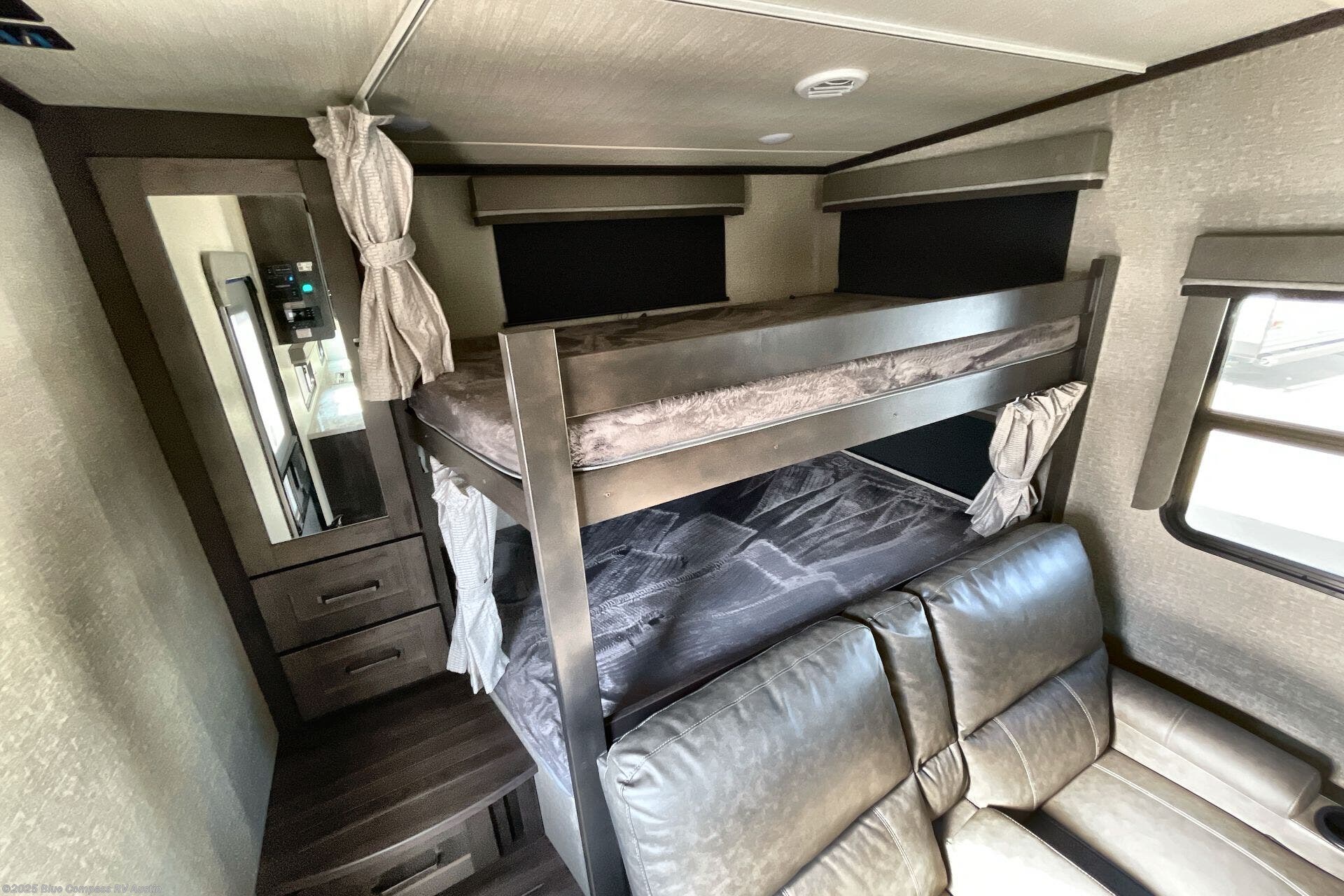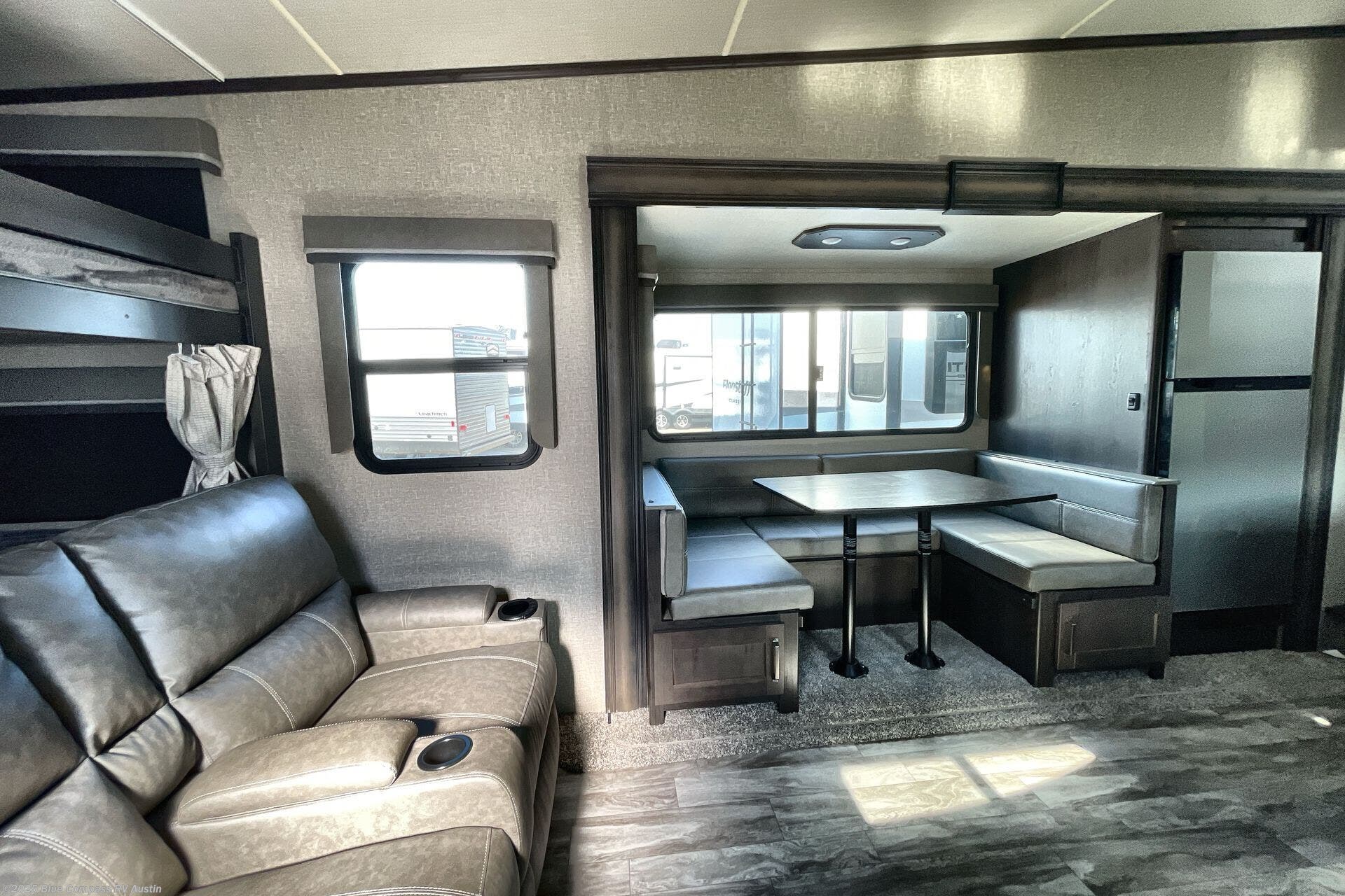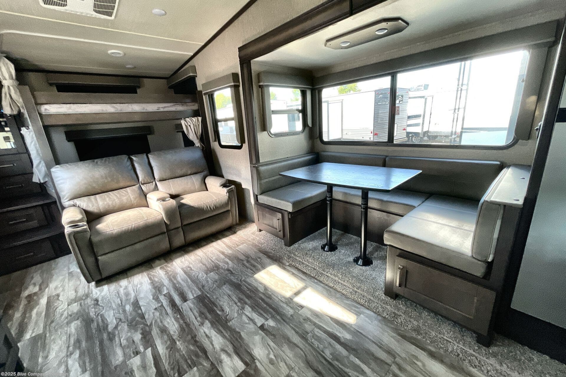 Get away from the hustle and bustle of the city every chance you get with this fifth wheel in tow! Once at your campsite, you can easily set up the single slide and the 20' electric awning and head out for a hike or relax on the U-shaped dinette and theatre seating while watching the 40" LED HDTV. The cook will love the L-shaped kitchen giving them their own space without interruptions and they will have full amenities to keep everyone fed. Everyone can take turns getting cleaned up in the walk-in shower in the full bathroom before calling it a night. The front bedroom offers a walk-around queen bed and plenty of storage, while the rear of this fifth wheel gives the kids or your friends 46" bunk beds to sleep on with their own storage near the step storage. And the U-shaped dinette offers extra sleeping space.