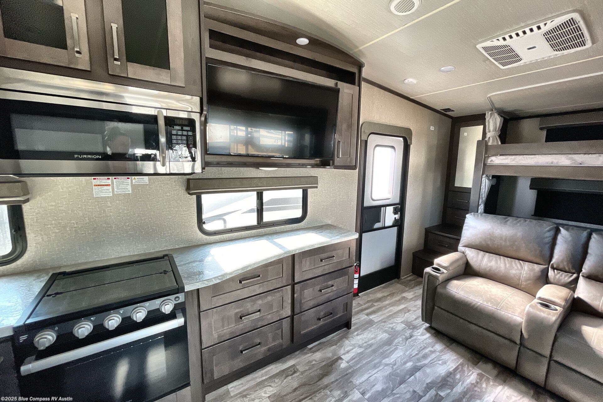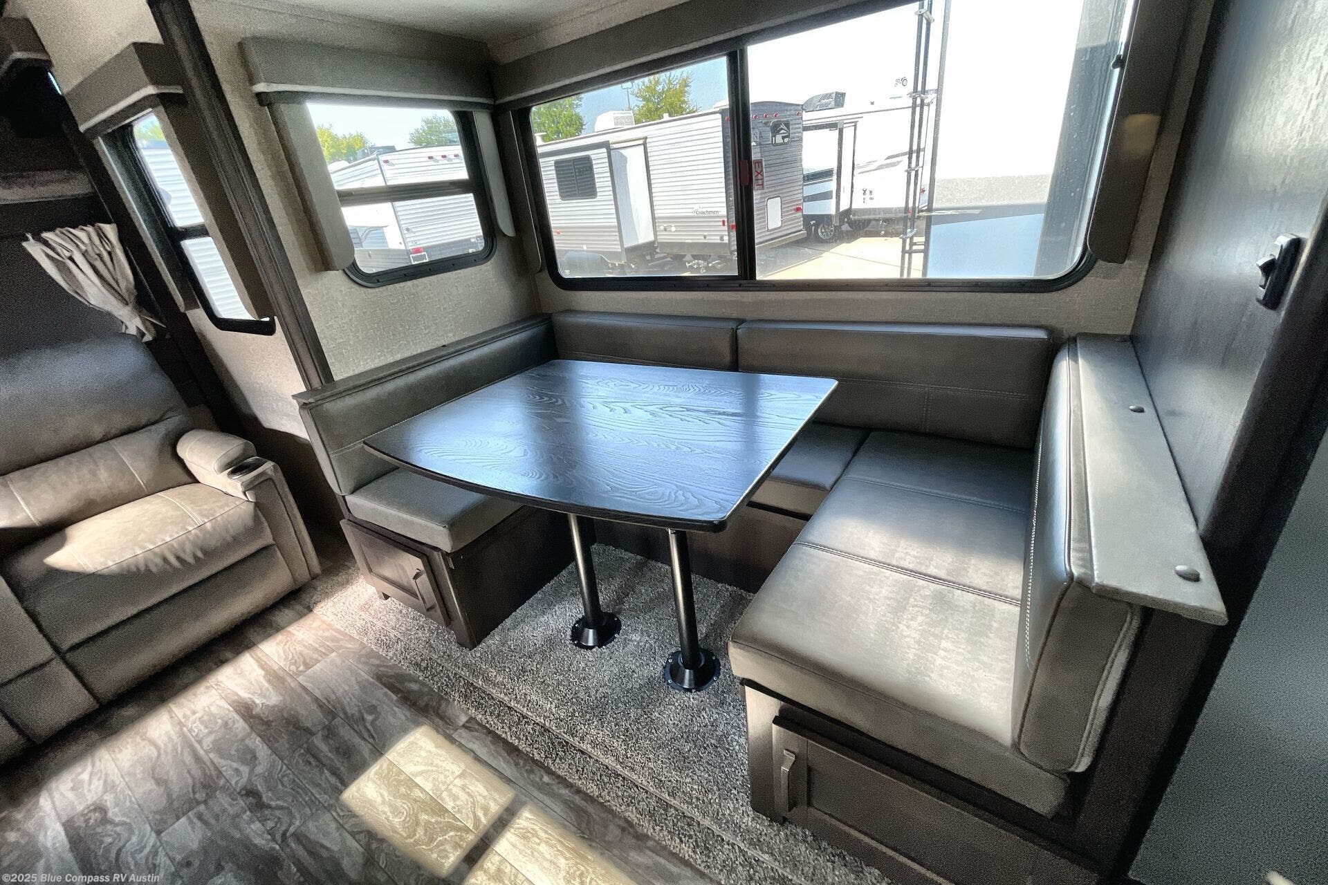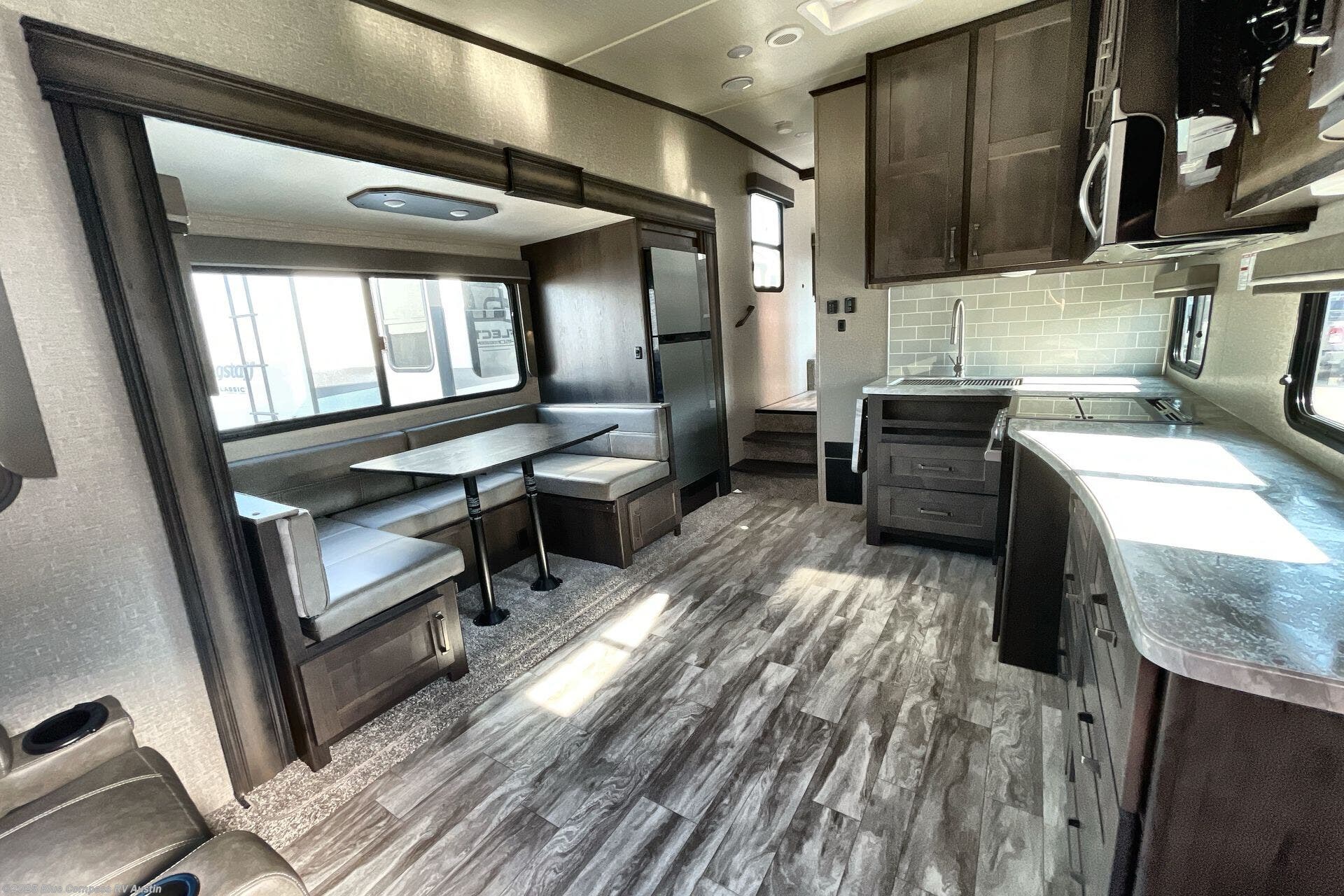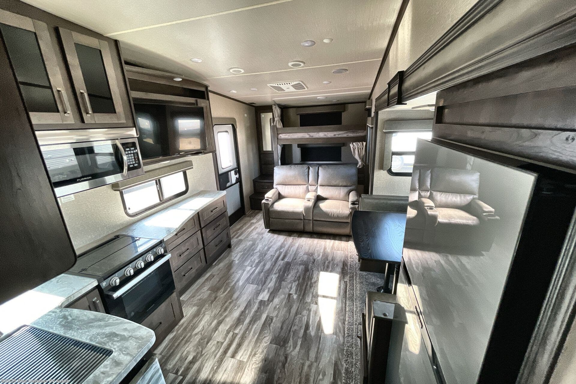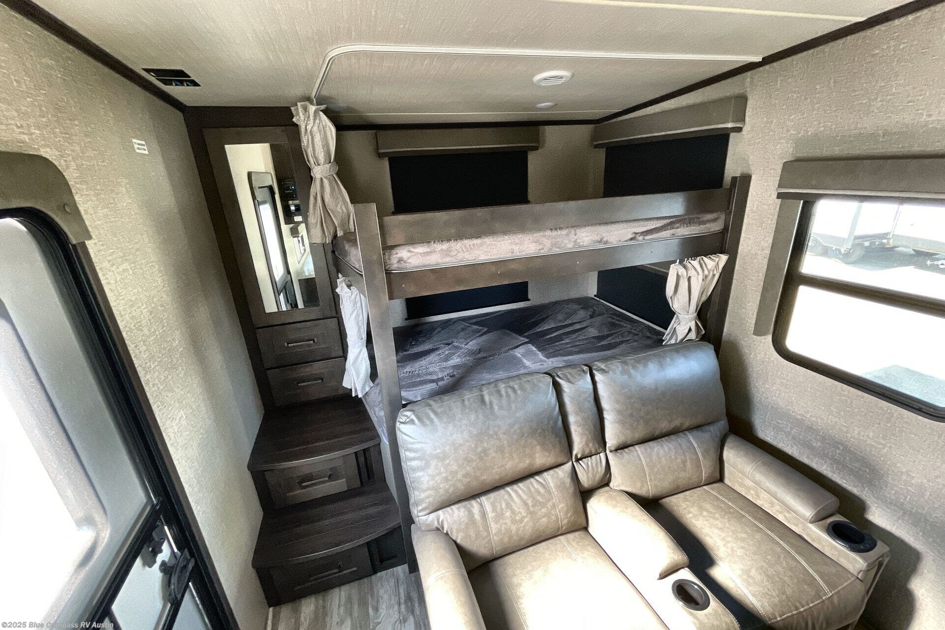 Get away from the hustle and bustle of the city every chance you get with this fifth wheel in tow! Once at your campsite, you can easily set up the single slide and the 20' electric awning and head out for a hike or relax on the U-shaped dinette and theatre seating while watching the 40" LED HDTV. The cook will love the L-shaped kitchen giving them their own space without interruptions and they will have full amenities to keep everyone fed. Everyone can take turns getting cleaned up in the walk-in shower in the full bathroom before calling it a night. The front bedroom offers a walk-around queen bed and plenty of storage, while the rear of this fifth wheel gives the kids or your friends 46" bunk beds to sleep on with their own storage near the step storage. And the U-shaped dinette offers extra sleeping space.