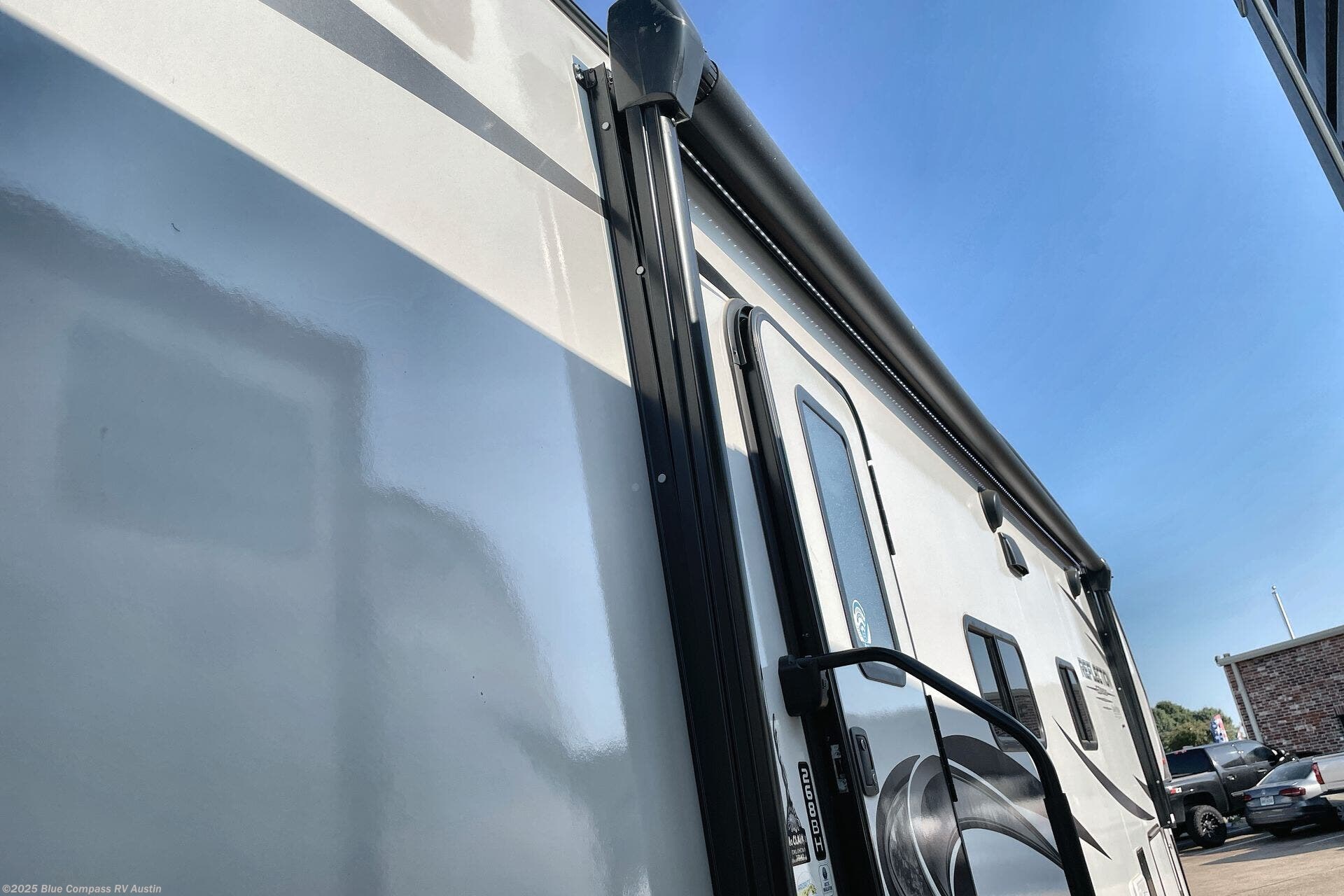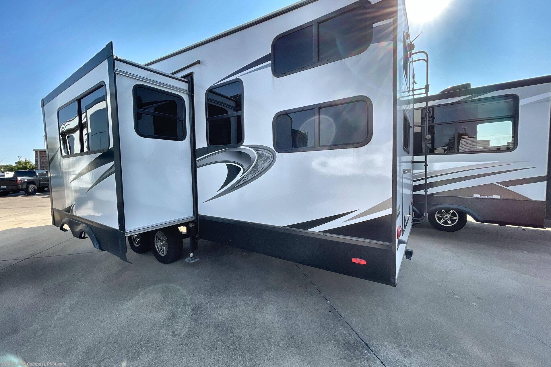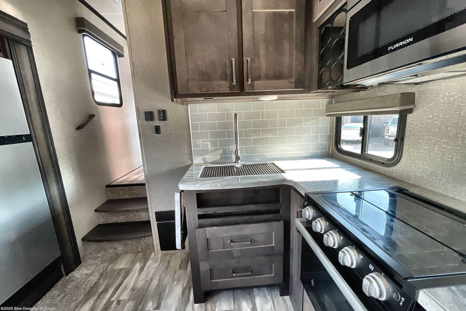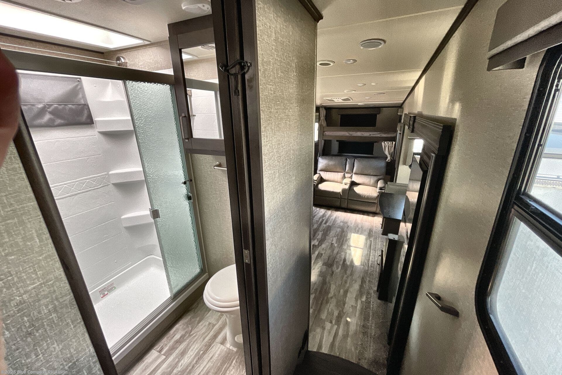 Get away from the hustle and bustle of the city every chance you get with this fifth wheel in tow! Once at your campsite, you can easily set up the single slide and the 20' electric awning and head out for a hike or relax on the U-shaped dinette and theatre seating while watching the 40" LED HDTV. The cook will love the L-shaped kitchen giving them their own space without interruptions and they will have full amenities to keep everyone fed. Everyone can take turns getting cleaned up in the walk-in shower in the full bathroom before calling it a night. The front bedroom offers a walk-around queen bed and plenty of storage, while the rear of this fifth wheel gives the kids or your friends 46" bunk beds to sleep on with their own storage near the step storage. And the U-shaped dinette offers extra sleeping space.