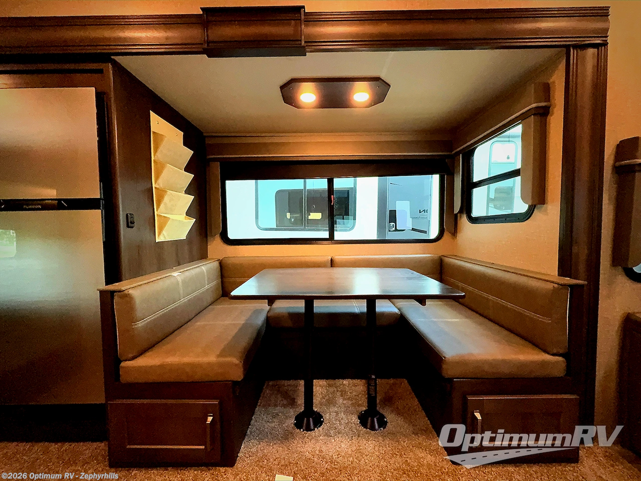 With any Reflection 150 Series fifth wheel by Grand Design, there is more available payload capacity and a broader range of half-ton trucks capable of towing this fifth wheel, and no slider hitch is needed thanks to the 90-degree turning radius which makes them short bed friendly and easier to tow. The mandatory Ultimate Power package provides a "One-Touch" automatic leveling system and a detachable power cord with LED light for easy setup, plus motion sensor pass-through lighting and entry lighting, and the Tire Linc TPMS will help you stay safe on the road. The interior offers residential luxury from the cabinetry and gunstock hardware plus the booth dinette to the residential-style window treatment. Make your refined decision today!