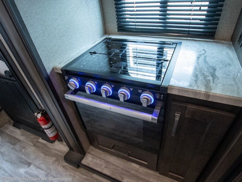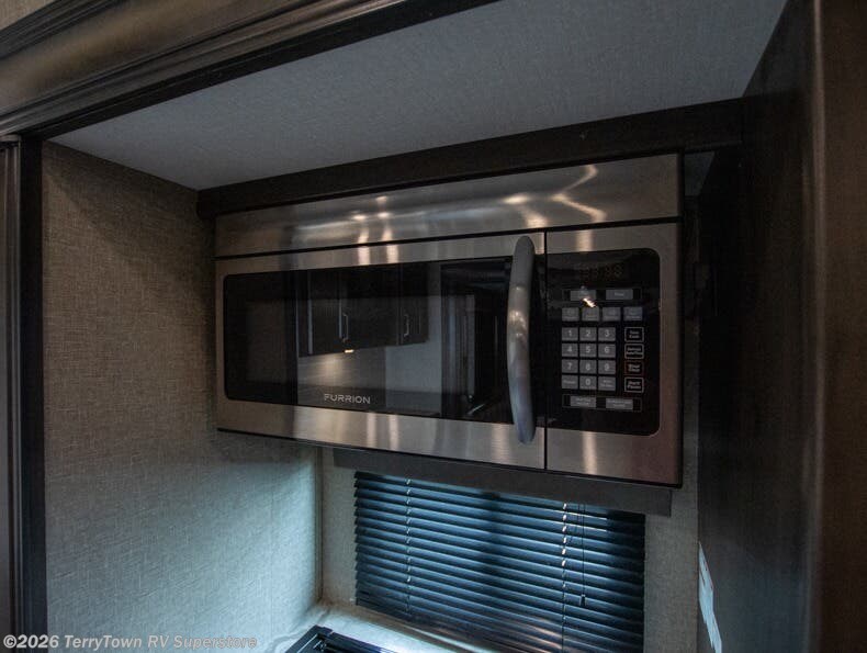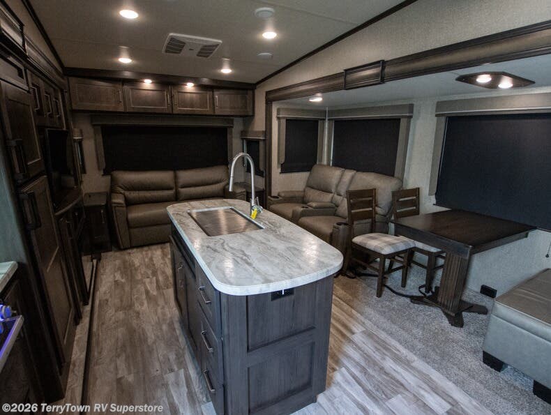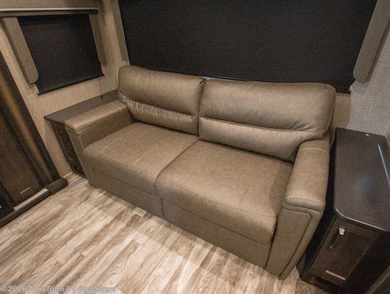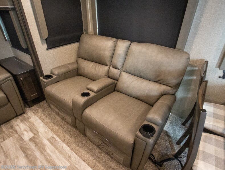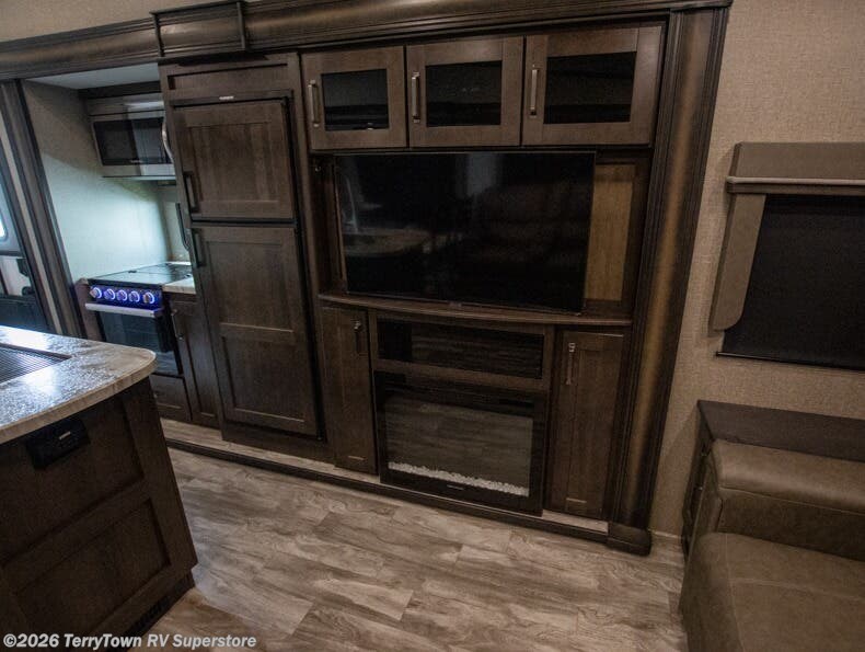 Get ready to enjoy the inside just as much as the outdoors when you have this fifth wheel at the campgrounds. The interior offers a spacious main living and kitchen area thanks to the opposing slides which make walking around the kitchen island easy. The hutch offers more counter and storage space to prepare and serve meals, plus bring extra dishes and such, and the 10 cu. ft. refrigerator will hold your leftovers plus some. Relax on the tri-fold sofa that offers extra sleeping space for guests, and you will love the theatre seats while watching the 40" LED HDTV with fireplace below. There is a full bathroom with a walk-in shower, and the front bedroom allows you to sleep like a queen!