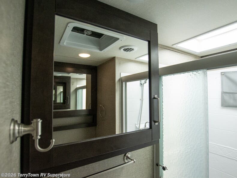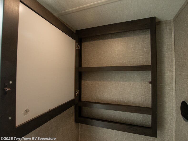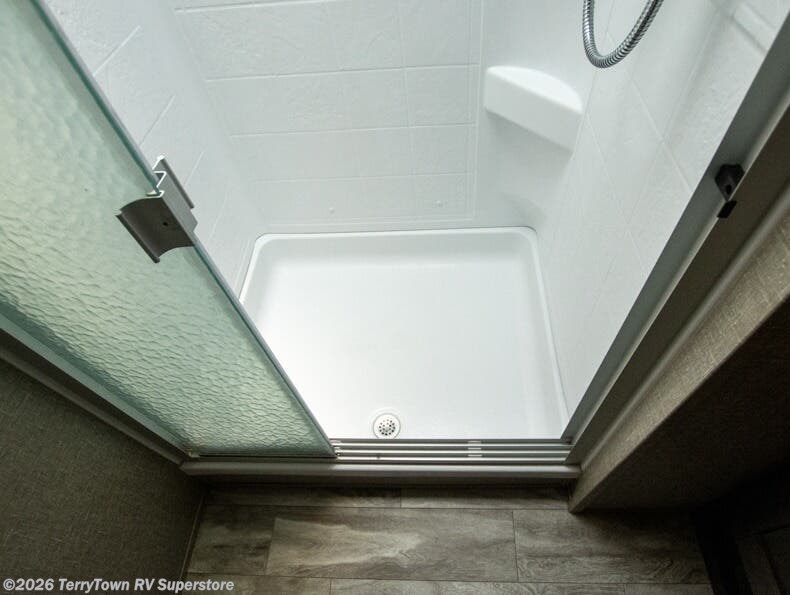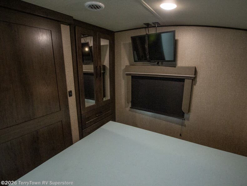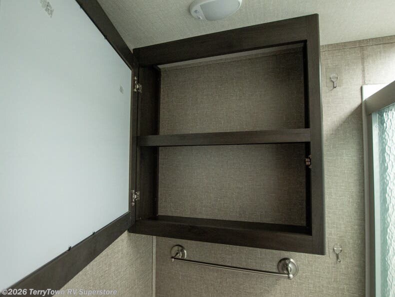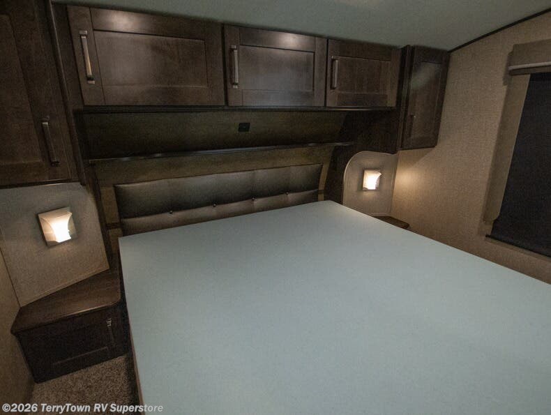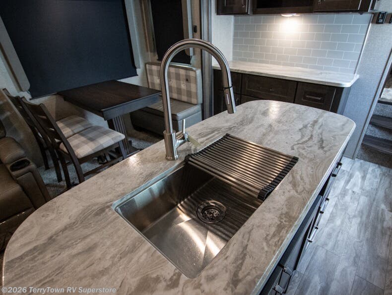 Get ready to enjoy the inside just as much as the outdoors when you have this fifth wheel at the campgrounds. The interior offers a spacious main living and kitchen area thanks to the opposing slides which make walking around the kitchen island easy. The hutch offers more counter and storage space to prepare and serve meals, plus bring extra dishes and such, and the 10 cu. ft. refrigerator will hold your leftovers plus some. Relax on the tri-fold sofa that offers extra sleeping space for guests, and you will love the theatre seats while watching the 40" LED HDTV with fireplace below. There is a full bathroom with a walk-in shower, and the front bedroom allows you to sleep like a queen!
