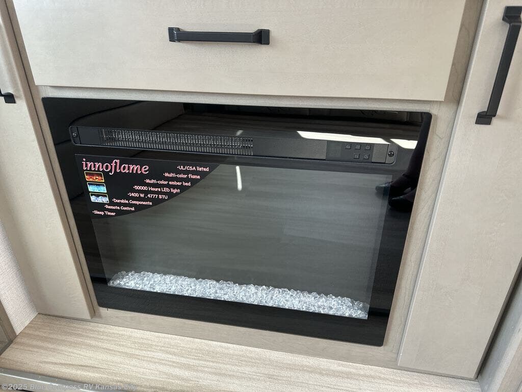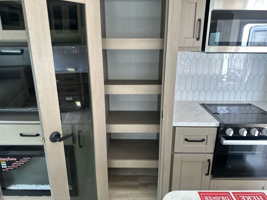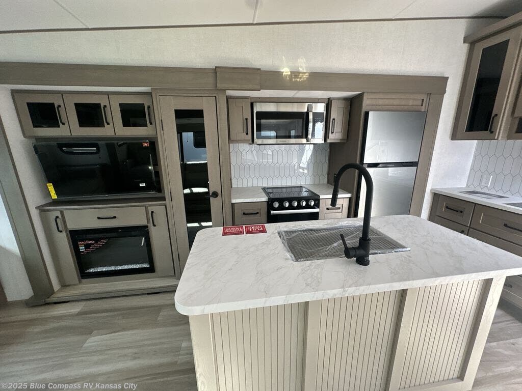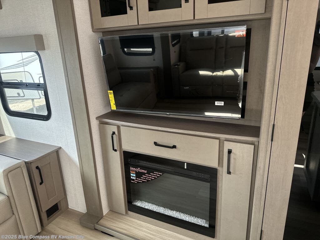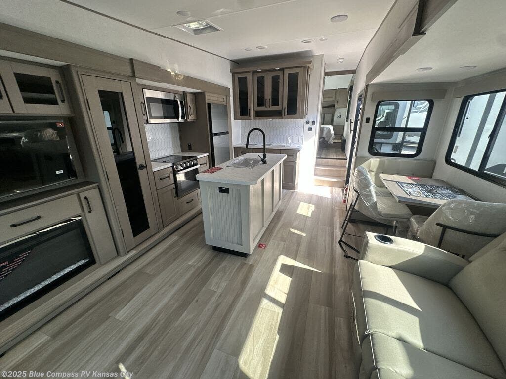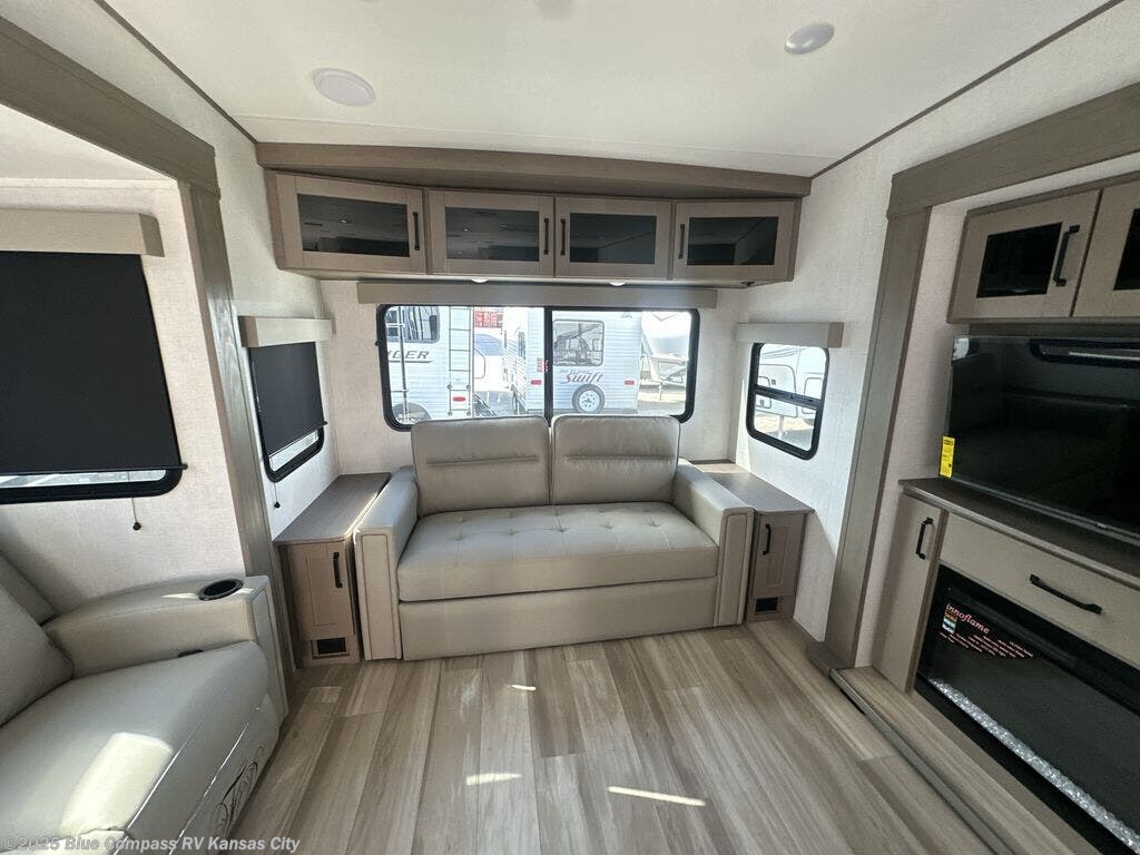 Get ready to enjoy everything the campgrounds and surrounding area has to offer when you are setup to camp in this fifth wheel! The two electric awnings offer protected areas creating outdoor living spaces, just grab your camping chairs from the unobstructed pass-through storage. And the interior offers a spacious living area and kitchen combination with two slide outs. You can sit on the tri-fold sofa or the dinette with an option for a free standing dinette. The hutch and kitchen island offer counter space to prepare and serve meals, and there is a large pantry for goodies. The 40" LED HDTV with fireplace below provides entertainment before bedtime or on a rainy day. And the front bedroom offers privacy, a walk-around queen bed, storage, and it is next to the full bathroom which is just a few steps down the hallway.
