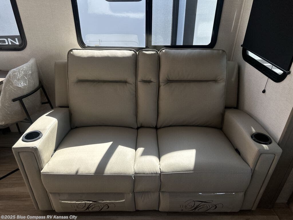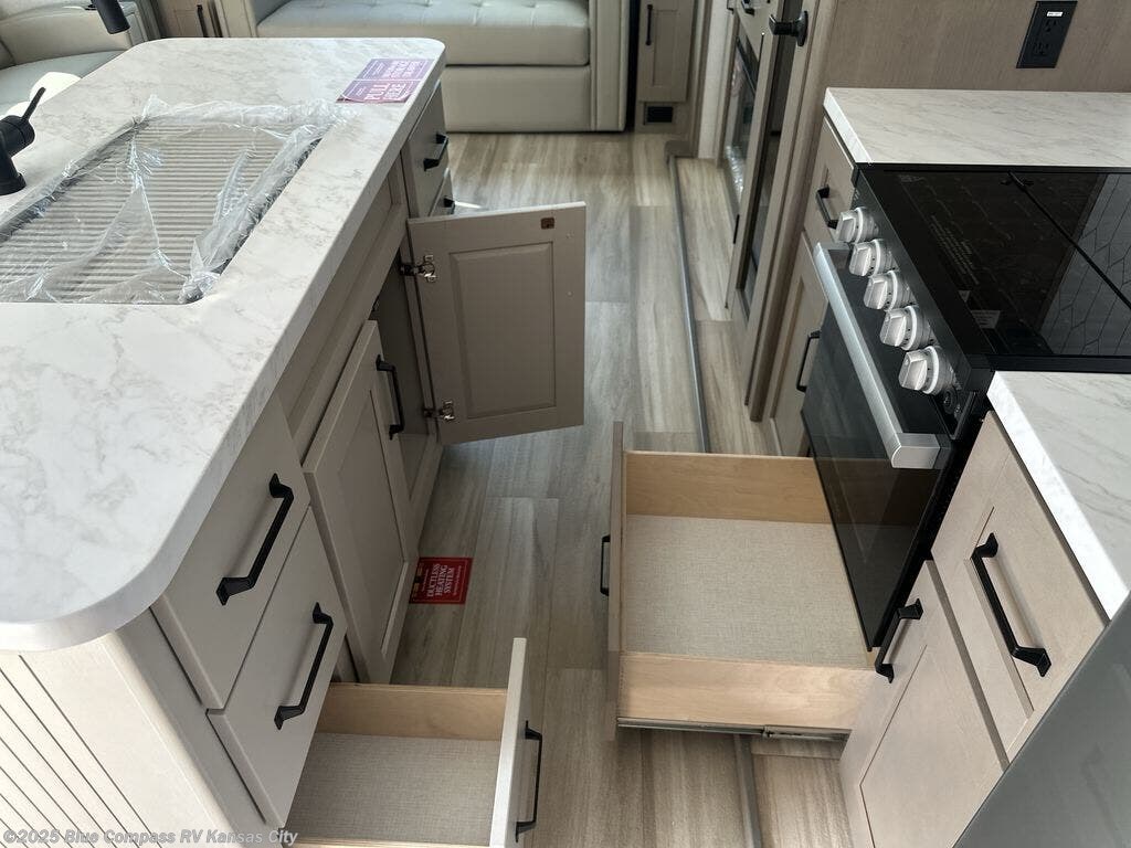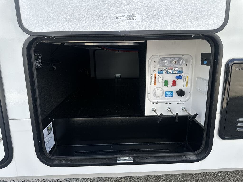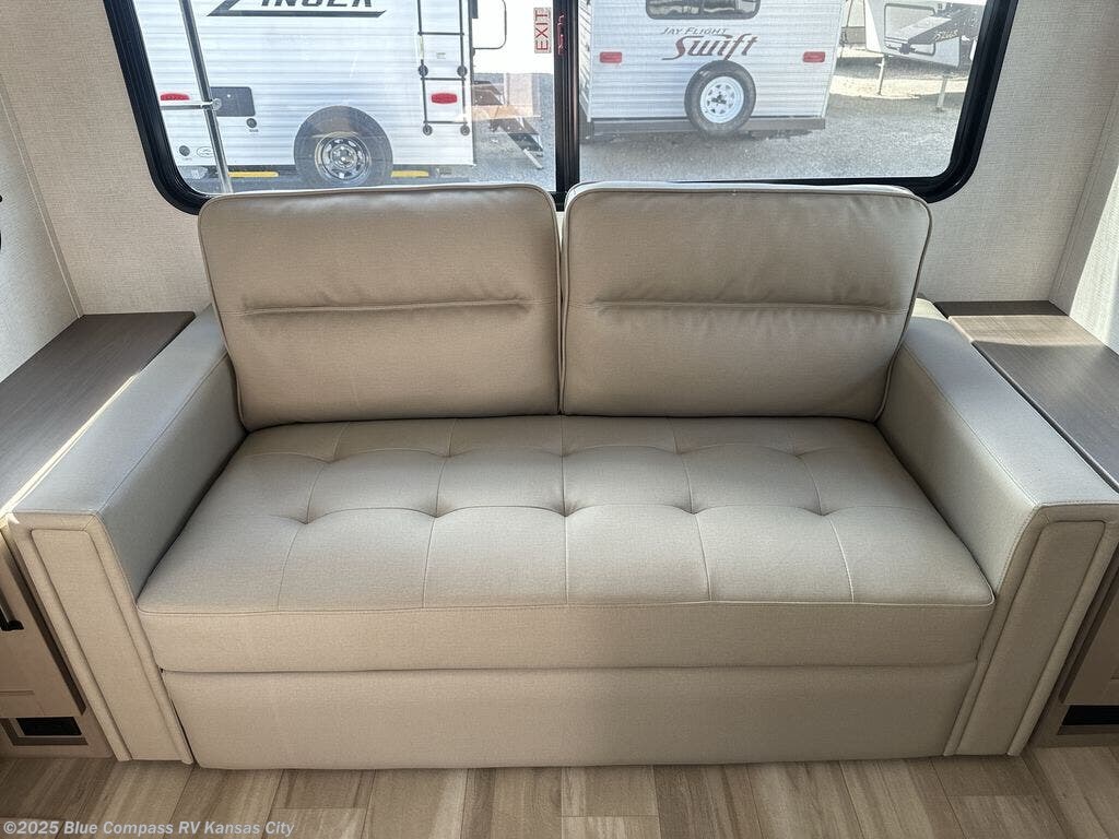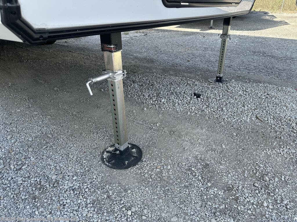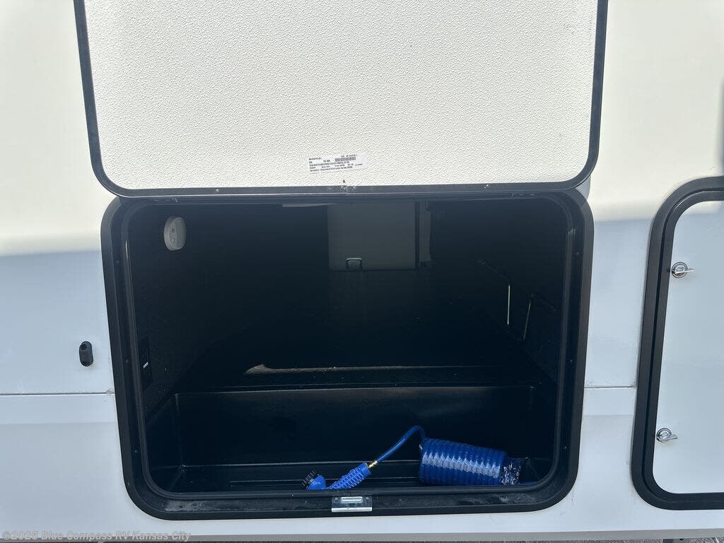 Get ready to enjoy everything the campgrounds and surrounding area has to offer when you are setup to camp in this fifth wheel! The two electric awnings offer protected areas creating outdoor living spaces, just grab your camping chairs from the unobstructed pass-through storage. And the interior offers a spacious living area and kitchen combination with two slide outs. You can sit on the tri-fold sofa or the dinette with an option for a free standing dinette. The hutch and kitchen island offer counter space to prepare and serve meals, and there is a large pantry for goodies. The 40" LED HDTV with fireplace below provides entertainment before bedtime or on a rainy day. And the front bedroom offers privacy, a walk-around queen bed, storage, and it is next to the full bathroom which is just a few steps down the hallway.