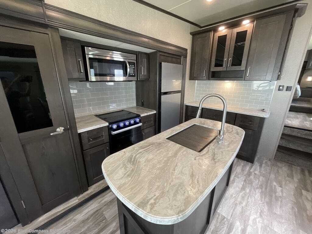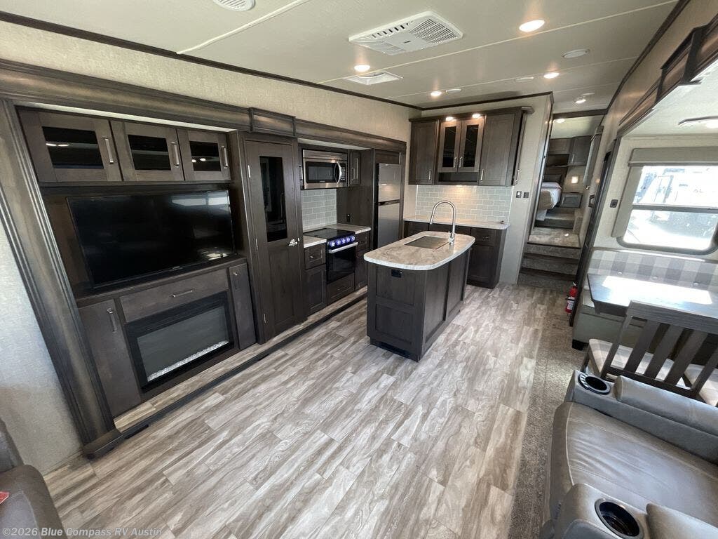 Get ready to enjoy everything the campgrounds and surrounding area has to offer when you are setup to camp in this fifth wheel! The two electric awnings offer protected areas creating outdoor living spaces, just grab your camping chairs from the unobstructed pass-through storage. And the interior offers a spacious living area and kitchen combination with two slide outs. You can sit on the tri-fold sofa or the dinette with an option for a free standing dinette. The hutch and kitchen island offer counter space to prepare and serve meals, and there is a large pantry for goodies. The 40" LED HDTV with fireplace below provides entertainment before bedtime or on a rainy day. And the front bedroom offers privacy, a walk-around queen bed, storage, and it is next to the full bathroom which is just a few steps down the hallway.
