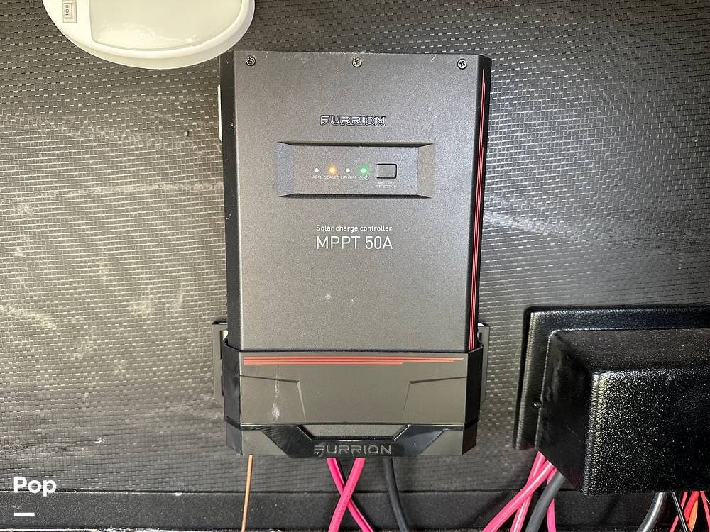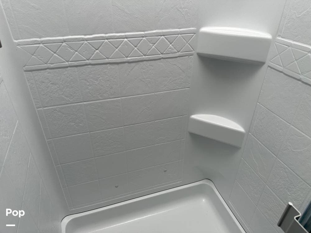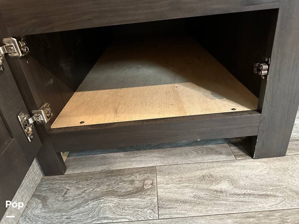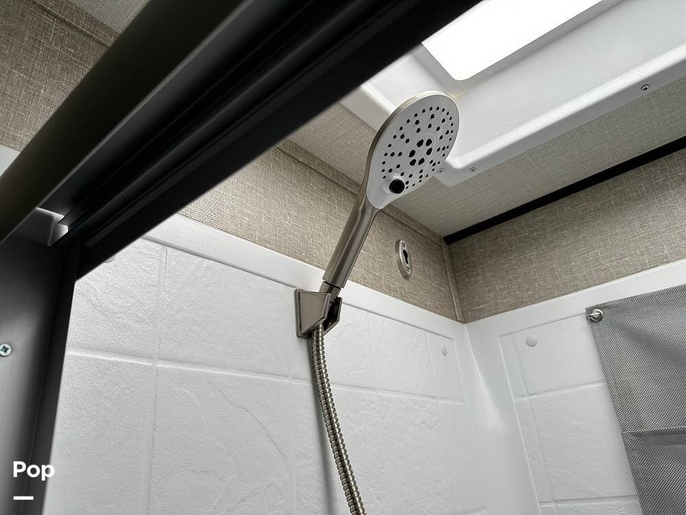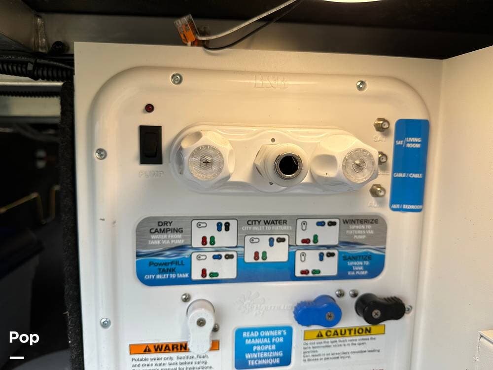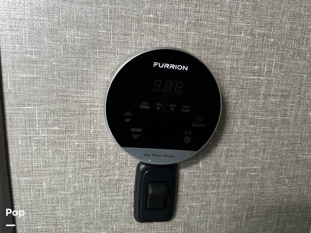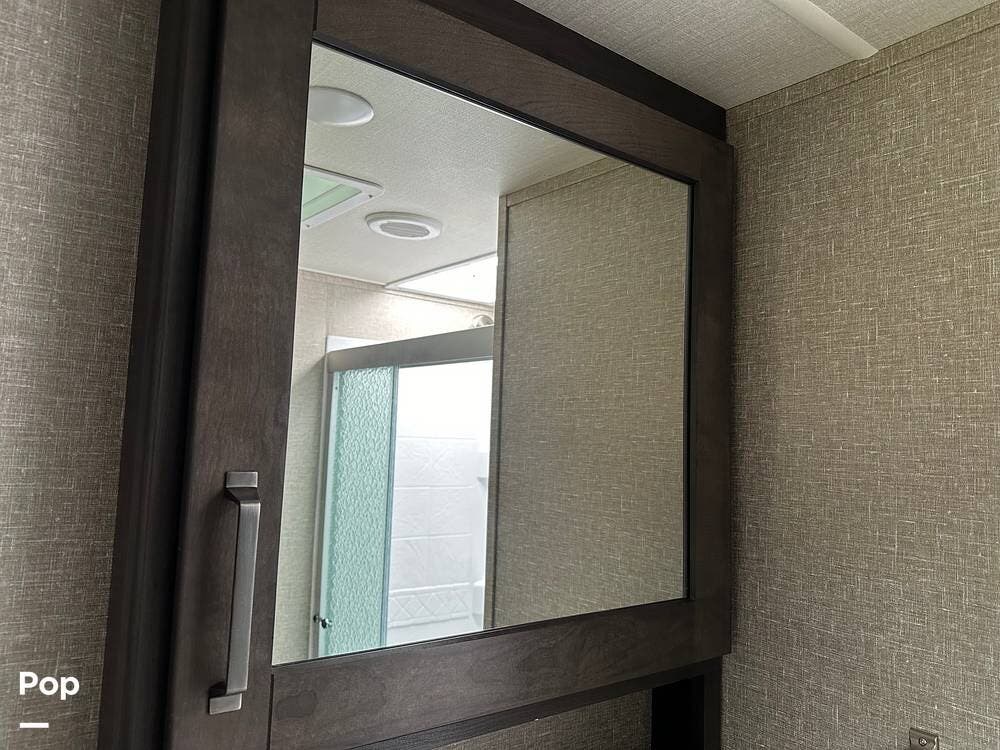 The bathroom has a large shower, sink with vanity, medicine cabinet, and extra cabinet above the toilet. It also has a Furrion water heater control center.