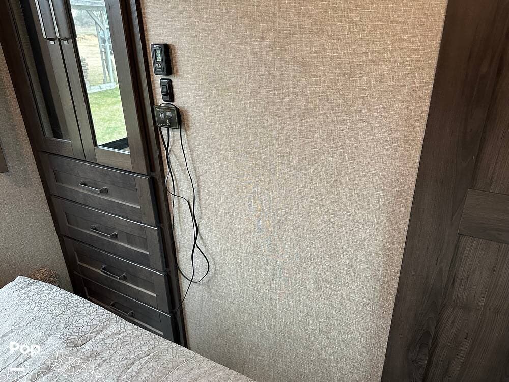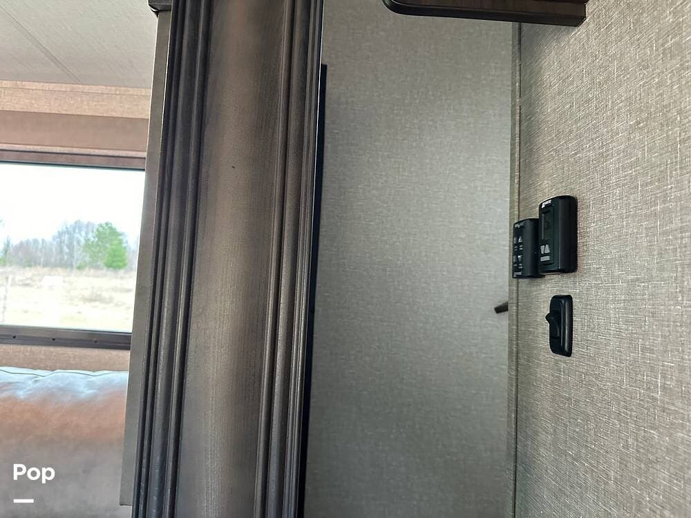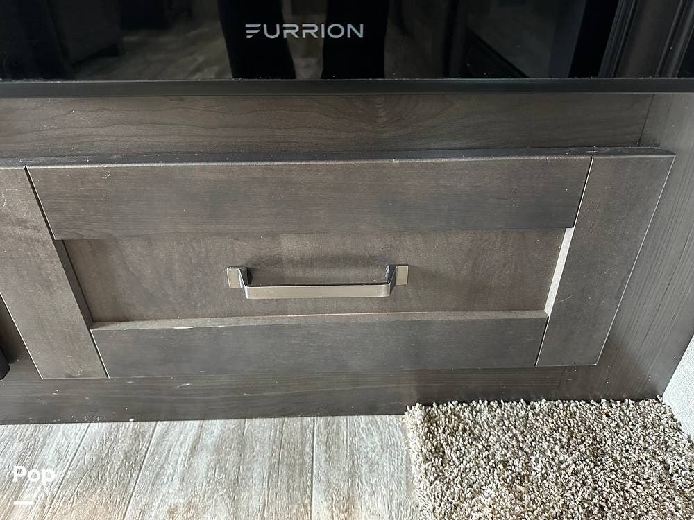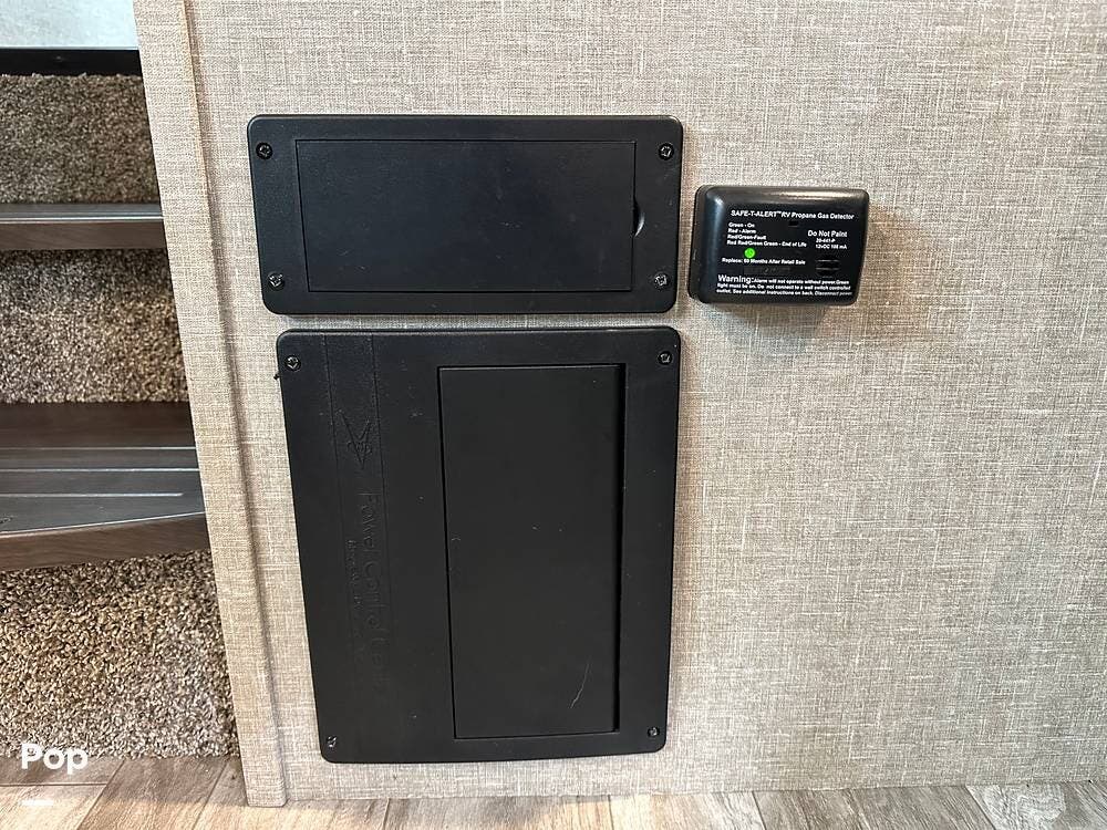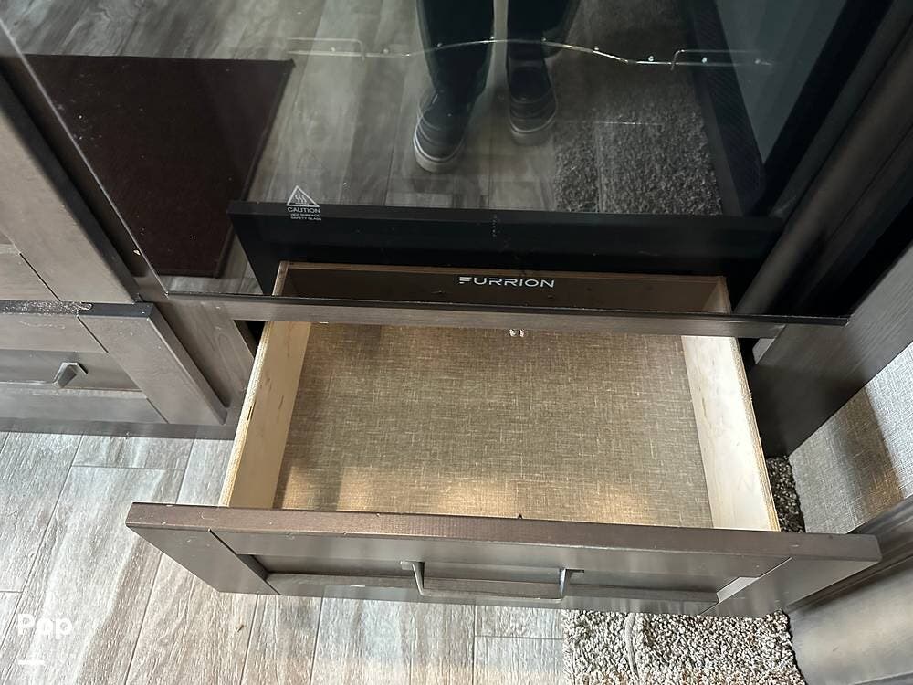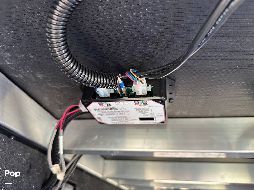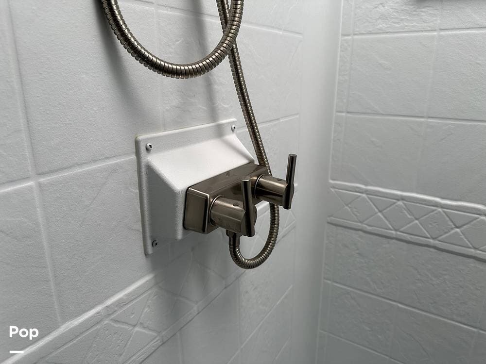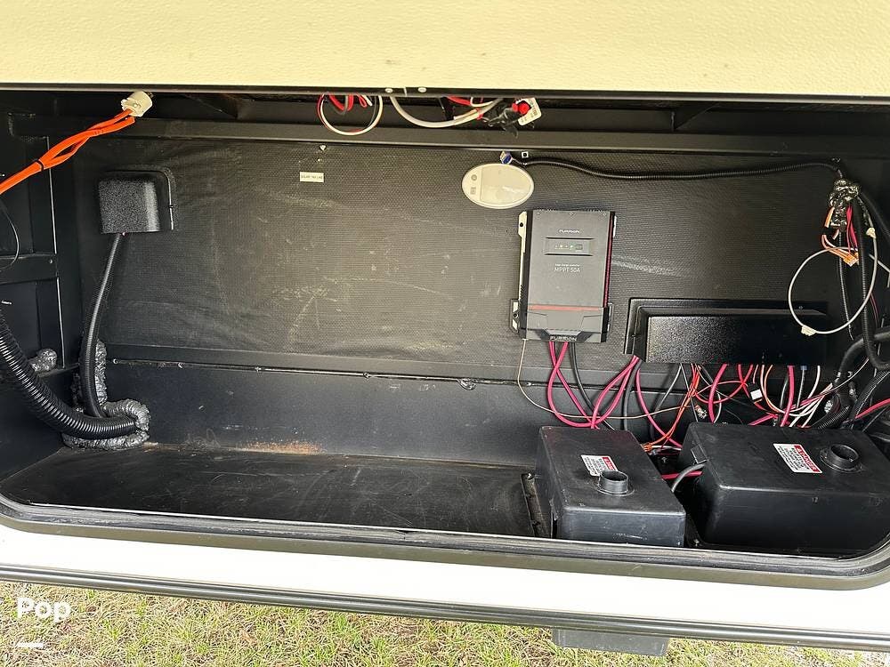 The bathroom has a large shower, sink with vanity, medicine cabinet, and extra cabinet above the toilet. It also has a Furrion water heater control center.