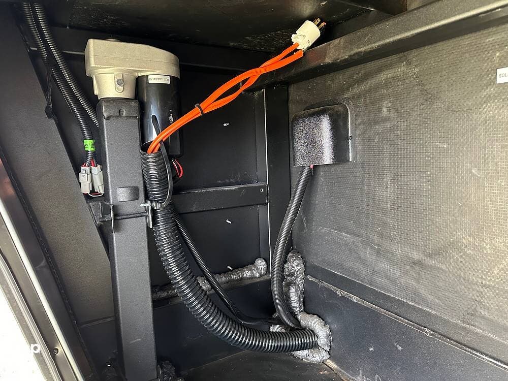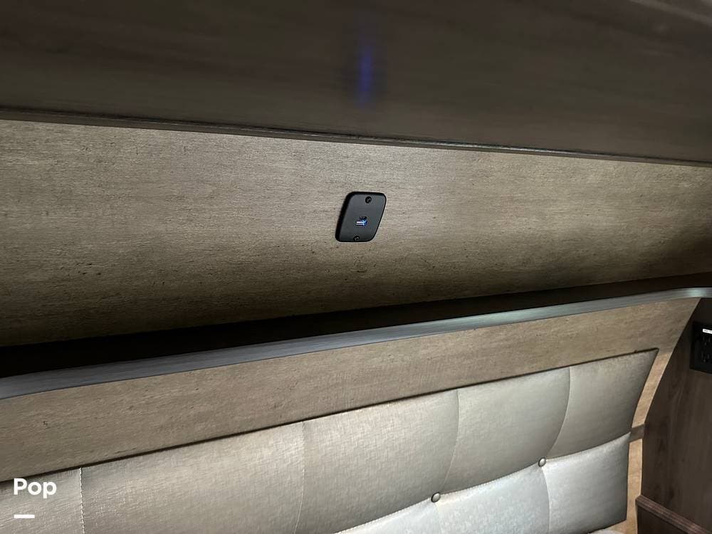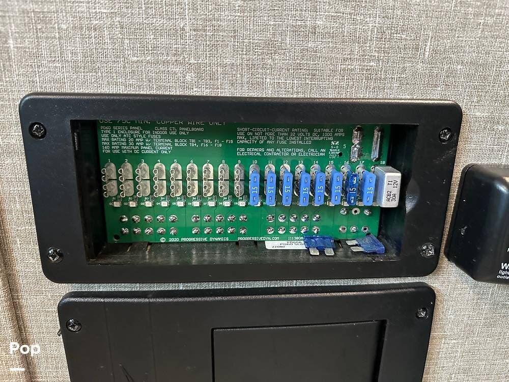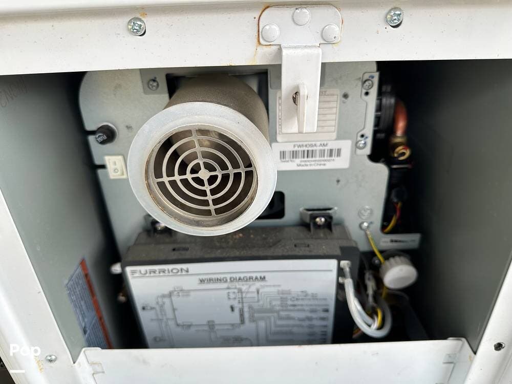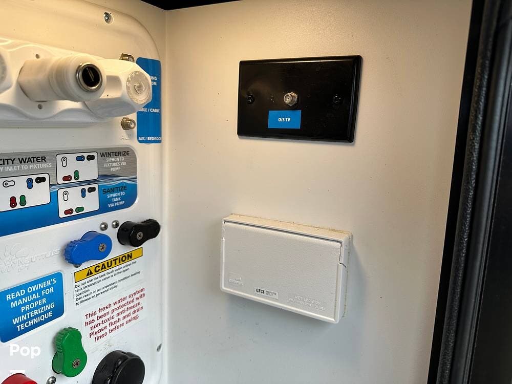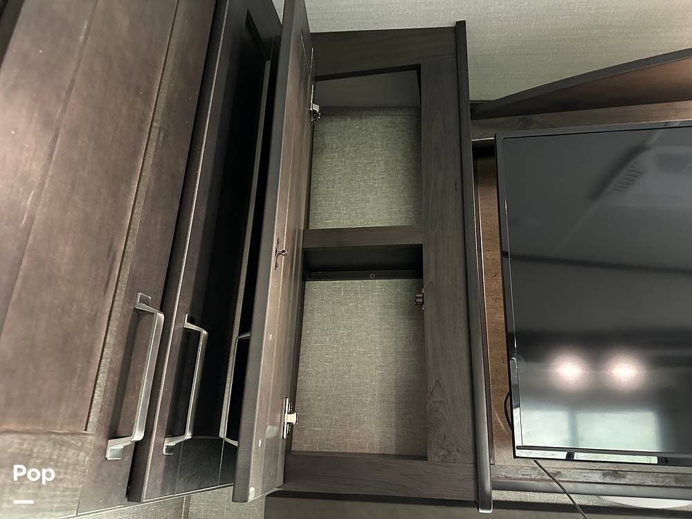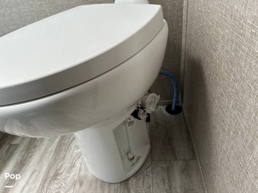 The bathroom has a large shower, sink with vanity, medicine cabinet, and extra cabinet above the toilet. It also has a Furrion water heater control center.
