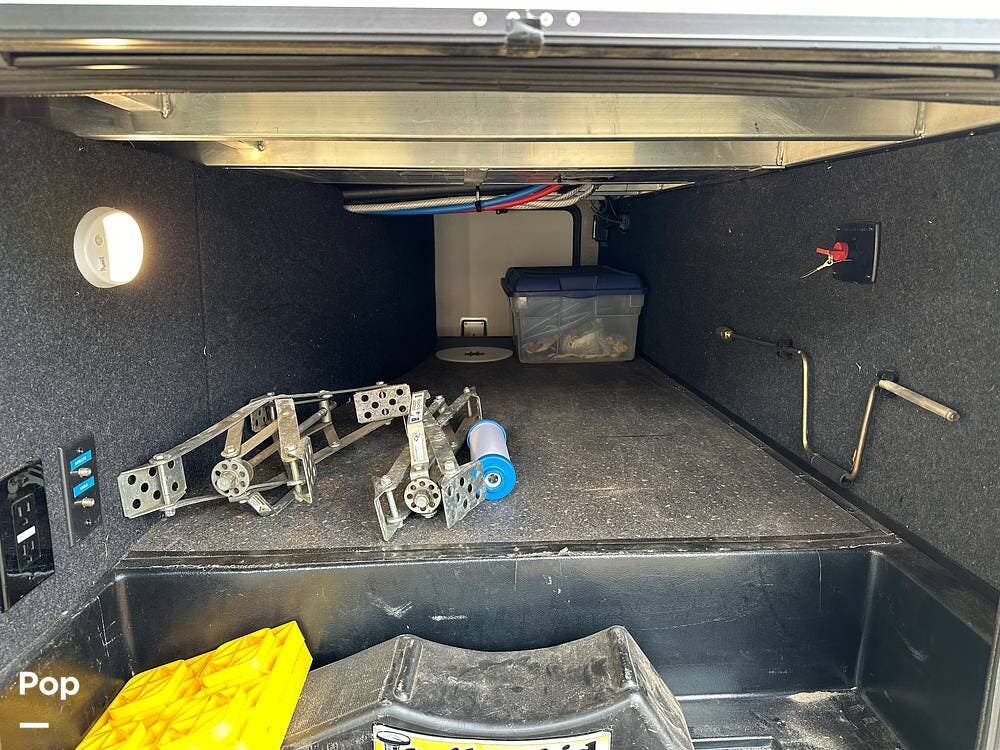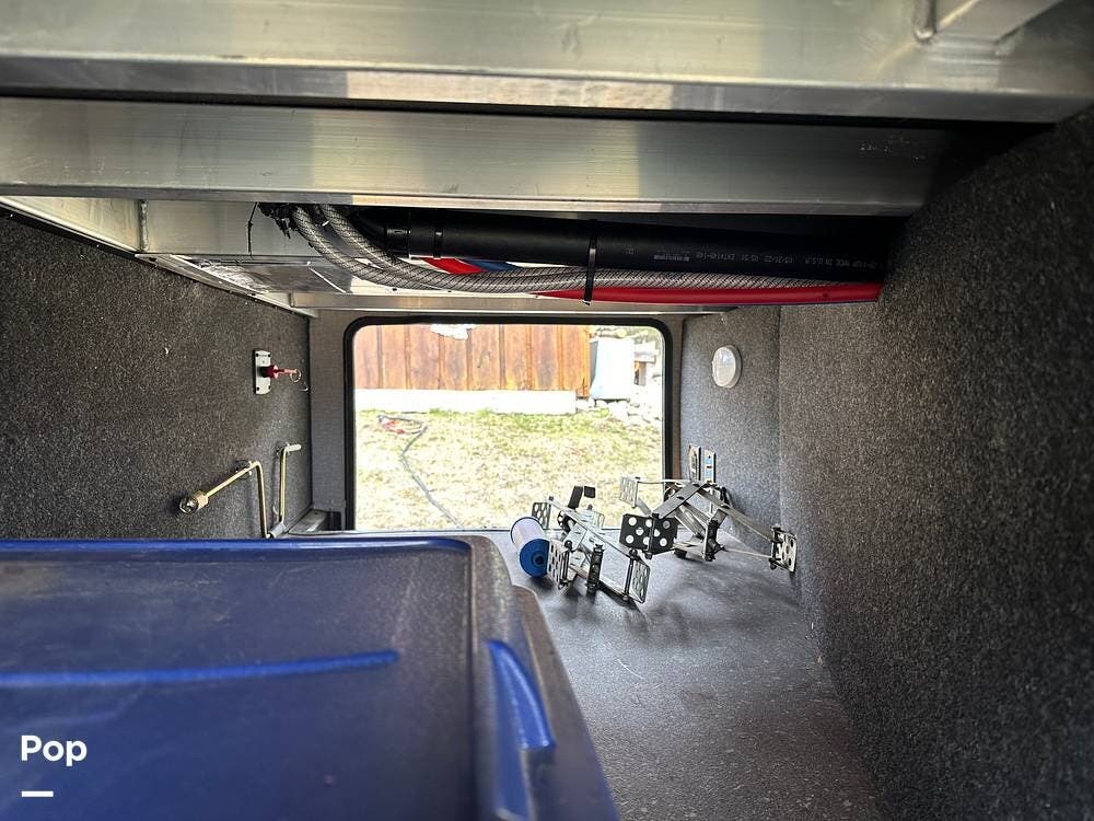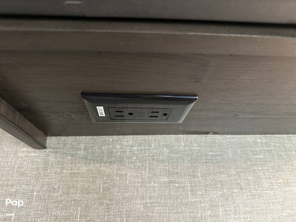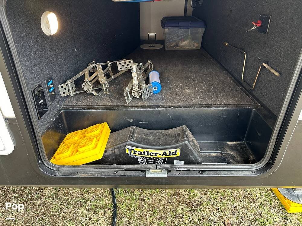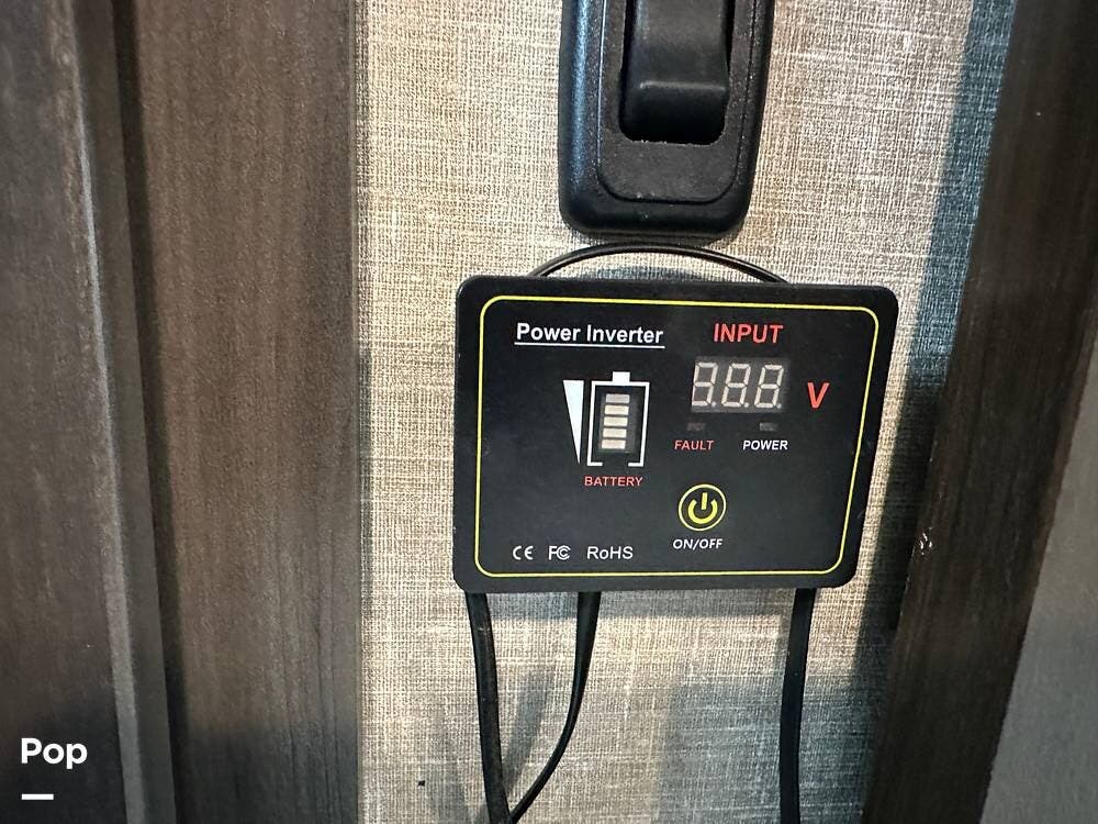 There is a large pass-through storage area, electric jacks, a docking station, and a large patio awning for shade. The roof has a solar panel, and the interior is insulated for camping year-round.