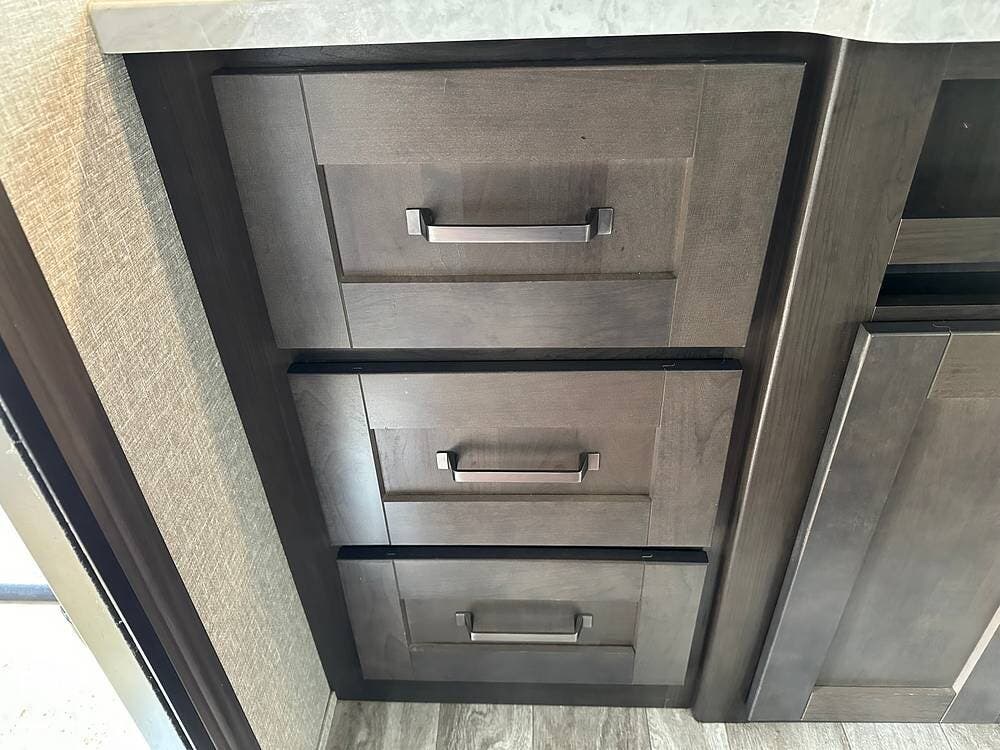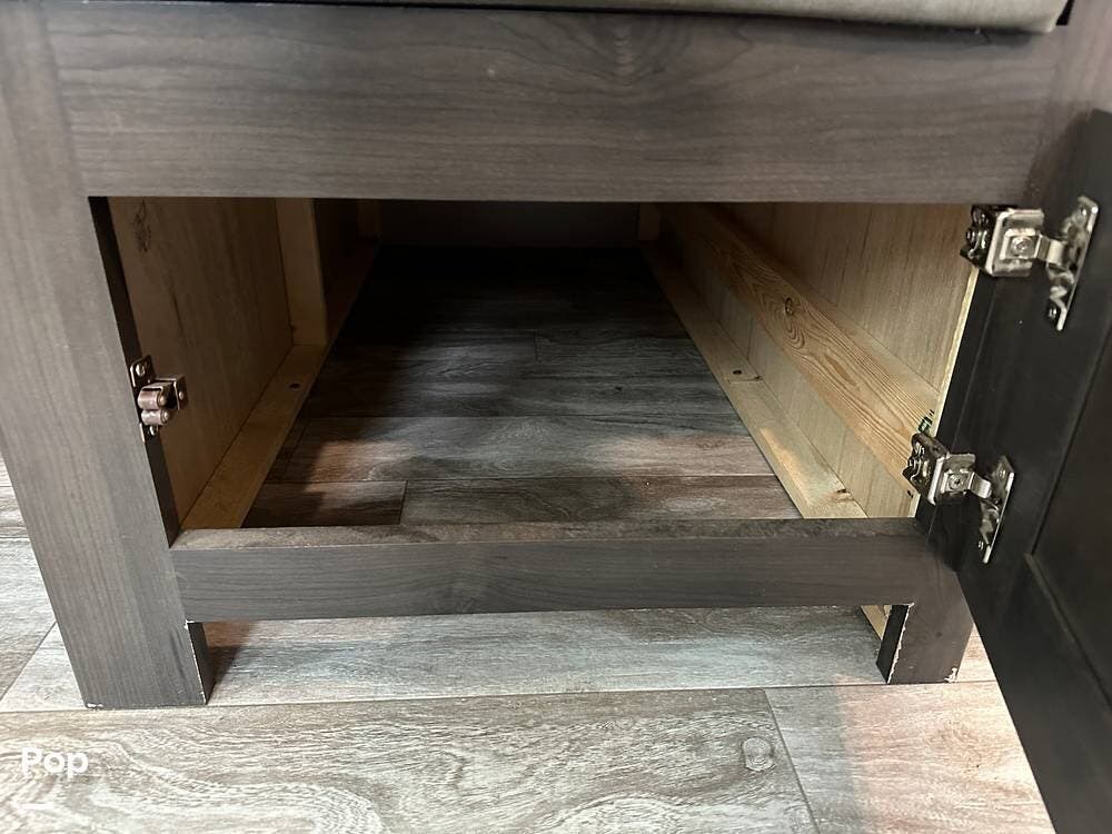 Spacious living area with theater seating, bench dining area, and plenty of storage throughout. Buffet area with drawers and shelving.
