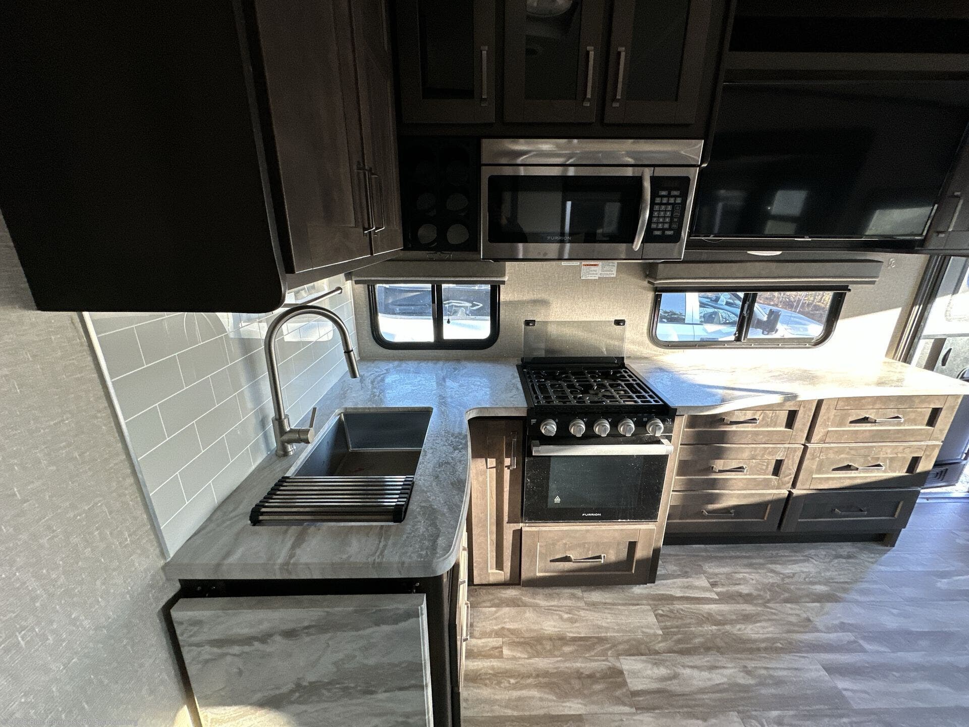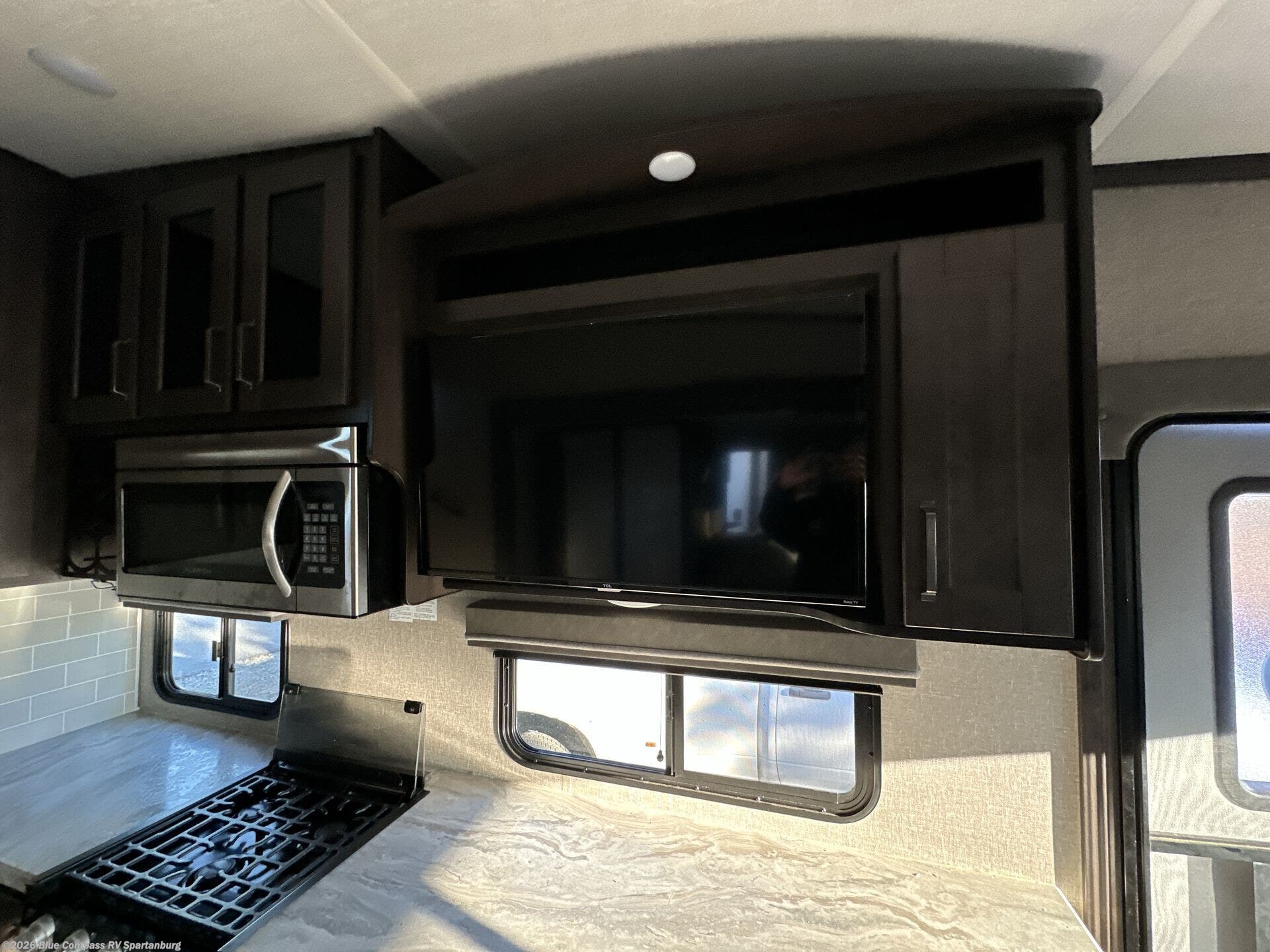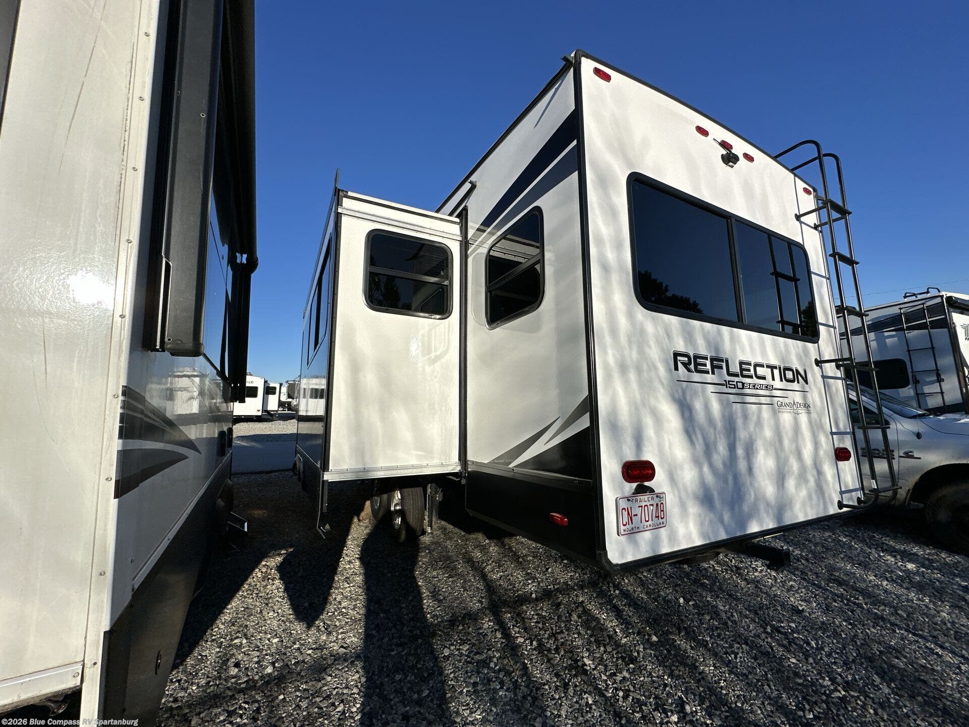 With any Reflection 150 Series fifth wheel by Grand Design, there is more available payload capacity and a broader range of half-ton trucks capable of towing this fifth wheel, and no slider hitch is needed thanks to the 90-degree turning radius which makes them short bed friendly and easier to tow. The mandatory Ultimate Power package provides a "One-Touch" automatic leveling system and a detachable power cord with LED light for easy setup, plus motion sensor pass-through lighting and entry lighting, and the Tire Linc TPMS will help you stay safe on the road. The interior offers residential luxury from the cabinetry and gunstock hardware plus the booth dinette to the residential-style window treatment. Make your refined decision today!