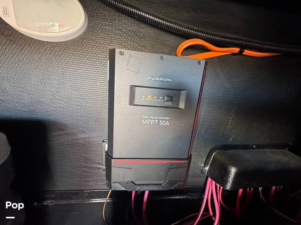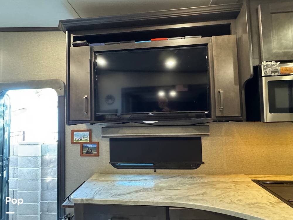 This model comes with a built-in entertainment system, including a large TV and sound system that can be enjoyed from both the living area and the outdoor patio space. There is a solar panel to trickle charge the batteries.