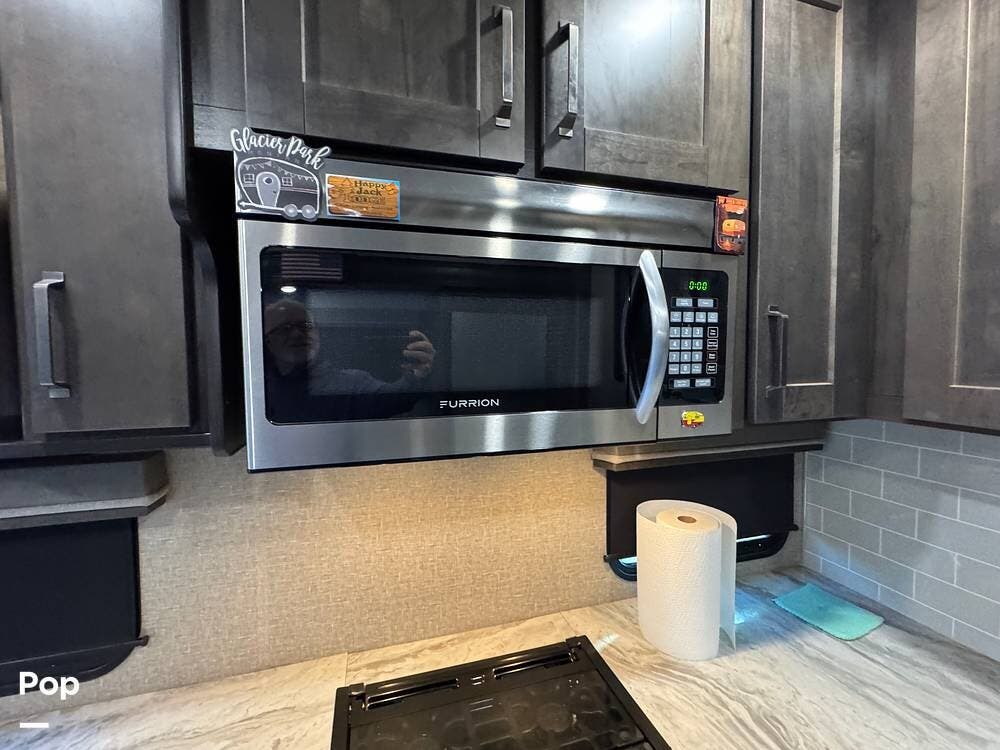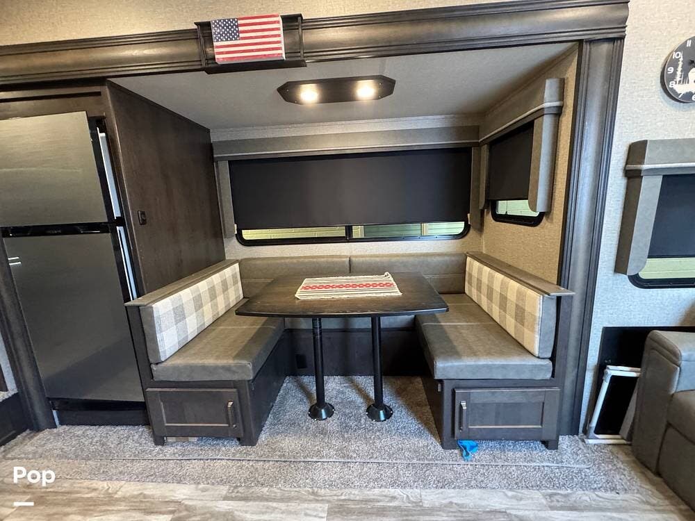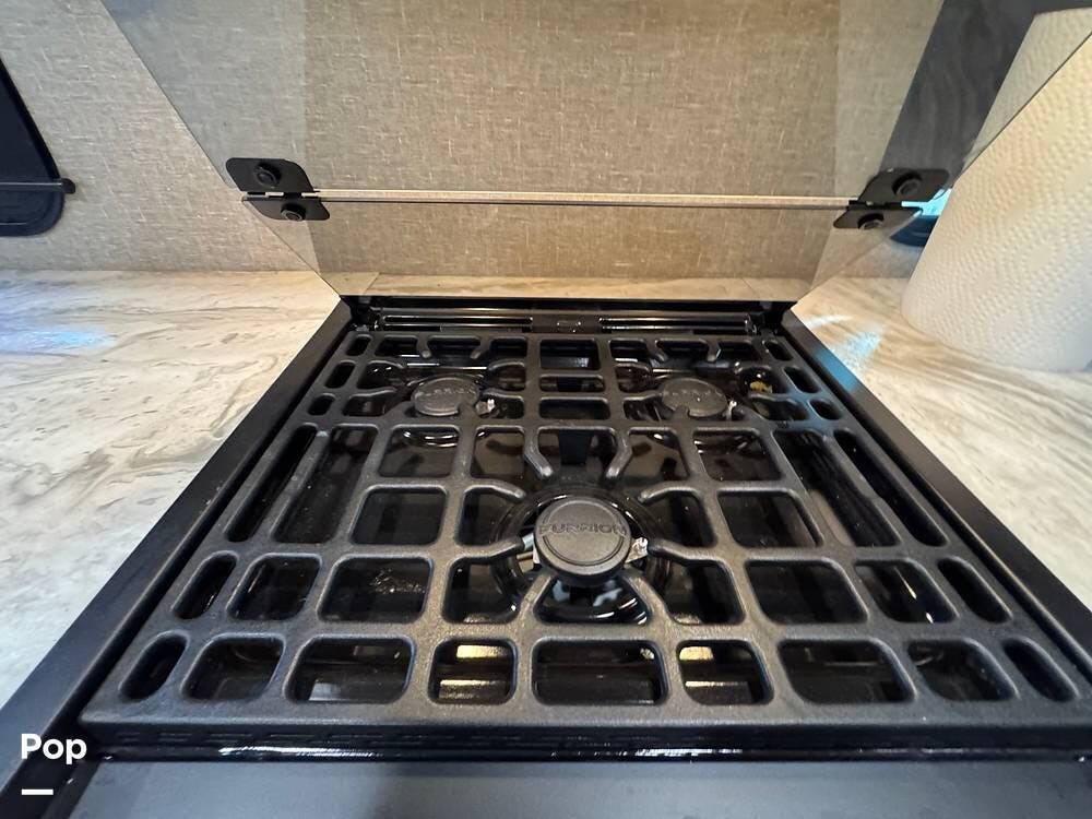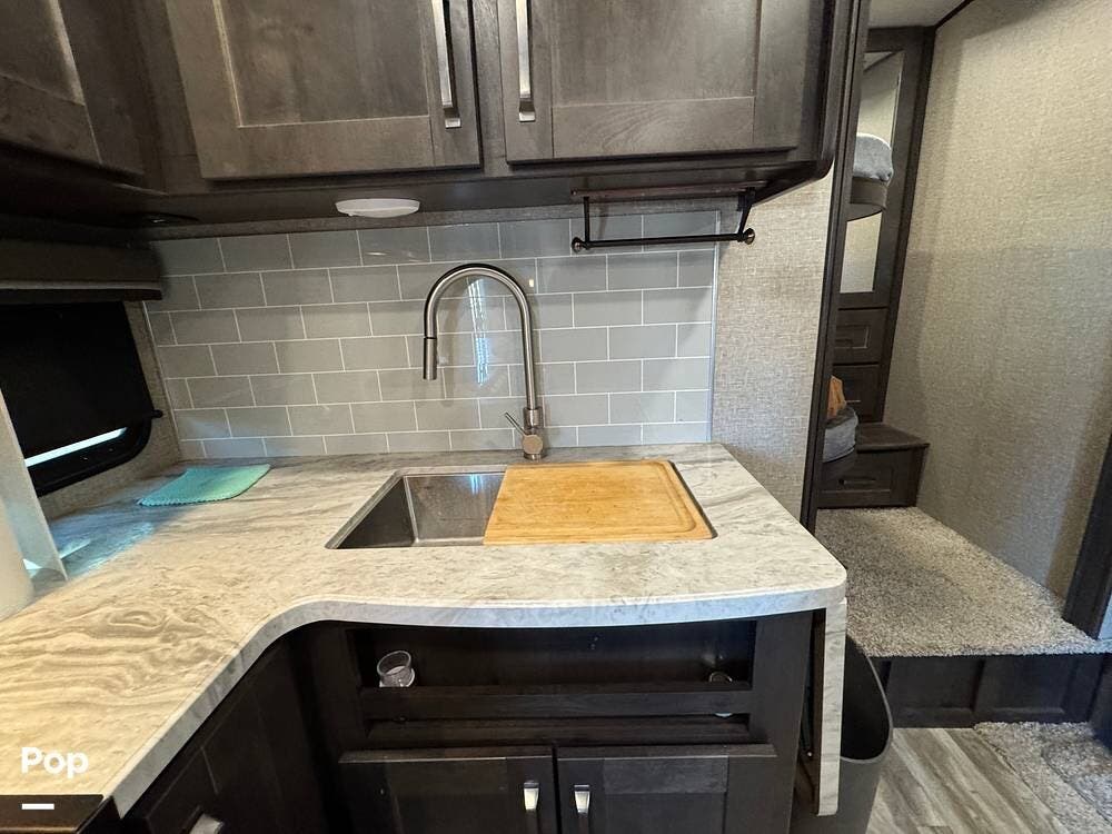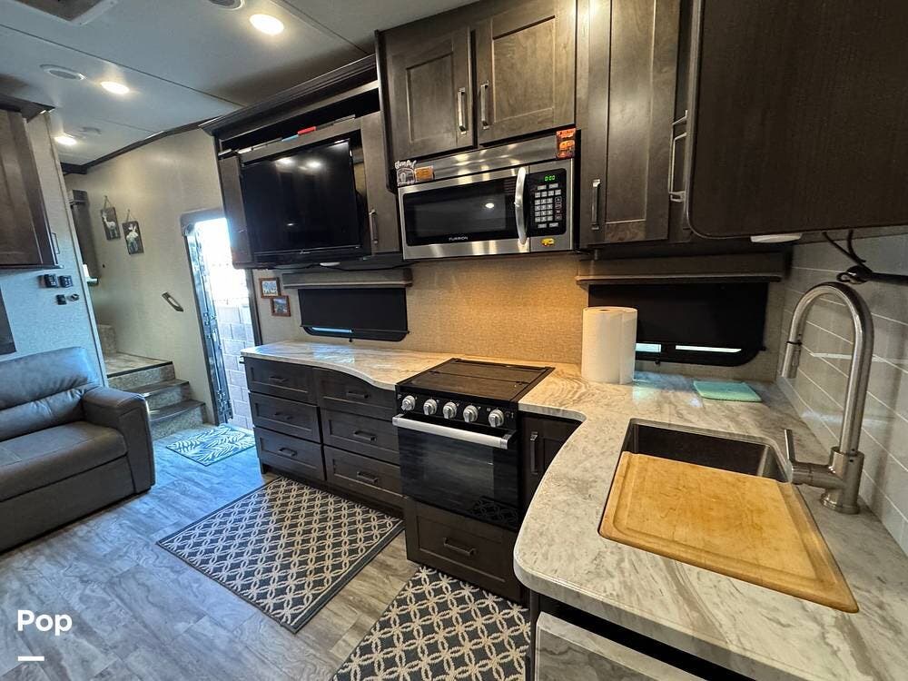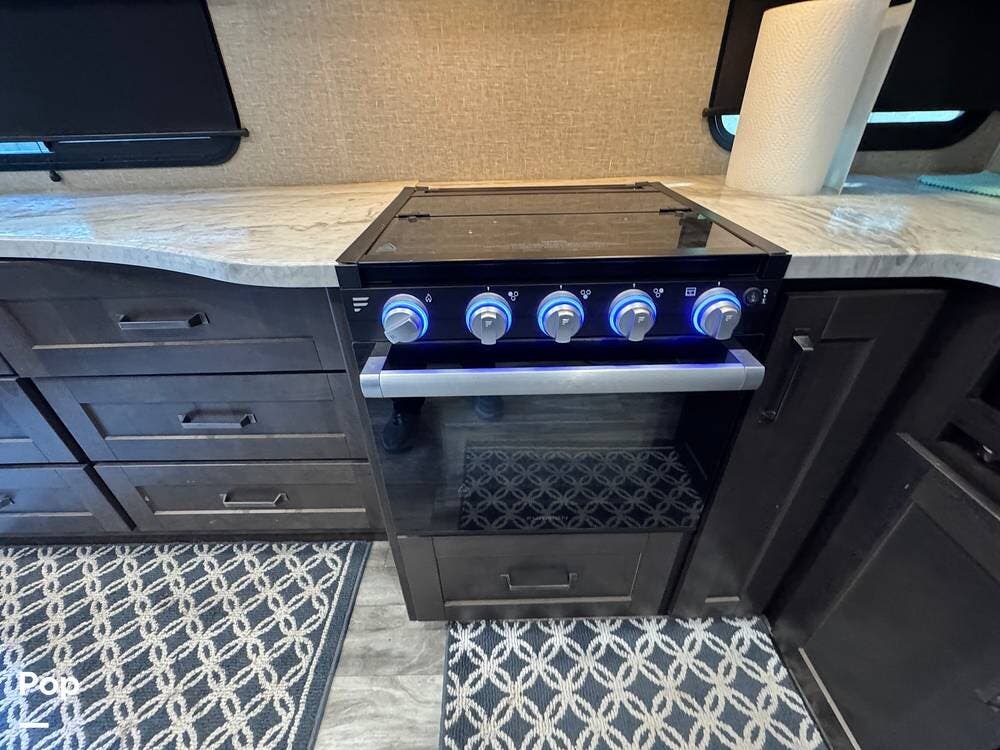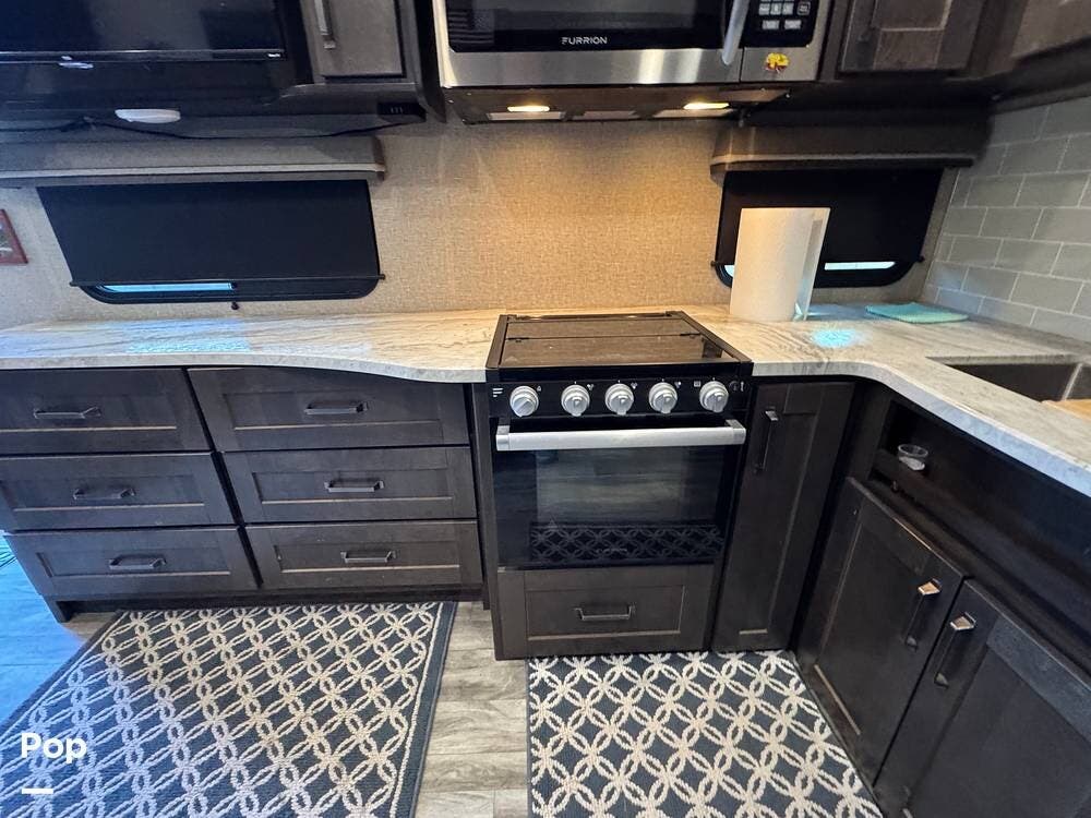 The kitchen is fully equipped with a 3-burner range, microwave, and a spacious refrigerator, perfect for preparing meals on the go. The ample counter space gives you plenty of room to prepare food, while the deep sink makes cleanup a breeze.