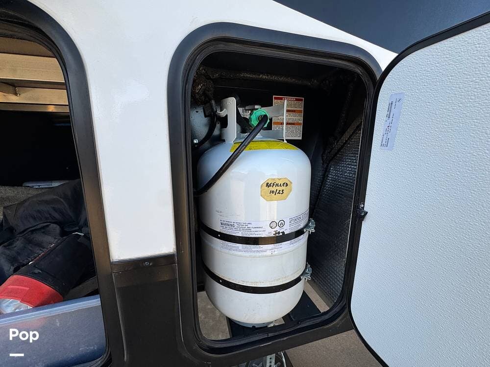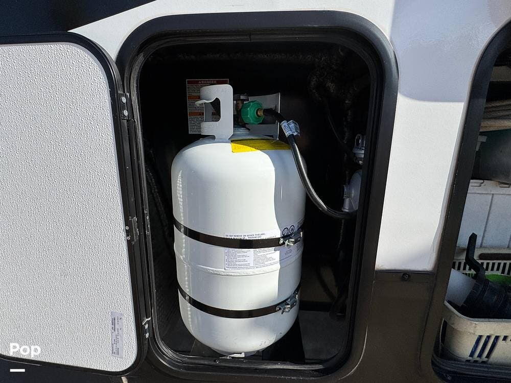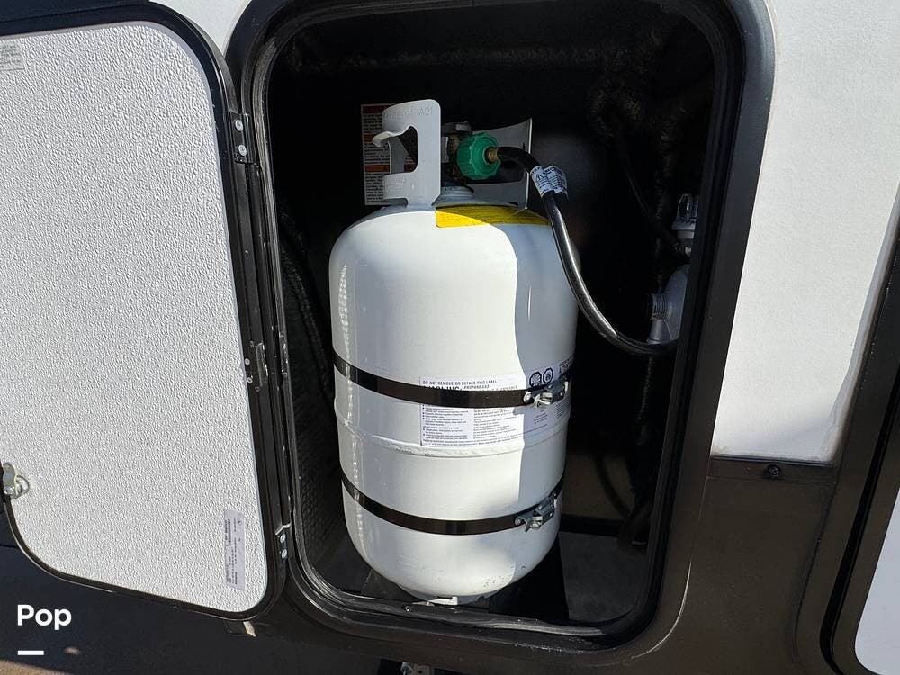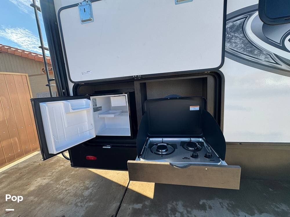 The 2022 Reflection 278BH offers an outdoor experience to match its indoor comfort. It features a power awning with LED lights, perfect for evening relaxation. You'll also find an outdoor kitchen complete with a mini-fridge and a grill, ideal for cooking while enjoying the fresh air. The outside shower is a nice addition for cleaning off after a day of hiking, swimming, or playing in the dirt.