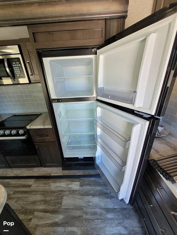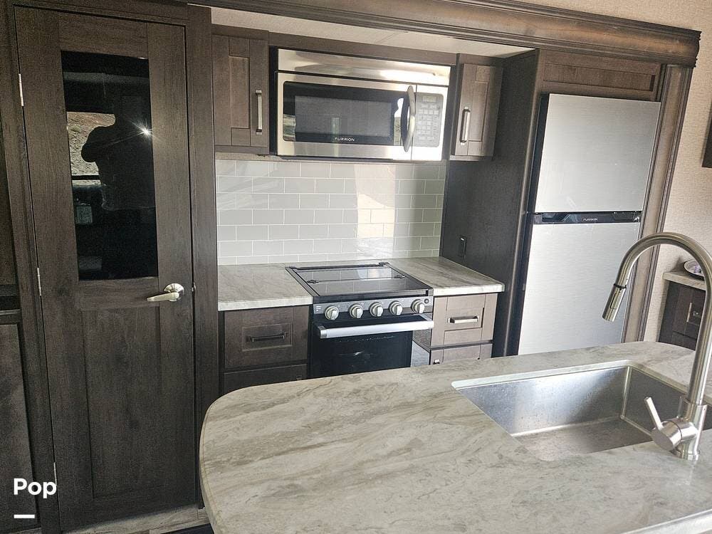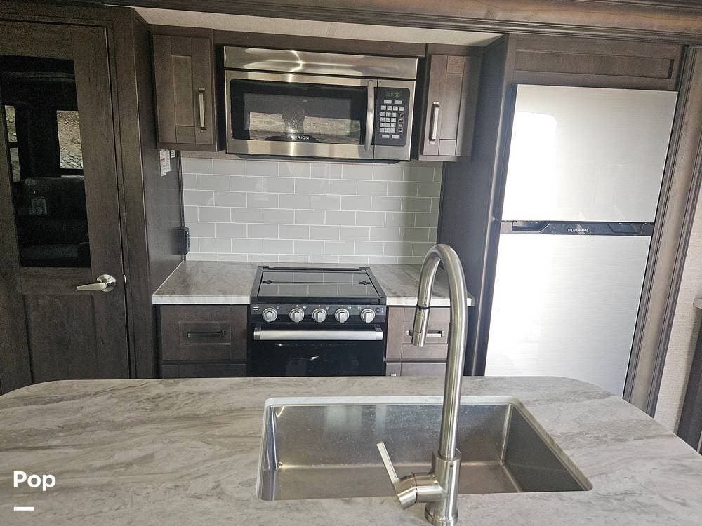 This fifth wheel features a well-equipped kitchen with an island, residential-style stainless steel appliances, and plenty of counter and storage space.