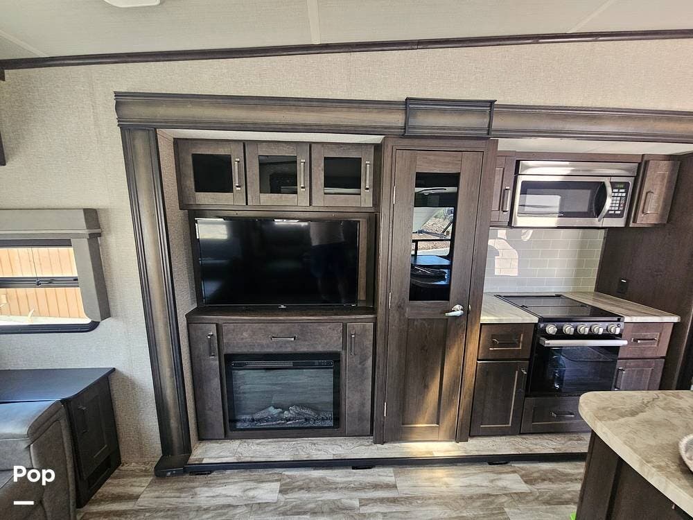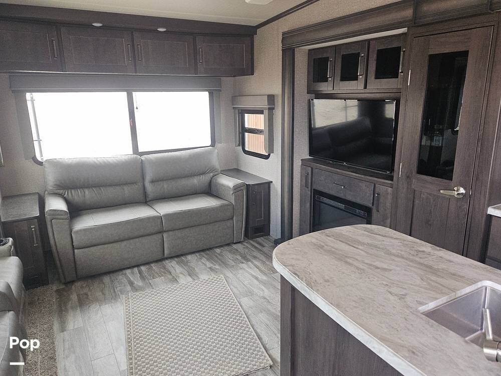 The 295RL features a rear living layout, with a spacious living area at the back of the trailer. This includes a two-person stadium-style recliner, a sofa bed, and a large entertainment center with a flat-screen TV, a stereo, and a fireplace.