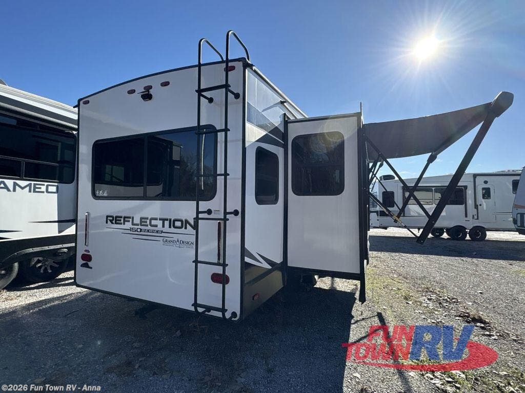 With any Reflection 150 Series fifth wheel by Grand Design, there is more available payload capacity and a broader range of half-ton trucks capable of towing this fifth wheel, and no slider hitch is needed thanks to the 90-degree turning radius which makes them short bed friendly and easier to tow. The mandatory Ultimate Power package provides a "One-Touch" automatic leveling system and a detachable power cord with LED light for easy setup, plus motion sensor pass-through lighting and entry lighting, and the Tire Linc TPMS will help you stay safe on the road. The interior offers residential luxury from the cabinetry and gunstock hardware plus the booth dinette to the residential-style window treatment. Make your refined decision today!