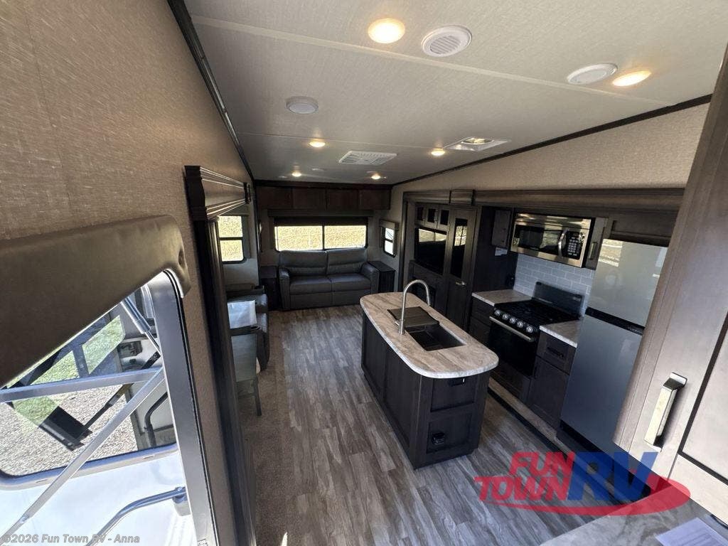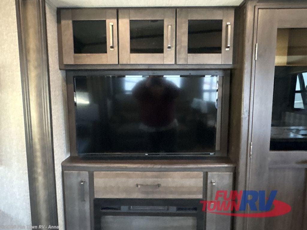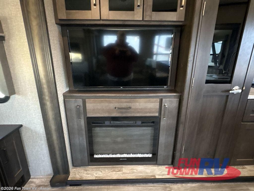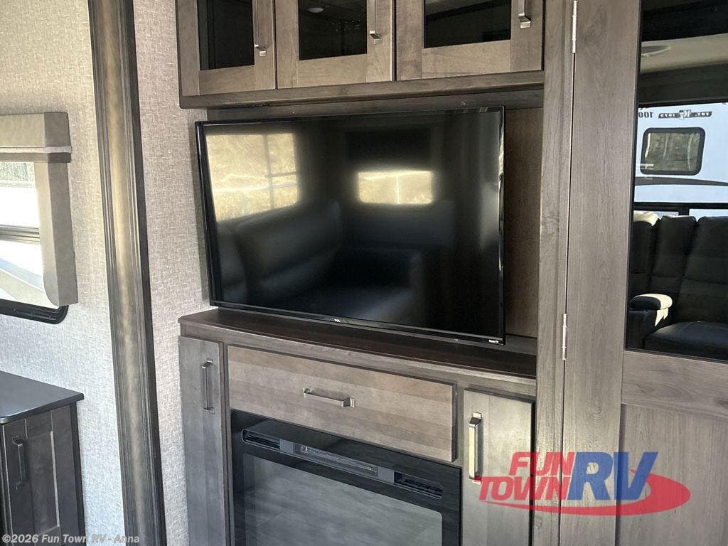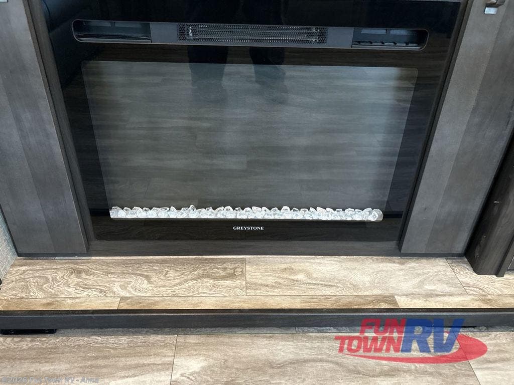 Get ready to enjoy everything the campgrounds and surrounding area has to offer when you are setup to camp in this fifth wheel! The two electric awnings offer protected areas creating outdoor living spaces, just grab your camping chairs from the unobstructed pass-through storage. And the interior offers a spacious living area and kitchen combination with two slide outs. You can sit on the tri-fold sofa or the dinette with an option for a free standing dinette. The hutch and kitchen island offer counter space to prepare and serve meals, and there is a large pantry for goodies. The 40" LED HDTV with fireplace below provides entertainment before bedtime or on a rainy day. And the front bedroom offers privacy, a walk-around queen bed, storage, and it is next to the full bathroom which is just a few steps down the hallway.