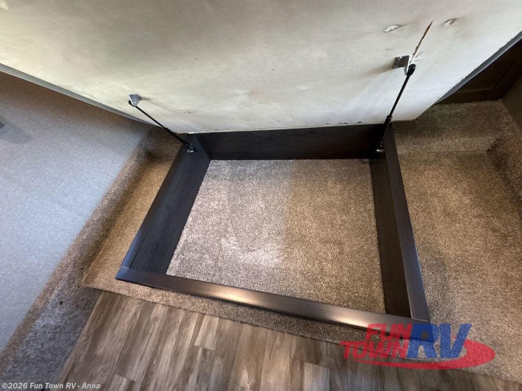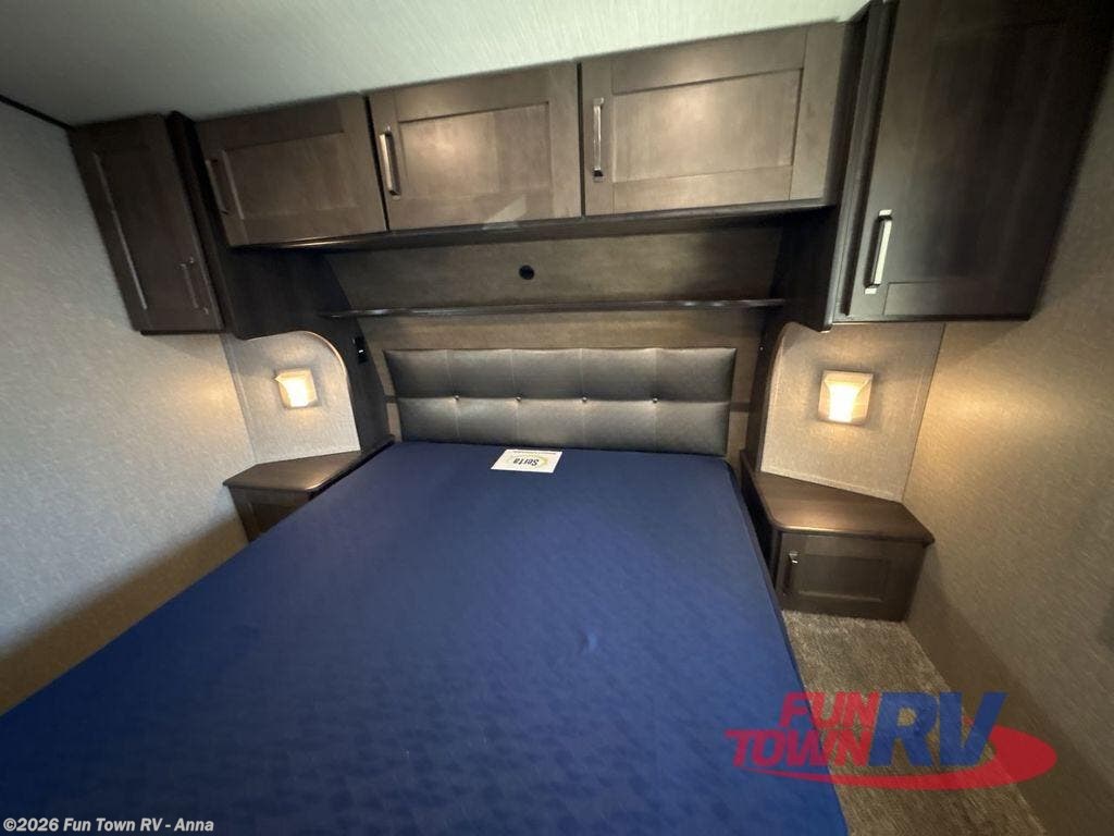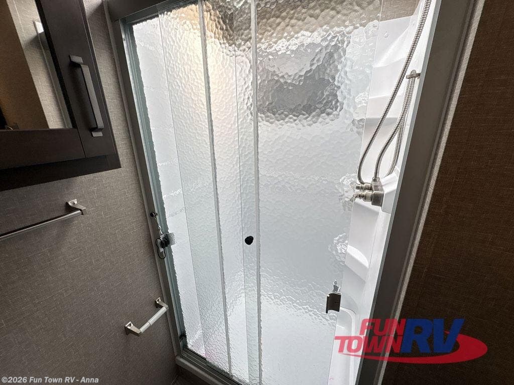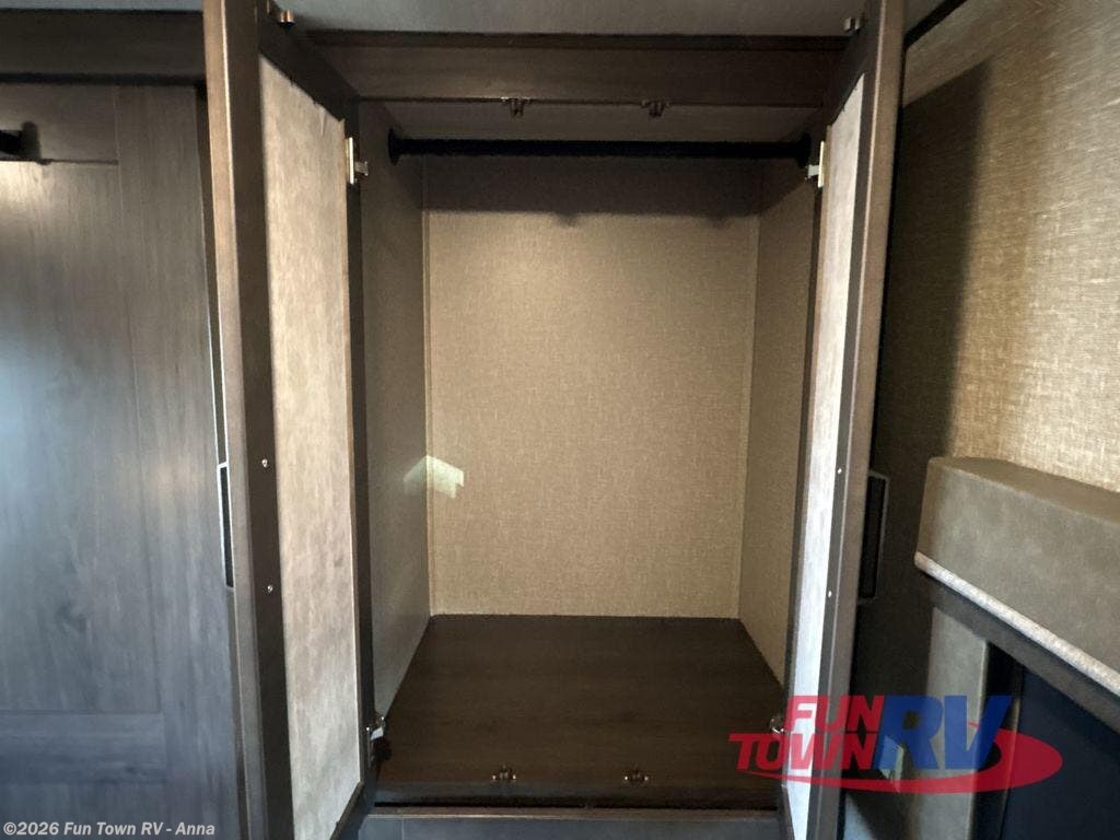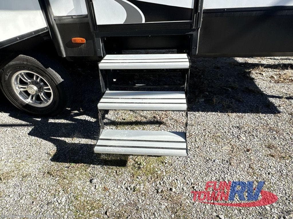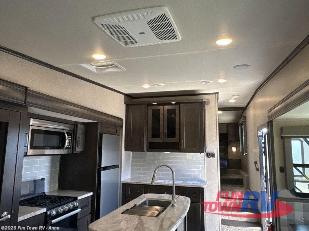 Get ready to enjoy everything the campgrounds and surrounding area has to offer when you are setup to camp in this fifth wheel! The two electric awnings offer protected areas creating outdoor living spaces, just grab your camping chairs from the unobstructed pass-through storage. And the interior offers a spacious living area and kitchen combination with two slide outs. You can sit on the tri-fold sofa or the dinette with an option for a free standing dinette. The hutch and kitchen island offer counter space to prepare and serve meals, and there is a large pantry for goodies. The 40" LED HDTV with fireplace below provides entertainment before bedtime or on a rainy day. And the front bedroom offers privacy, a walk-around queen bed, storage, and it is next to the full bathroom which is just a few steps down the hallway.
