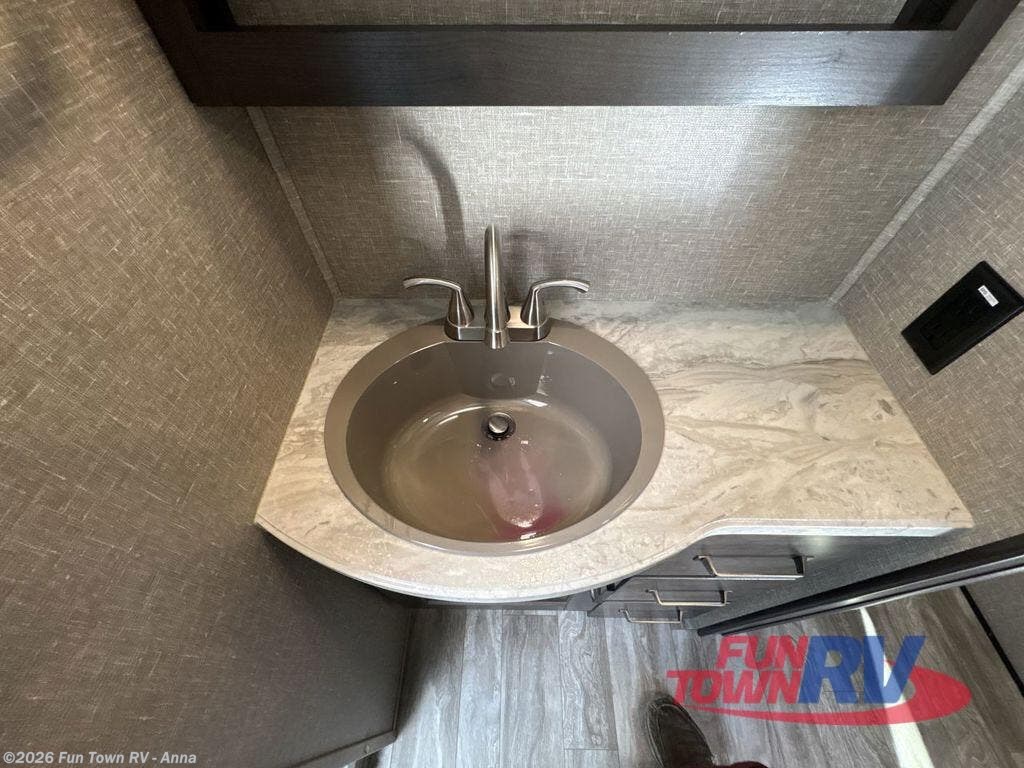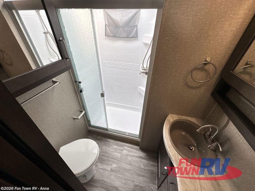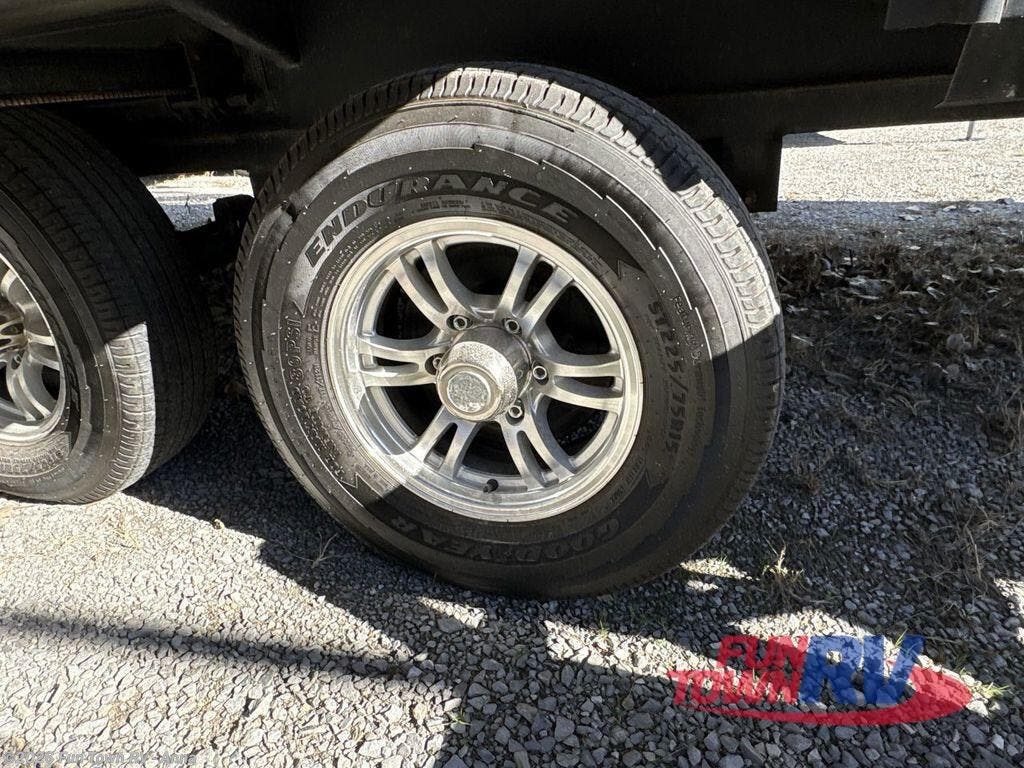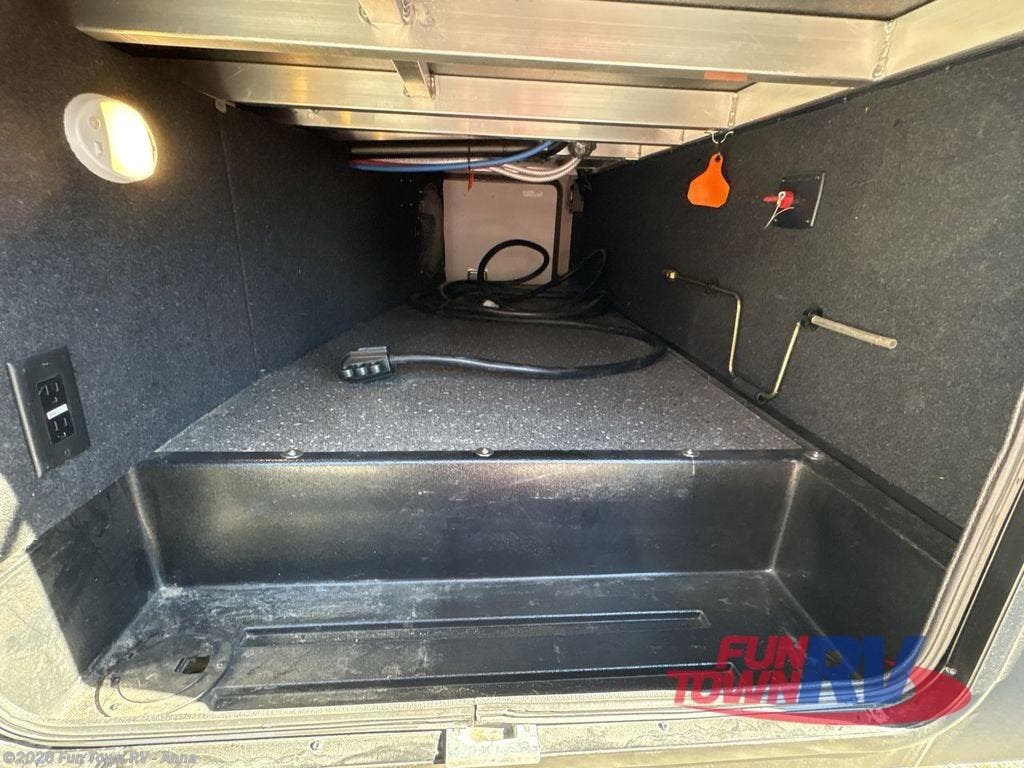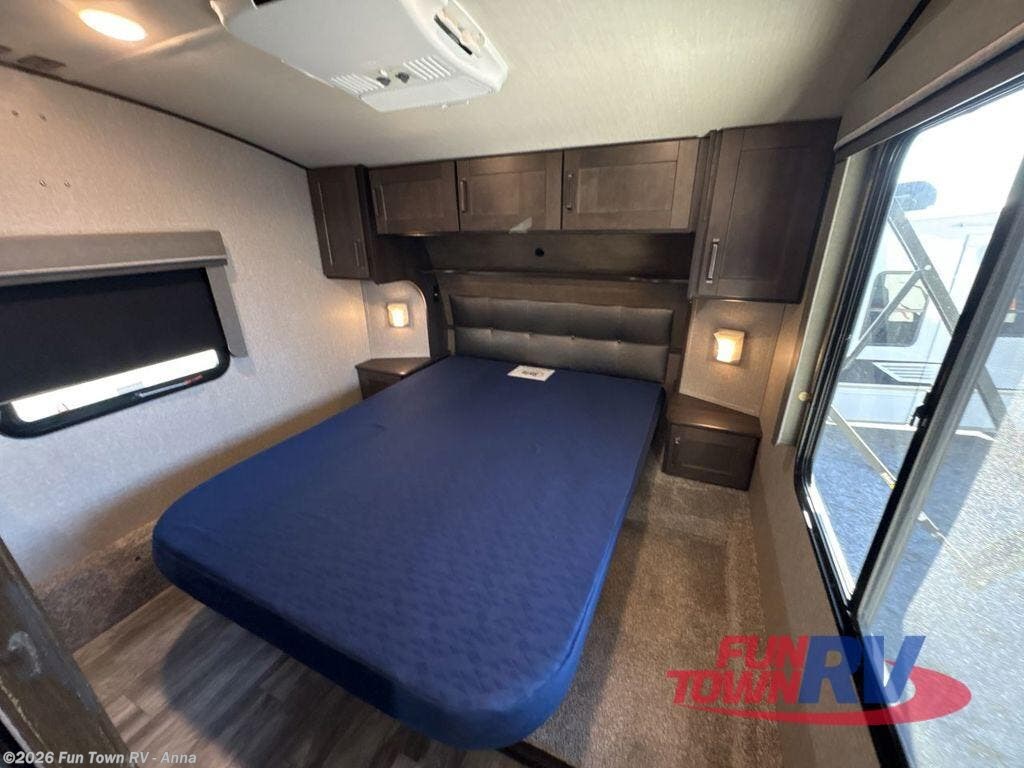 Get ready to enjoy everything the campgrounds and surrounding area has to offer when you are setup to camp in this fifth wheel! The two electric awnings offer protected areas creating outdoor living spaces, just grab your camping chairs from the unobstructed pass-through storage. And the interior offers a spacious living area and kitchen combination with two slide outs. You can sit on the tri-fold sofa or the dinette with an option for a free standing dinette. The hutch and kitchen island offer counter space to prepare and serve meals, and there is a large pantry for goodies. The 40" LED HDTV with fireplace below provides entertainment before bedtime or on a rainy day. And the front bedroom offers privacy, a walk-around queen bed, storage, and it is next to the full bathroom which is just a few steps down the hallway.