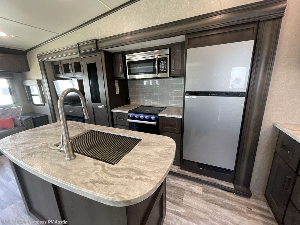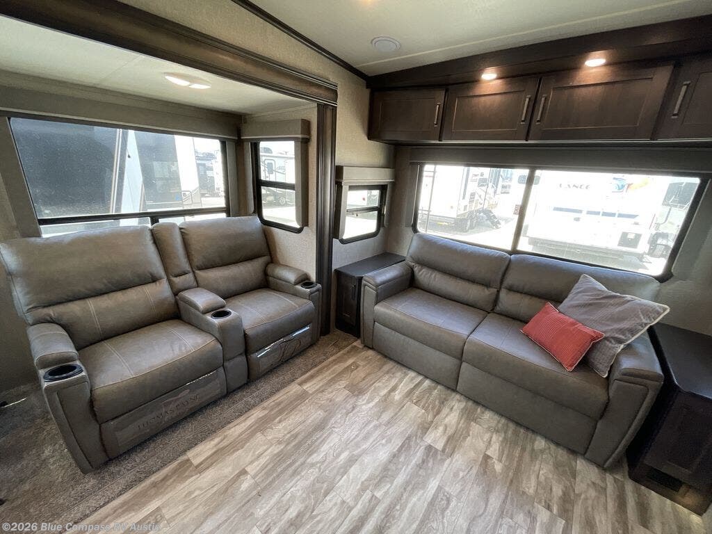 Get ready to enjoy everything the campgrounds and surrounding area has to offer when you are setup to camp in this fifth wheel! The two electric awnings offer protected areas creating outdoor living spaces, just grab your camping chairs from the unobstructed pass-through storage. And the interior offers a spacious living area and kitchen combination with two slide outs. You can sit on the tri-fold sofa or the dinette with an option for a free standing dinette. The hutch and kitchen island offer counter space to prepare and serve meals, and there is a large pantry for goodies. The 40" LED HDTV with fireplace below provides entertainment before bedtime or on a rainy day. And the front bedroom offers privacy, a walk-around queen bed, storage, and it is next to the full bathroom which is just a few steps down the hallway.