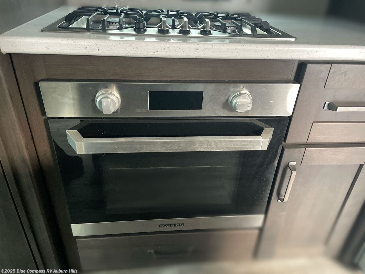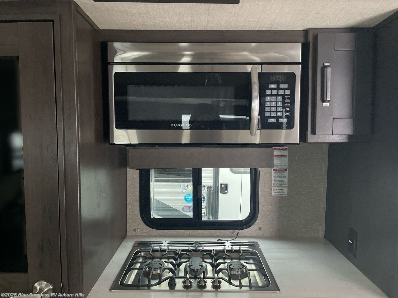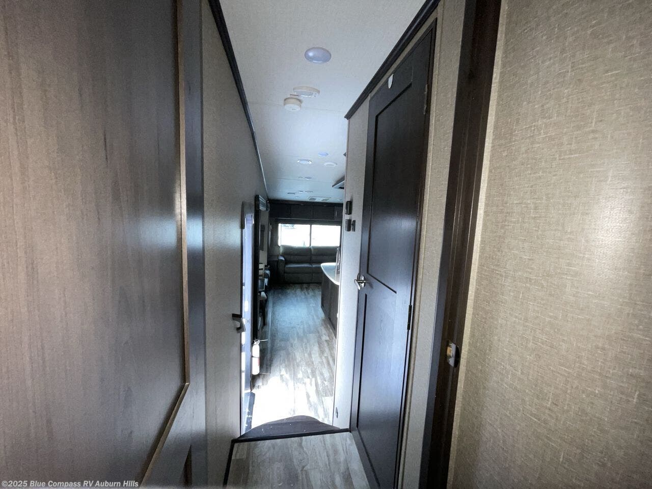 Whether you travel for pleasure or work, you will love the spacious main living and kitchen area with a rear tri-fold sofa that doubles as extra sleeping space, and the theatre seating directly across from the entertainment center with a 40" LED HDTV and a fireplace below. The kitchen island will make meal prepping and drying the dishes easier and the hutch is the perfect place to place your picture frames, nice dishes, and extra cooking items, plus the pantry is big enough to store all of your favorite snacks, dry ingredients and such. Outside you can enjoy two electric awnings that provide protection from the elements as you relax and visit with other RVers, and your camping chairs can easily be stored in the pass-through compartment. The double entry bathroom is convenient especially at night when you can slide the door to enter from the front master bedroom. You will find plenty of storage for your clothing and things, plus the bedroom slide out gives you drawers and linen storage that stretches into the full bathroom.