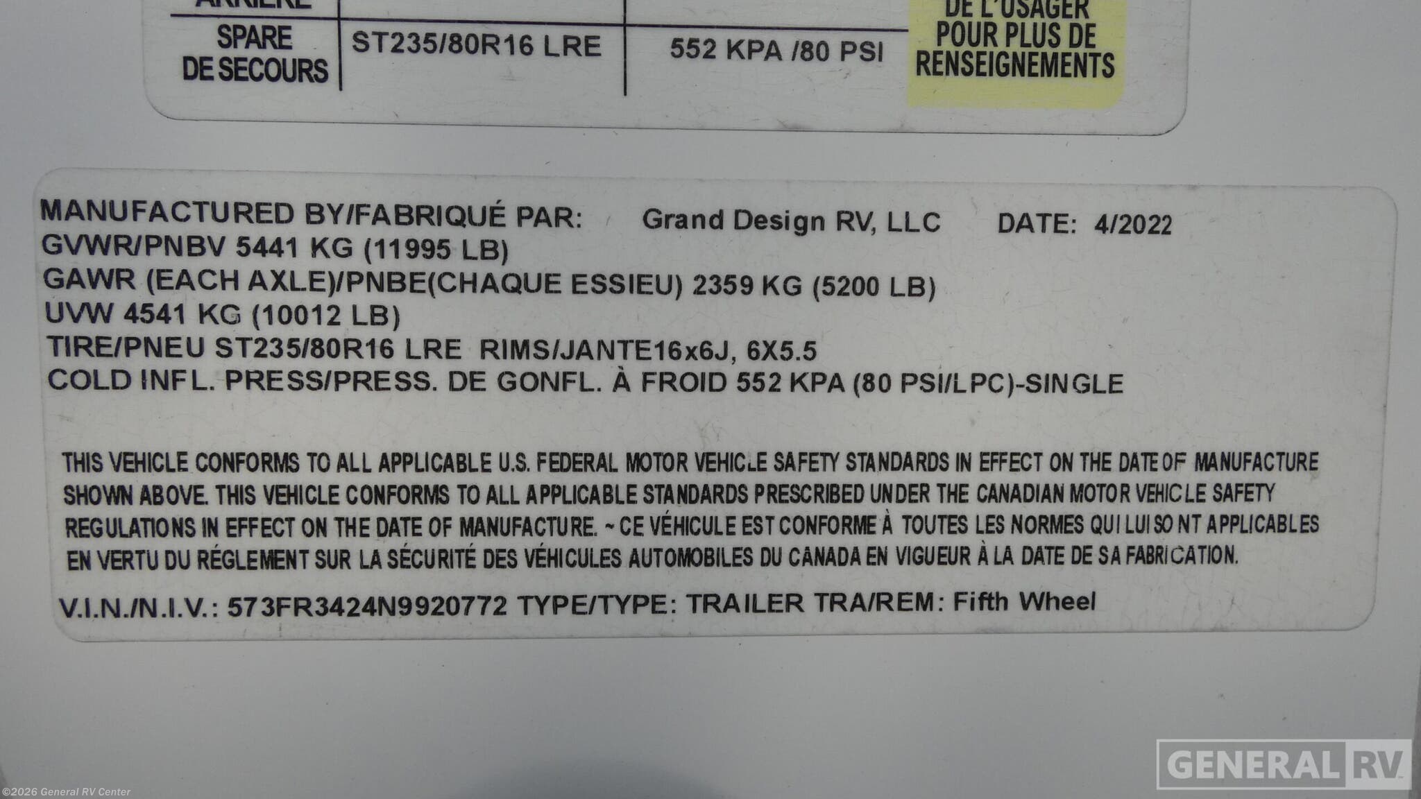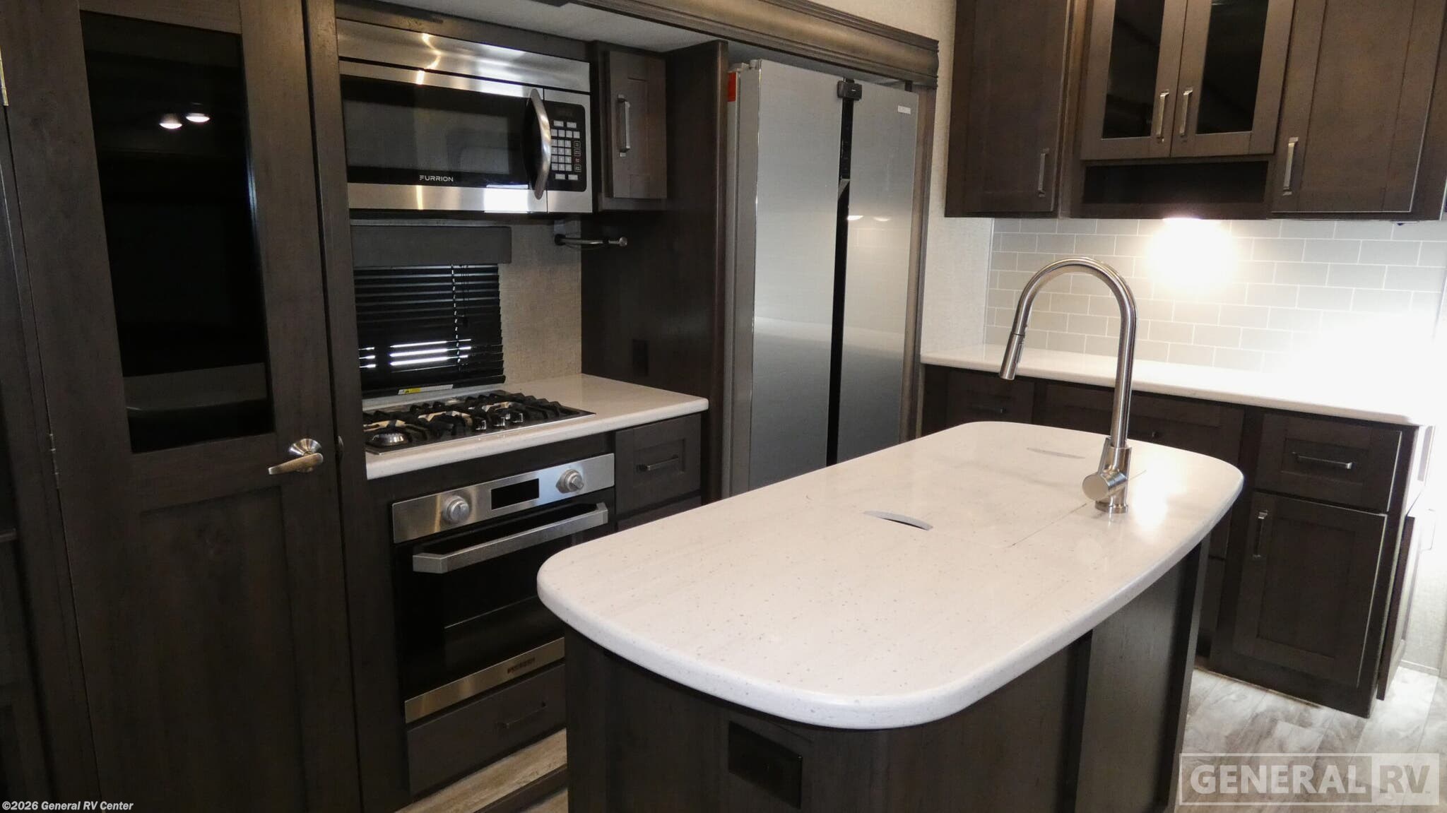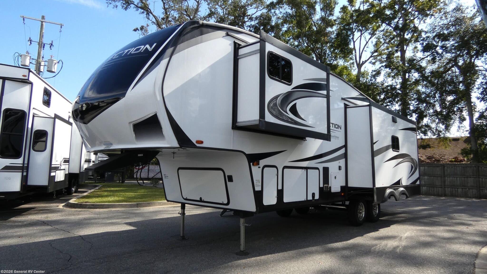 Step into the 2022 Grand Design Reflection 303RLS, where comfort and style meet in perfect harmony. This fifth wheel is designed for those who crave both adventure and luxury. With its spacious floorplan, it comfortably sleeps six, featuring a cozy queen bed and two convertible sleeping areas. The rear living space is a true highlight, boasting a tri-fold sofa and theater seating that invite you to unwind in front of the entertainment center, complete with a 40" TV and fireplace. The center kitchen, equipped with a full-size refrigerator and a three-burner cooktop, makes meal prep a breeze, while the free-standing dinette offers an elegant spot for dining. The Reflection 303RLS doesn't just stop at comfort; it excels in practicality. With generous storage options, including overhead cabinets and an unobstructed pass-through compartment, you'll have plenty of space for all your travel essentials. The center bath features a radius shower with a skylight, providing a refreshing retreat. Outside, two powered retractable awnings extend your living space, perfect for enjoying the great outdoors in style. With a robust GVWR and ample cargo capacity, this RV is ready to hit the road whenever you are. For more details and to experience this remarkable RV firsthand, visit your nearest General RV dealership.
