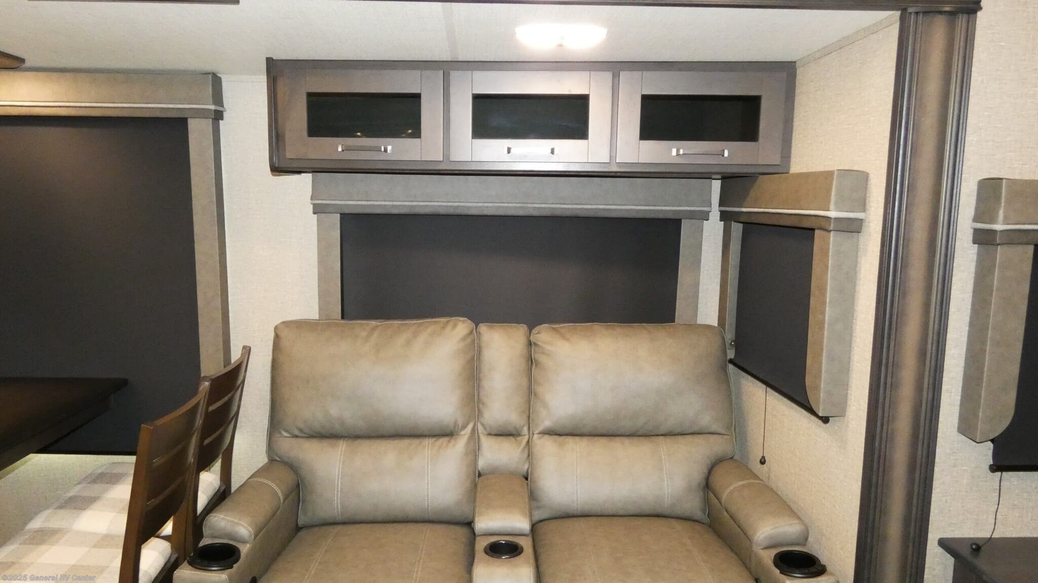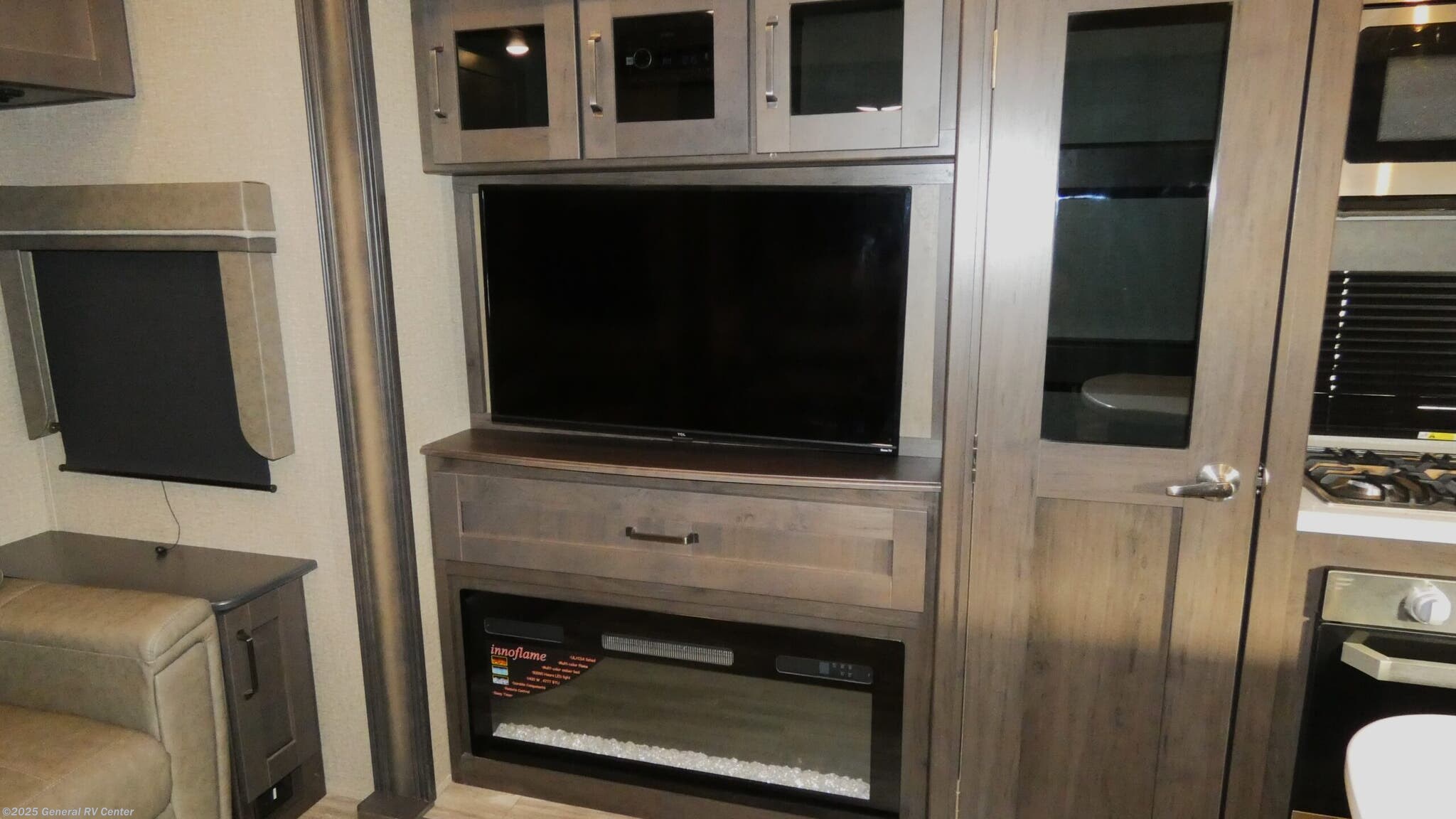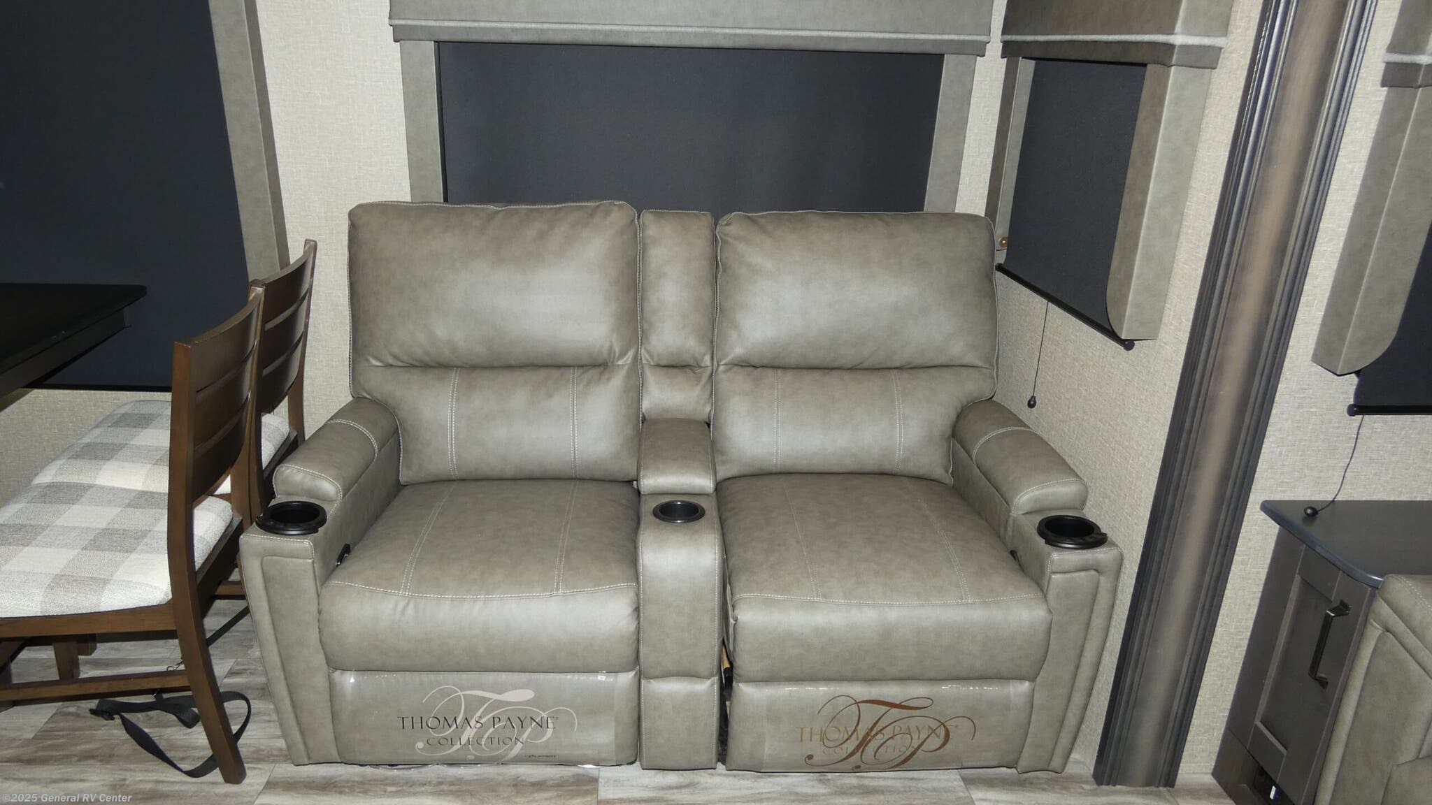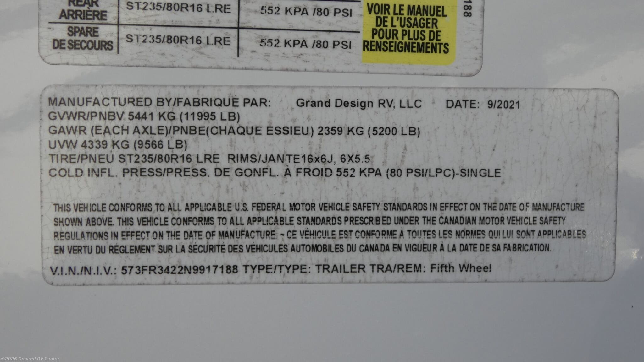 Step into the 2022 Grand Design Reflection 303RLS, where comfort and style meet in perfect harmony. This fifth wheel is designed for those who crave both adventure and luxury. With its spacious floorplan, it comfortably sleeps six, featuring a cozy queen bed and two convertible sleeping areas. The rear living space is a true highlight, boasting a tri-fold sofa and theater seating that invite you to unwind in front of the entertainment center, complete with a 40" TV and fireplace. The center kitchen, equipped with a full-size refrigerator and a three-burner cooktop, makes meal prep a breeze, while the free-standing dinette offers an elegant spot for dining. The Reflection 303RLS doesn't just stop at comfort; it excels in practicality. With generous storage options, including overhead cabinets and an unobstructed pass-through compartment, you'll have plenty of space for all your travel essentials. The center bath features a radius shower with a skylight, providing a refreshing retreat. Outside, two powered retractable awnings extend your living space, perfect for enjoying the great outdoors in style. With a robust GVWR and ample cargo capacity, this RV is ready to hit the road whenever you are. For more details and to experience this remarkable RV firsthand, visit your nearest General RV dealership.
