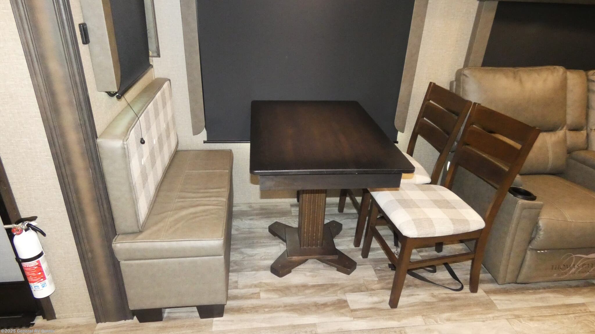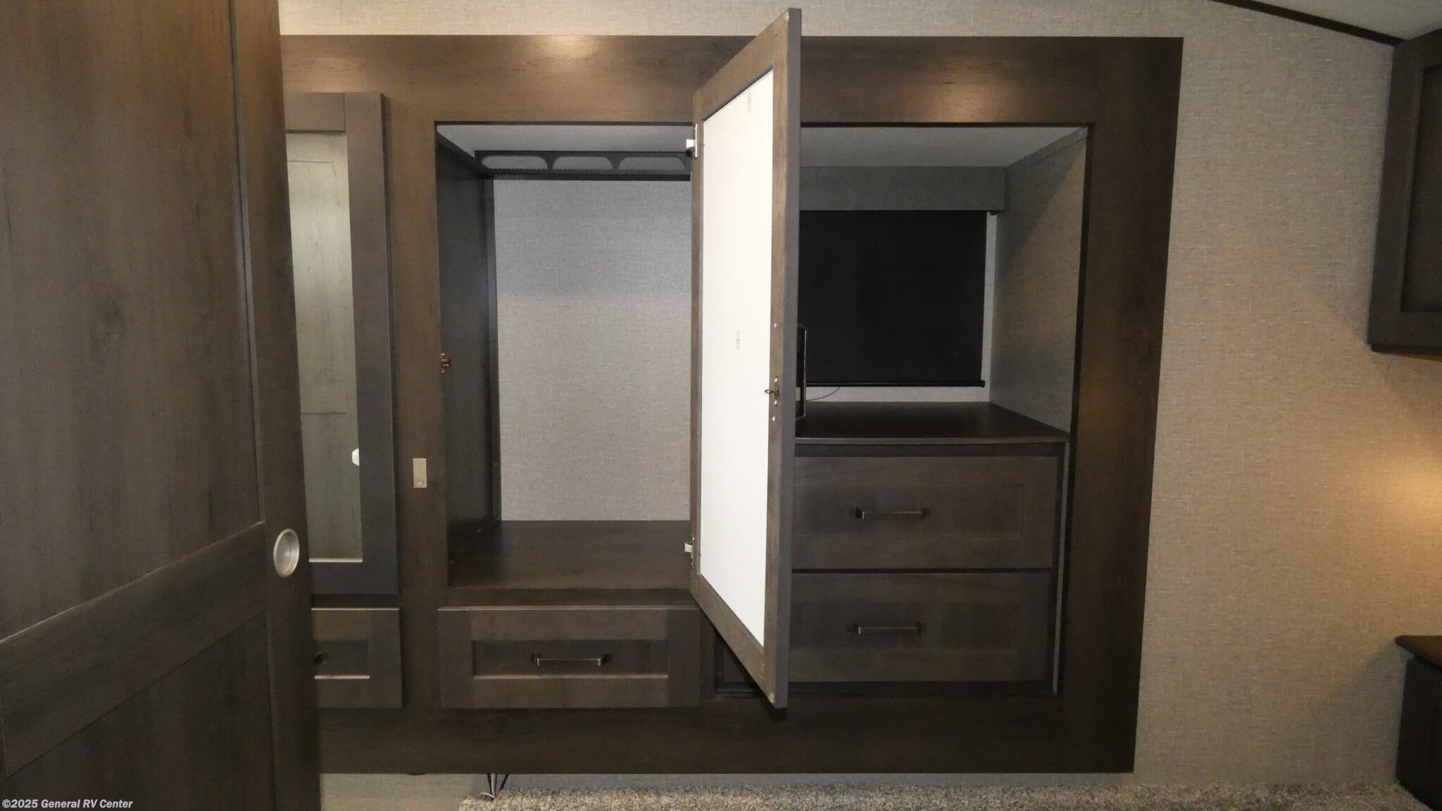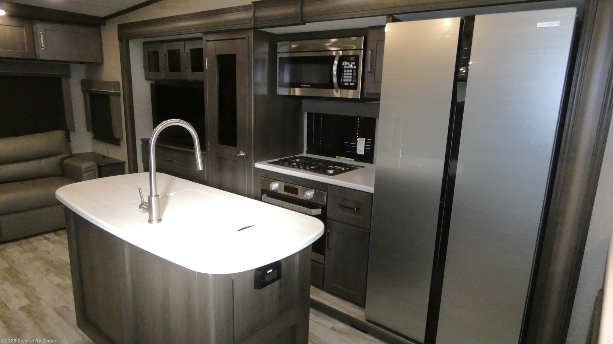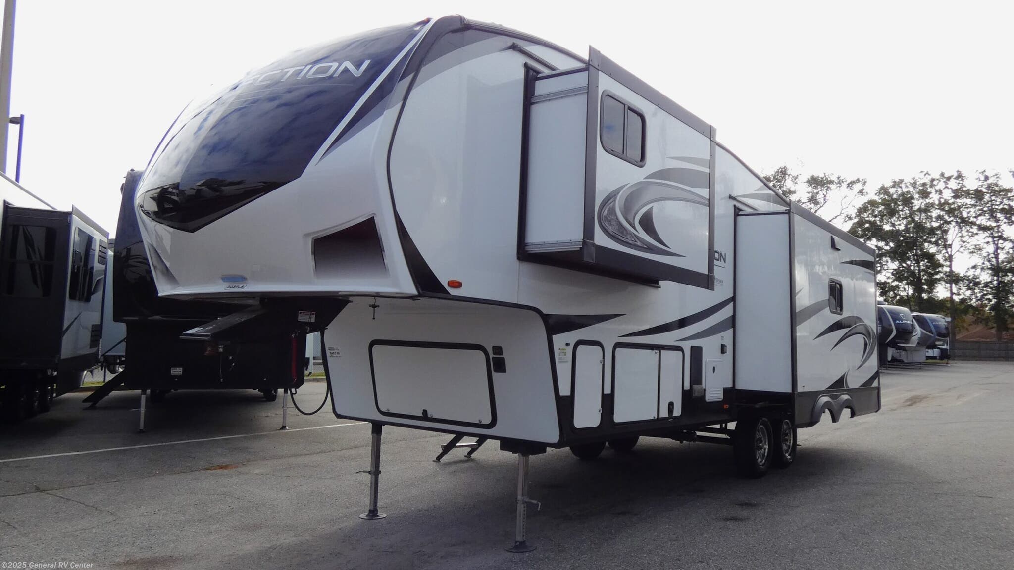 Step into the 2022 Grand Design Reflection 303RLS, where comfort and style meet in perfect harmony. This fifth wheel is designed for those who crave both adventure and luxury. With its spacious floorplan, it comfortably sleeps six, featuring a cozy queen bed and two convertible sleeping areas. The rear living space is a true highlight, boasting a tri-fold sofa and theater seating that invite you to unwind in front of the entertainment center, complete with a 40" TV and fireplace. The center kitchen, equipped with a full-size refrigerator and a three-burner cooktop, makes meal prep a breeze, while the free-standing dinette offers an elegant spot for dining. The Reflection 303RLS doesn't just stop at comfort; it excels in practicality. With generous storage options, including overhead cabinets and an unobstructed pass-through compartment, you'll have plenty of space for all your travel essentials. The center bath features a radius shower with a skylight, providing a refreshing retreat. Outside, two powered retractable awnings extend your living space, perfect for enjoying the great outdoors in style. With a robust GVWR and ample cargo capacity, this RV is ready to hit the road whenever you are. For more details and to experience this remarkable RV firsthand, visit your nearest General RV dealership.