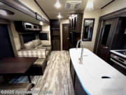 Looking to travel with your family and friends and would like enough space for everyone to be comfortable both during the day and night? Well, step inside using the AXIStep, to find a private bunkhouse in the rear of this fifth wheel which offers a slide out flip bunk above a tri-fold sofa, a bunk bed and storage on the opposite side, its very own private half bathroom, and a large rear window for great views. The theater seating or choose the tri-fold sofa option is a great place to unwind at night in front of the entertainment center with a 40" LED HDTV and fireplace below it. There is a booth dinette or choose a free standing dinette option to dine at, and the kitchen island has a deep, seated stainless steel sink with a high rise faucet with a pull down sprayer to make clean up a breeze too. You will find full amenities including a 16 cu. ft. refrigerator and a hutch. Up the interior steps, you will have a double entry bathroom with a radius shower with a skylight, and you can wake up refreshed each morning after sleeping on your own queen bed.