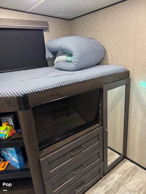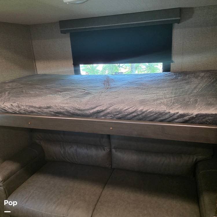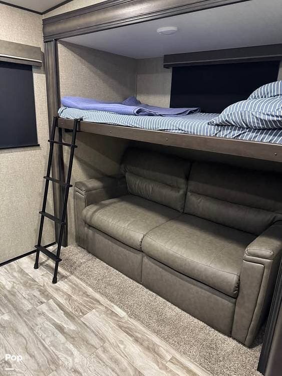 Includes a rear bunkhouse with multiple bunks, a convertible sofa, and its own half-bath. The bunkhouse offers a dedicated space for kids or guests, with entertainment hookups and additional storage.