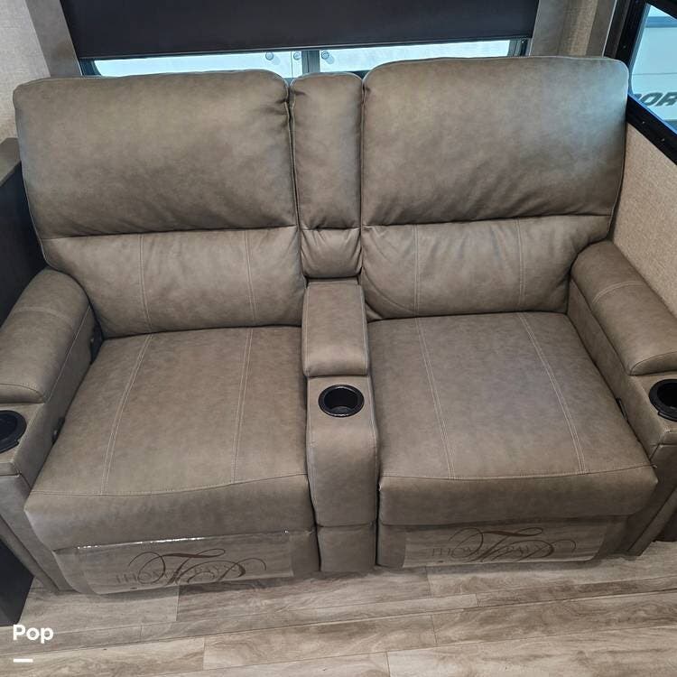 Open-concept living area with theater seating and a tri-fold sofa for relaxation.