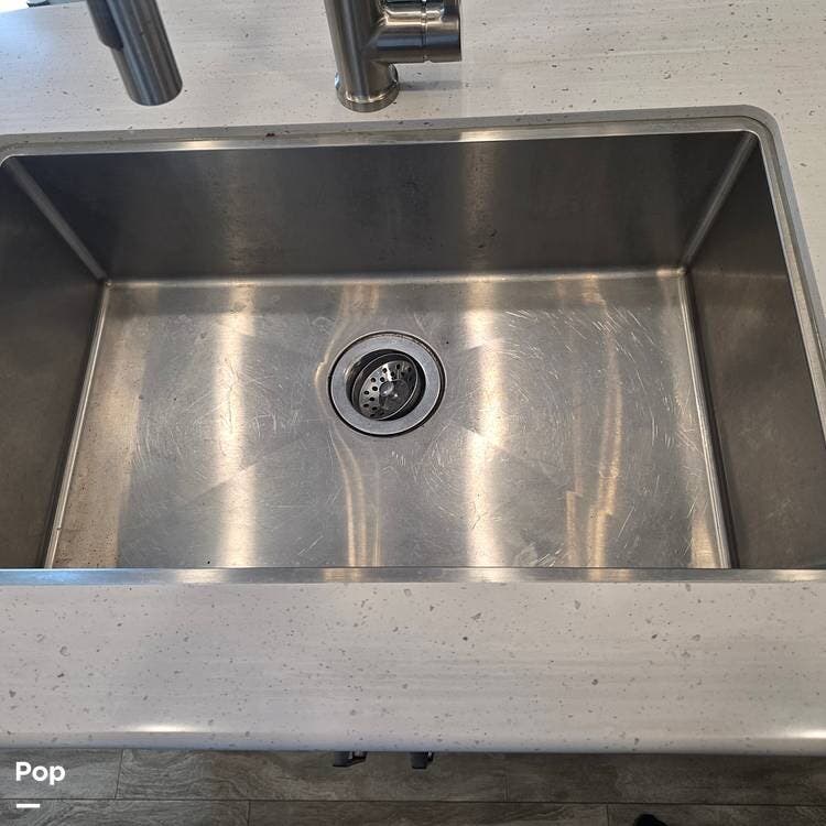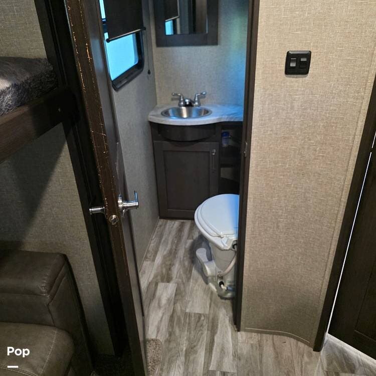 The full bathroom has a large shower, vanity, and toilet, which is accessible from the main living area. A half-bath in the rear bunkhouse offers added convenience.