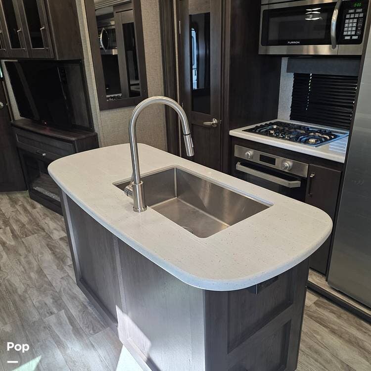 It is fully equipped with a large refrigerator, a three-burner stove, an oven, a microwave, and a deep sink with a high-rise faucet. Solid-surface countertops and a kitchen island provide ample prep space. There are also plenty of cabinets and a pantry for storage.