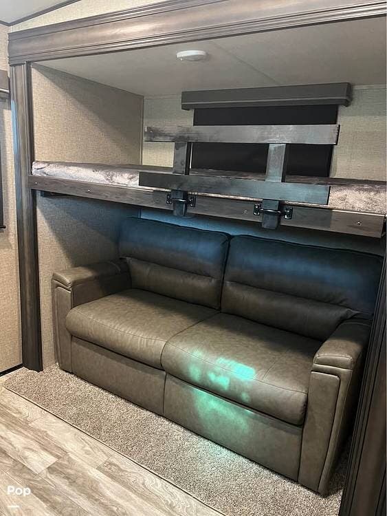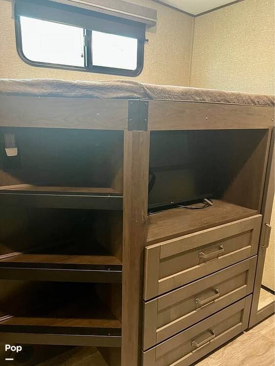 Kids or guests get their own bunkhouse in the rear with slide-out bunks, its own half bath, and plenty of room to spread out. Total sleeping for six adults is easy, more if the kids are small. The table and benches drop down for extra beds, too.