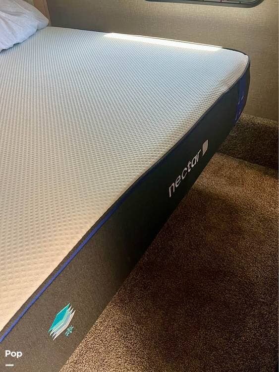 The front primary bedroom has its own slide, a quiet second AC unit, a walk-around queen bed with an upgraded Nectar memory foam mattress, plus a full private bathroom with a big shower.