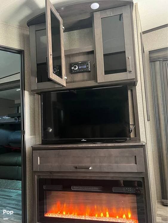 Step inside to a wide-open living area with four slides, two heated massage theater seats, an electric fireplace, and a full entertainment system ready for movie nights or the big game.