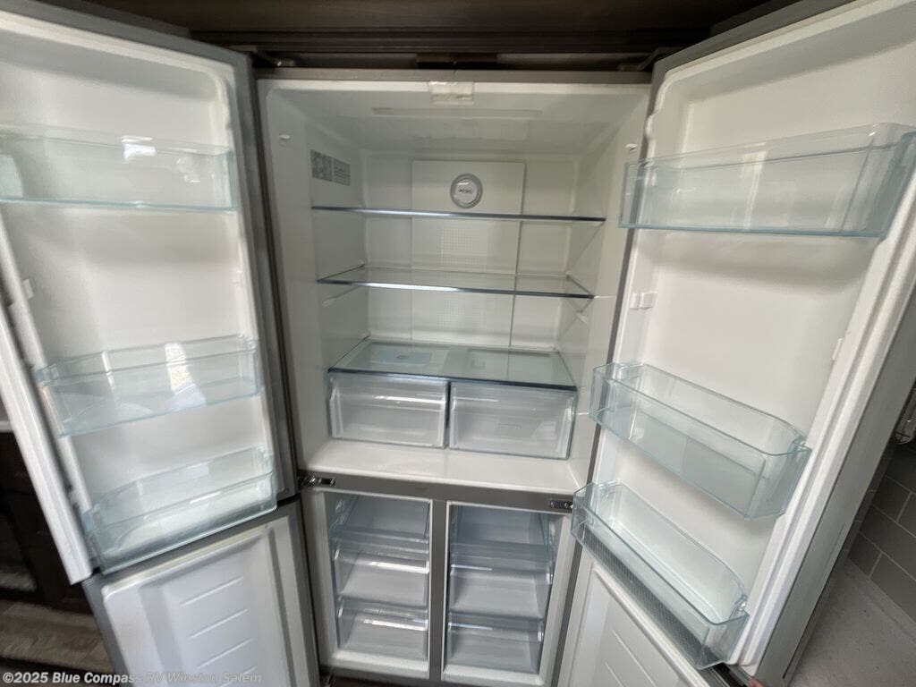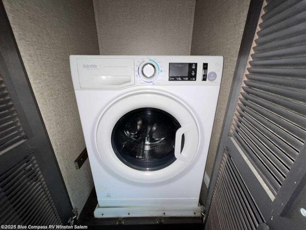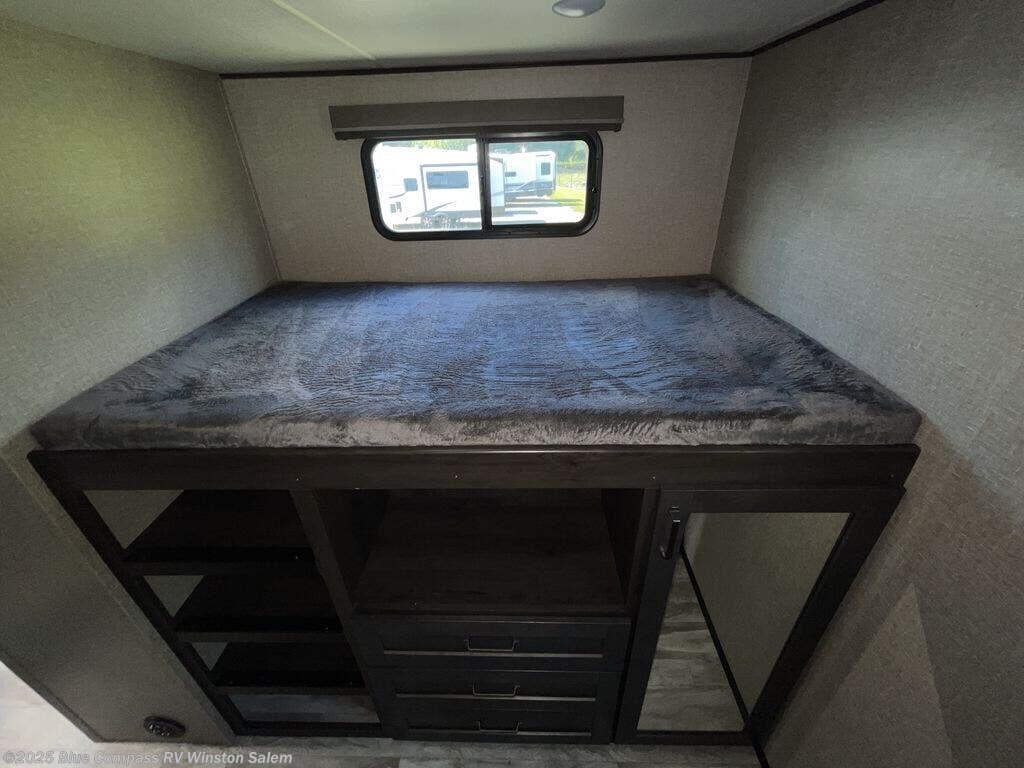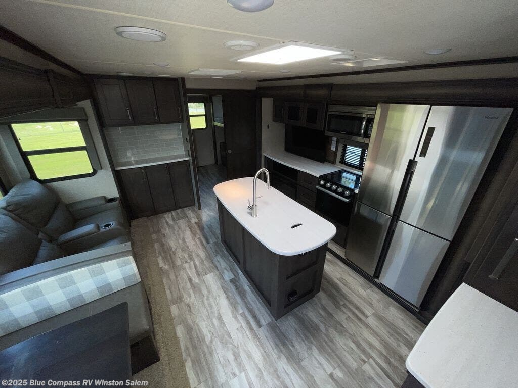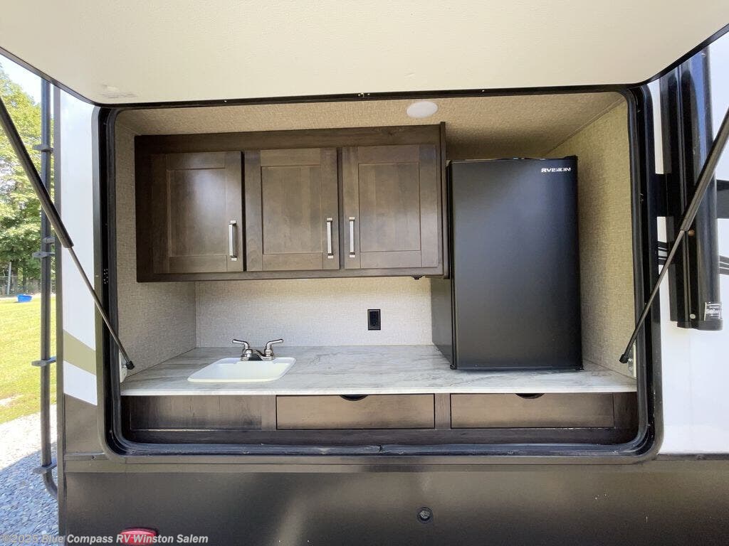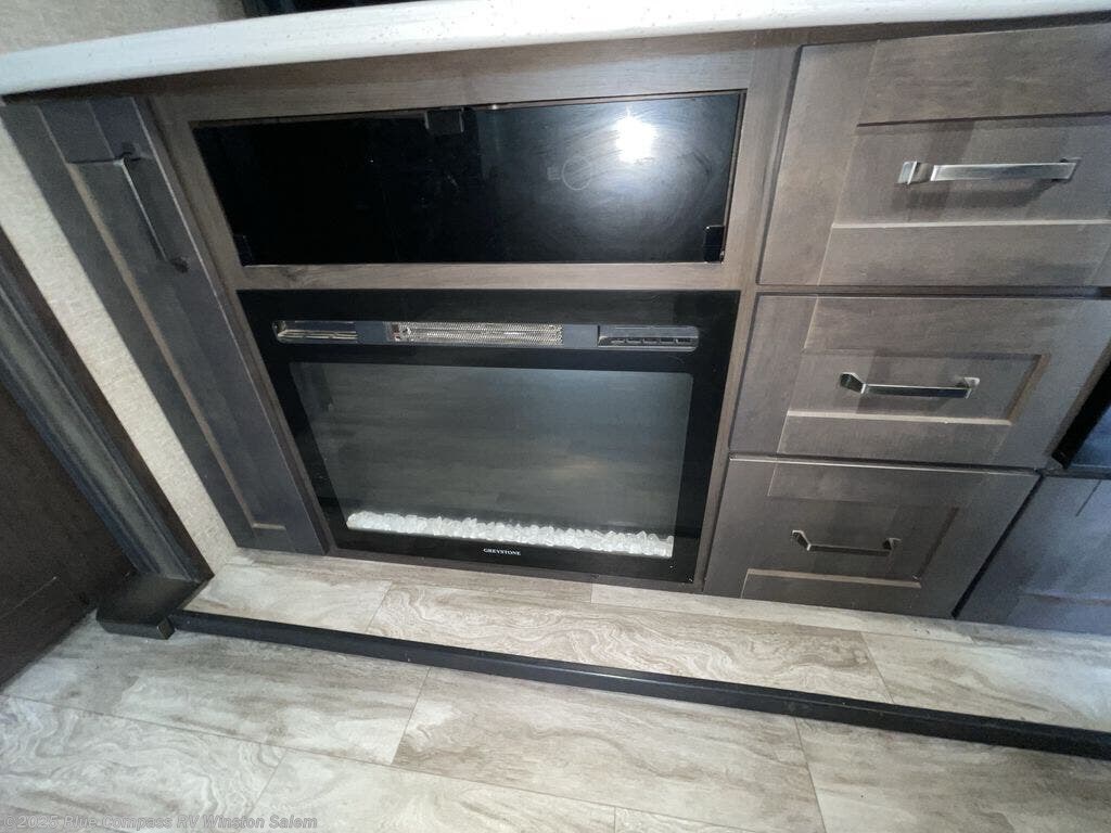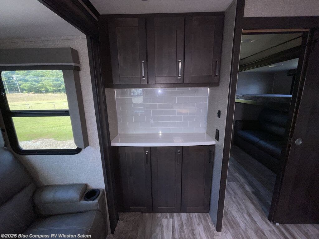Finding the perfect trailer for a larger group is simple, take a look at this one for your next RV! The rear bunkhouse might be the first reason you fall in love because of the slide out with a flip bunk above a tri-fold sofa, the second bunk bed on the opposite side and storage below, and the large rear window for great views. The outside kitchen might be another reason allowing you to enjoy the outdoors while providing meals for everyone, and/or the inside gourmet kitchen with a 16 cu. ft. refrigerator, an island, and two hutches. Everyone can gather together and relax on the theatre seating with cupholders and the booth dinette or choose a free standing dinette option, and to visit or watch the 40" LED HDTV with fireplace below. The full bathroom includes a space savings sliding door and linen storage, and the bedroom gives you a front walk-around queen bed with storage for your clothes on each side, plus there is an additional wardrobe with drawers and the option to add a washer/dryer to the prepped space.