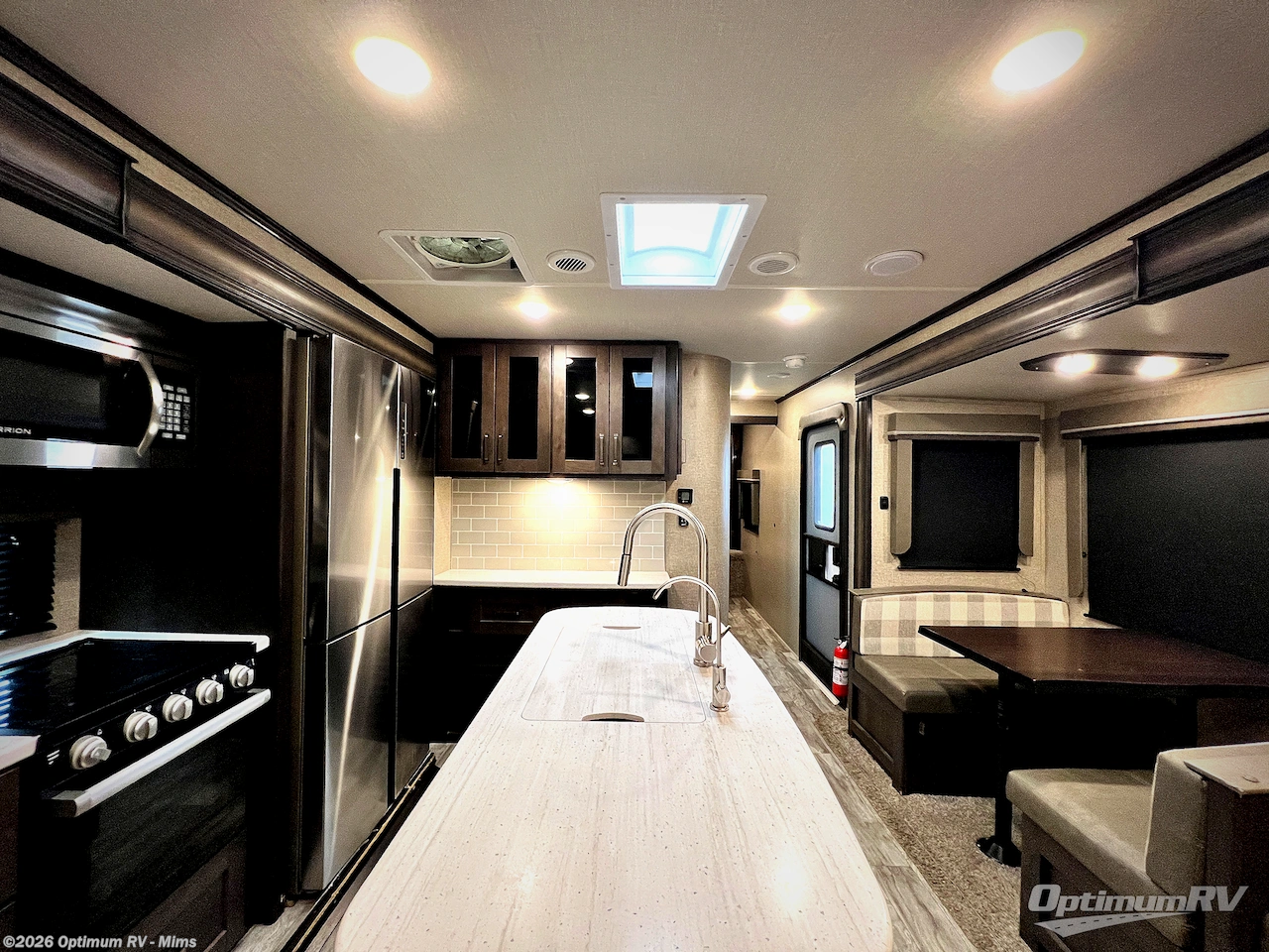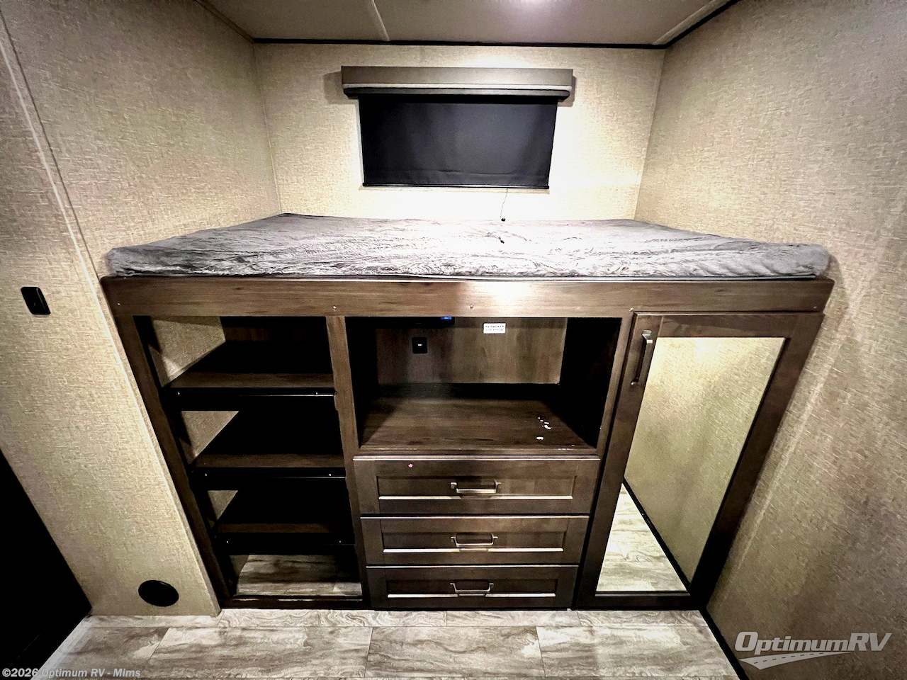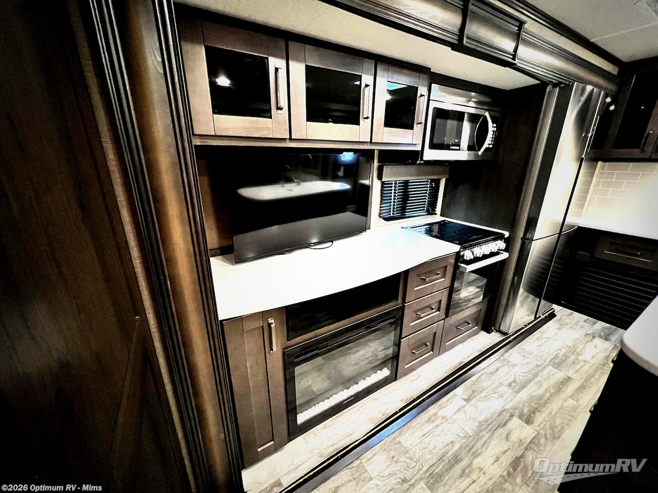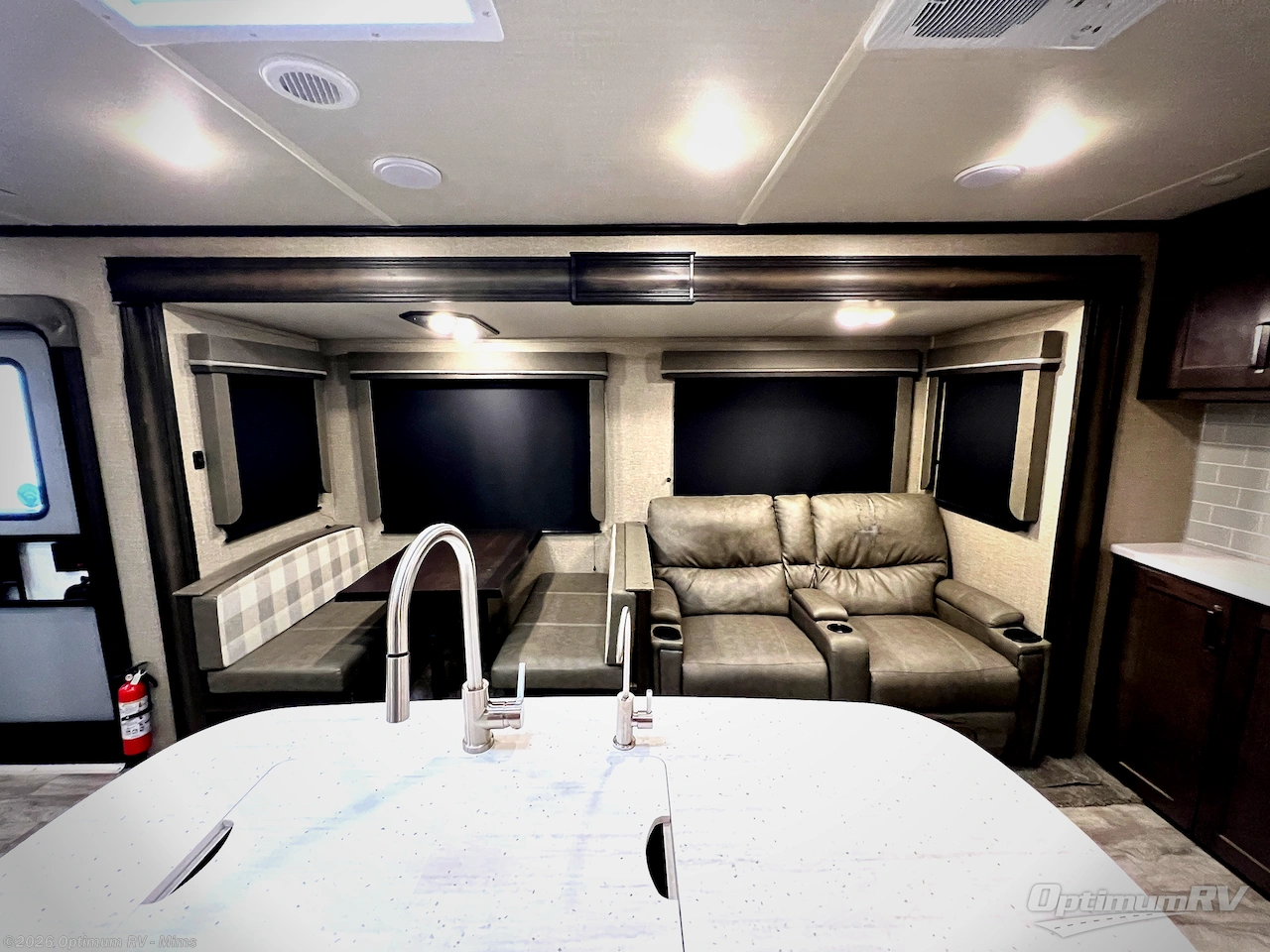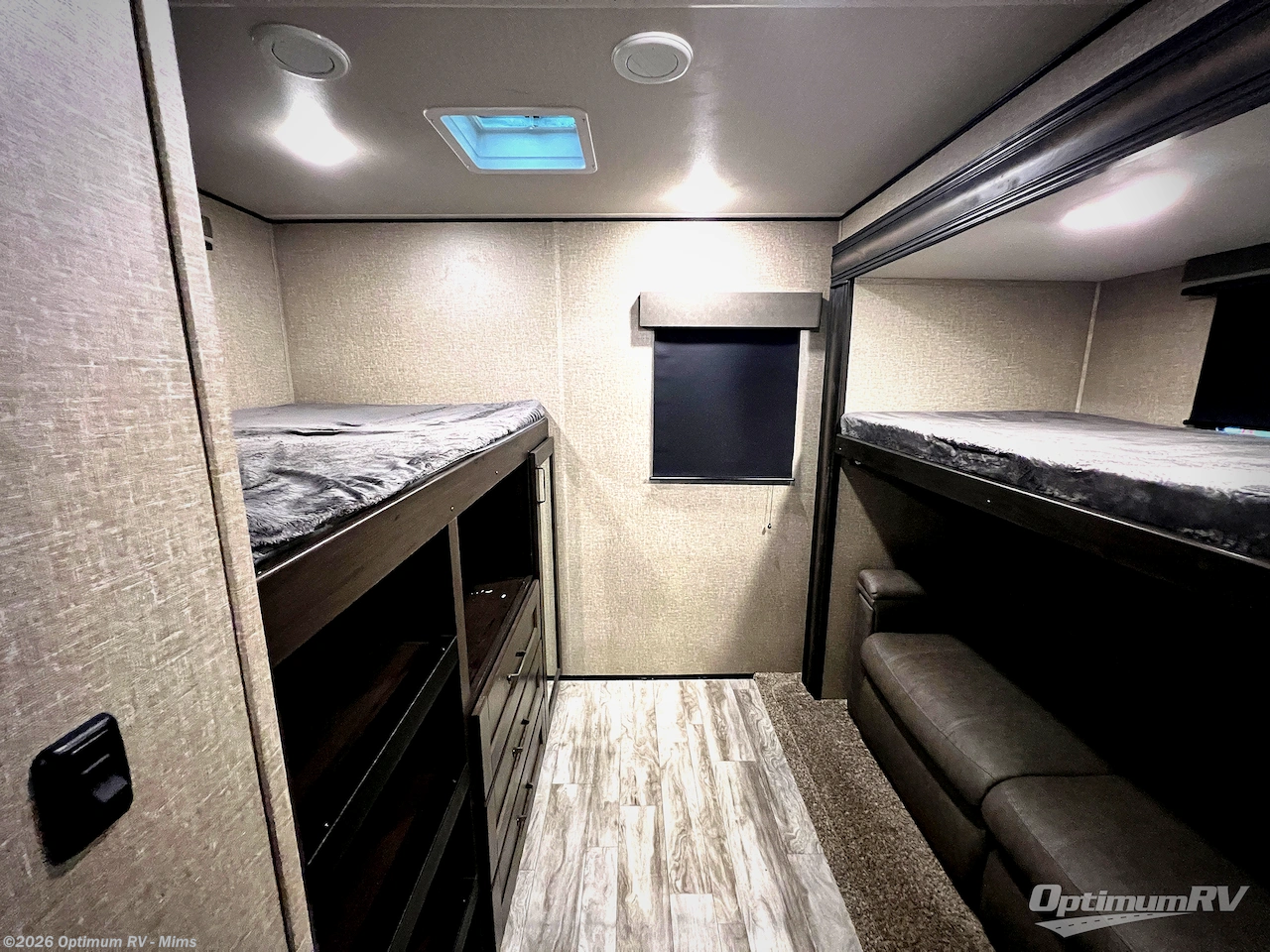 Finding the perfect trailer for a larger group is simple, take a look at this one for your next RV! The rear bunkhouse might be the first reason you fall in love because of the slide out with a flip bunk above a tri-fold sofa, the second bunk bed on the opposite side and storage below, and the large rear window for great views. The outside kitchen might be another reason allowing you to enjoy the outdoors while providing meals for everyone, and/or the inside gourmet kitchen with a 16 cu. ft. refrigerator, an island, and two hutches. Everyone can gather together and relax on the theatre seating with cupholders and the booth dinette or choose a free standing dinette option, and to visit or watch the 40" LED HDTV with fireplace below. The full bathroom includes a space savings sliding door and linen storage, and the bedroom gives you a front walk-around queen bed with storage for your clothes on each side, plus there is an additional wardrobe with drawers and the option to add a washer/dryer to the prepped space.