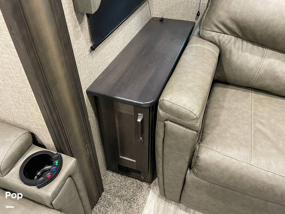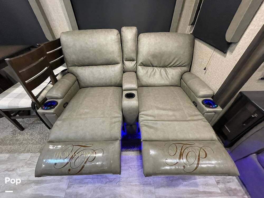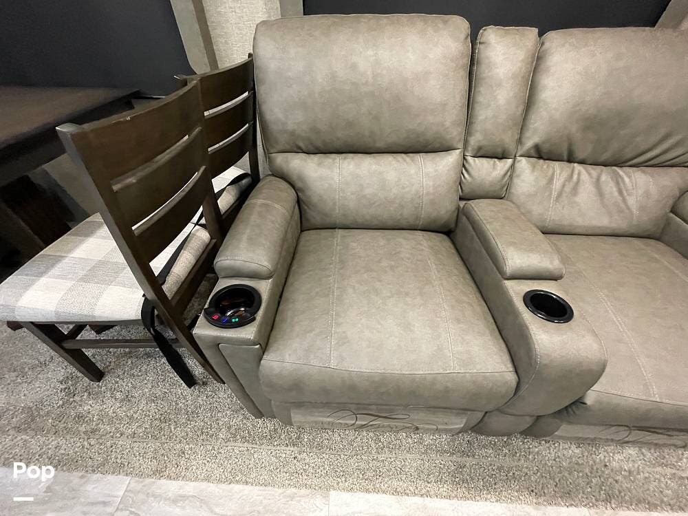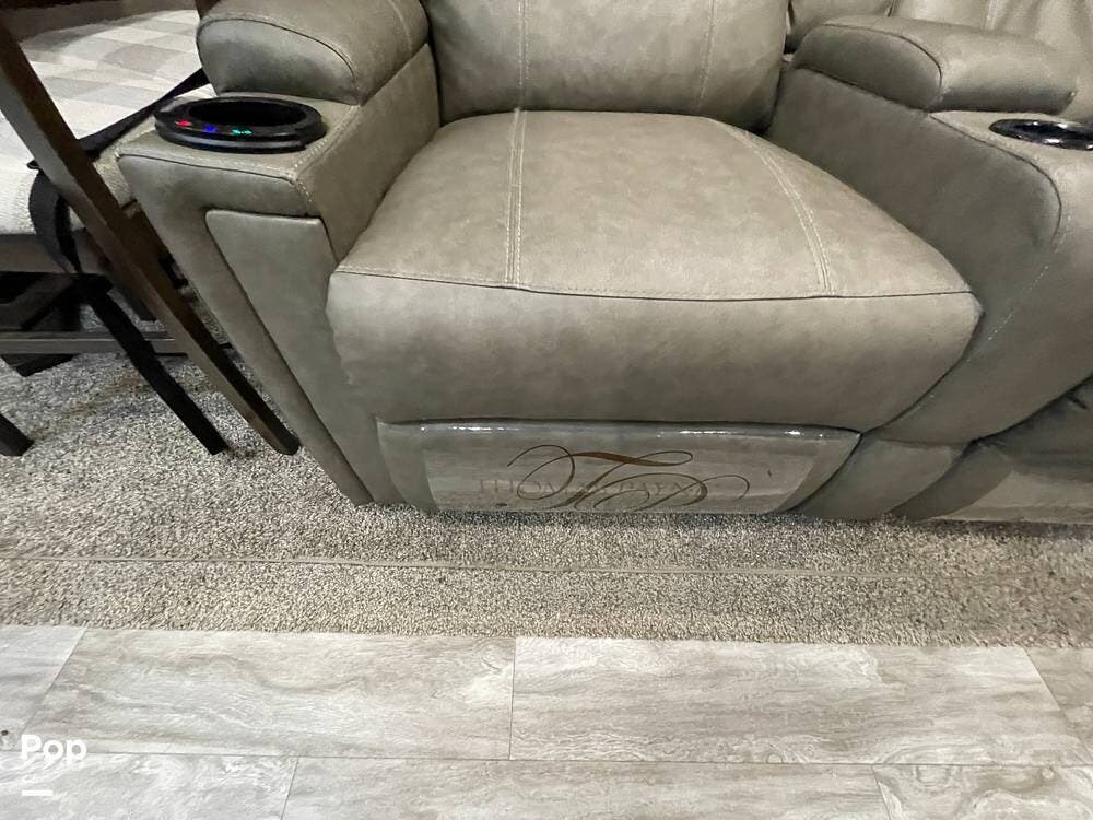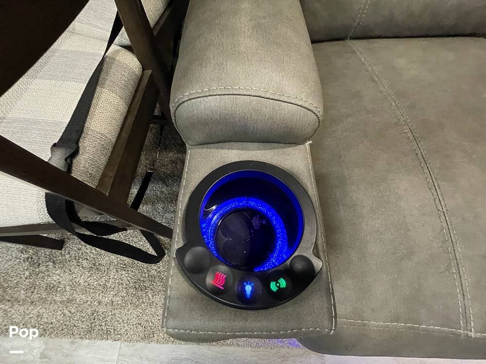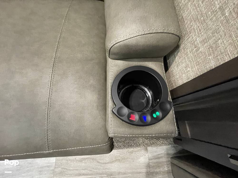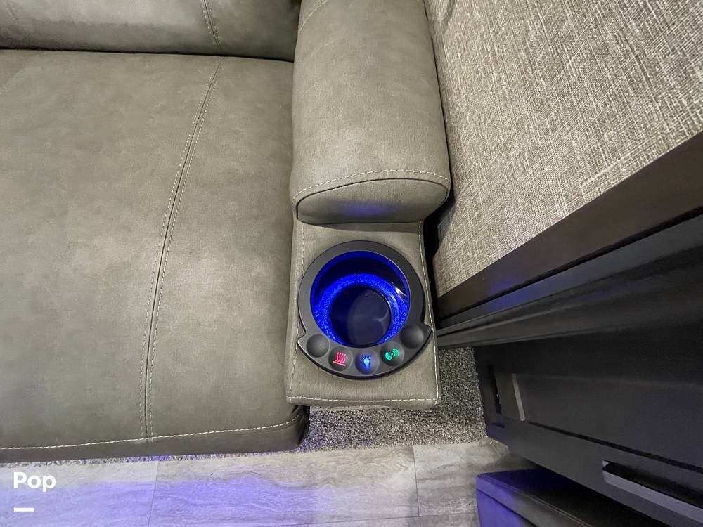 Also located in the slide next to the dining table is a pair of recliners. The recliners feature LED illuminated cup holders and heat and massage functions.