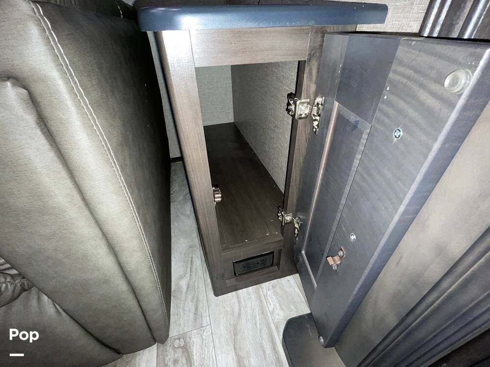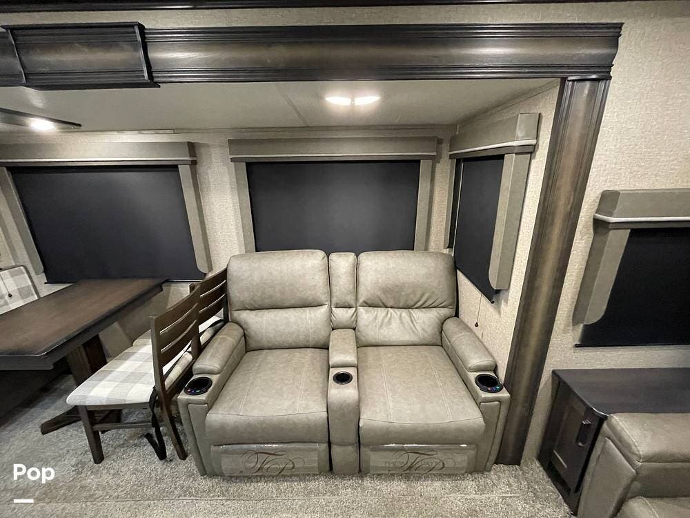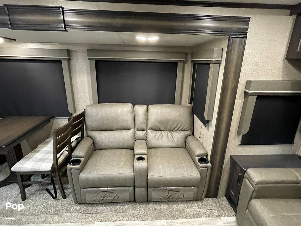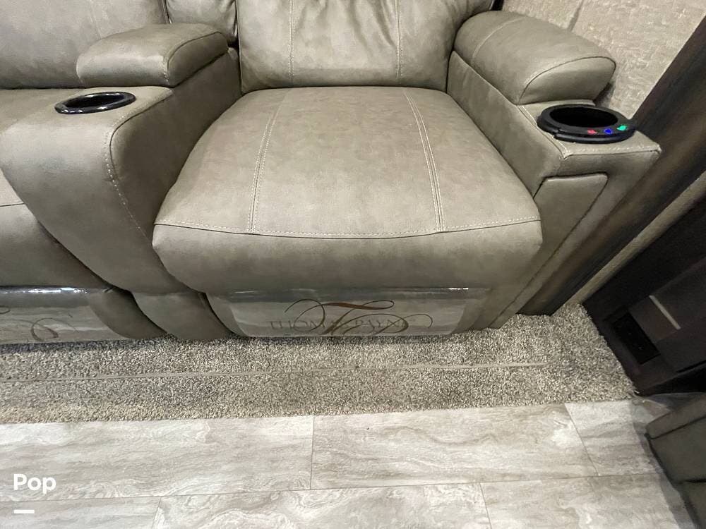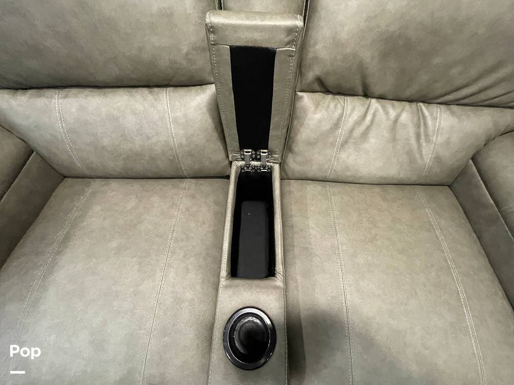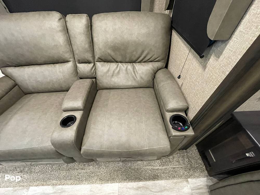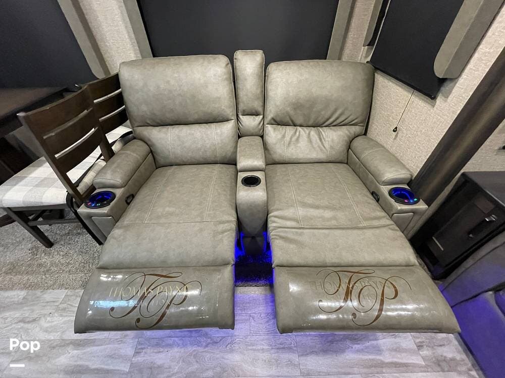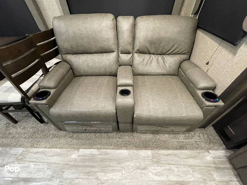 Also located in the slide next to the dining table is a pair of recliners. The recliners feature LED illuminated cup holders and heat and massage functions.