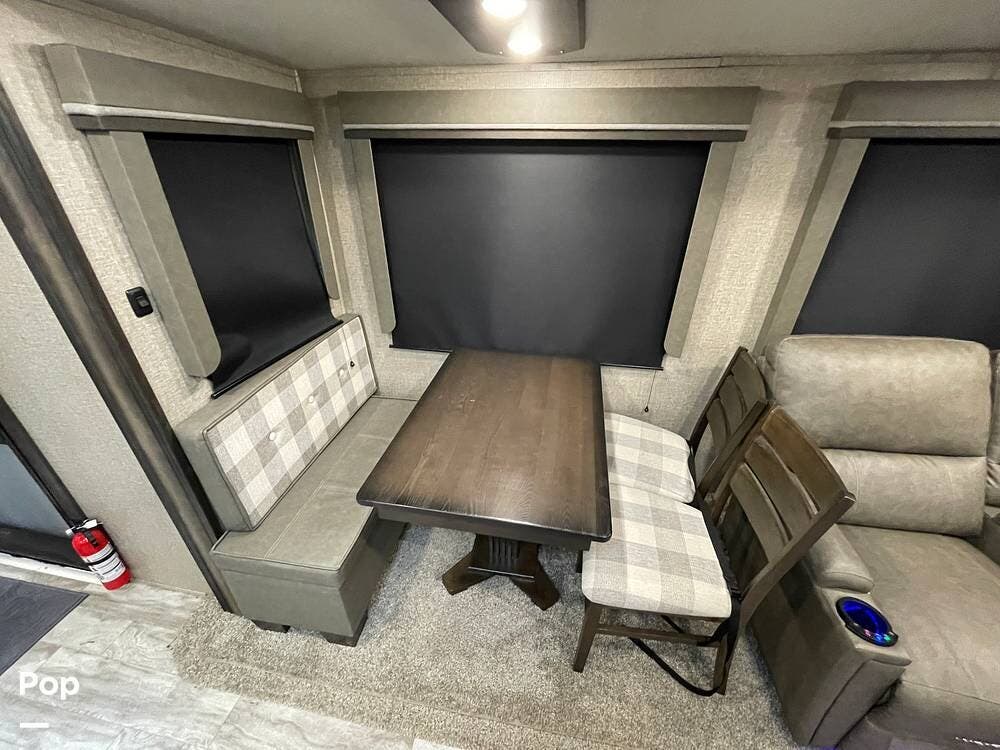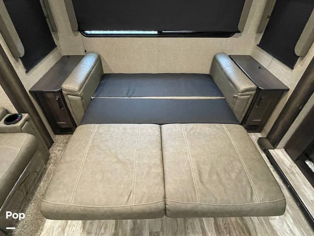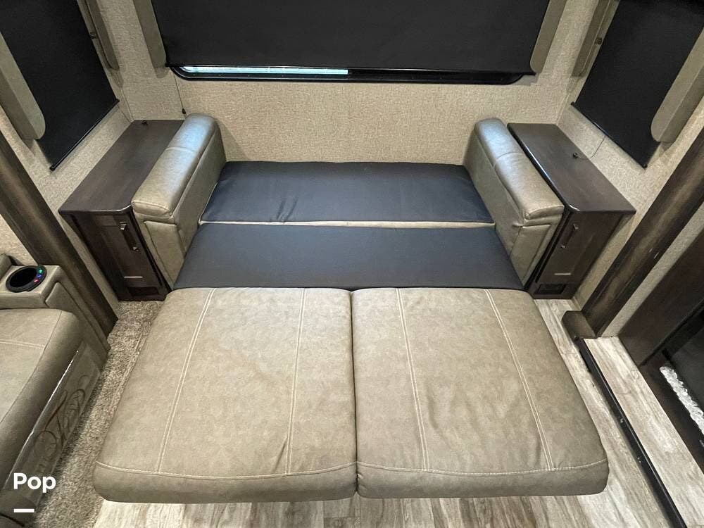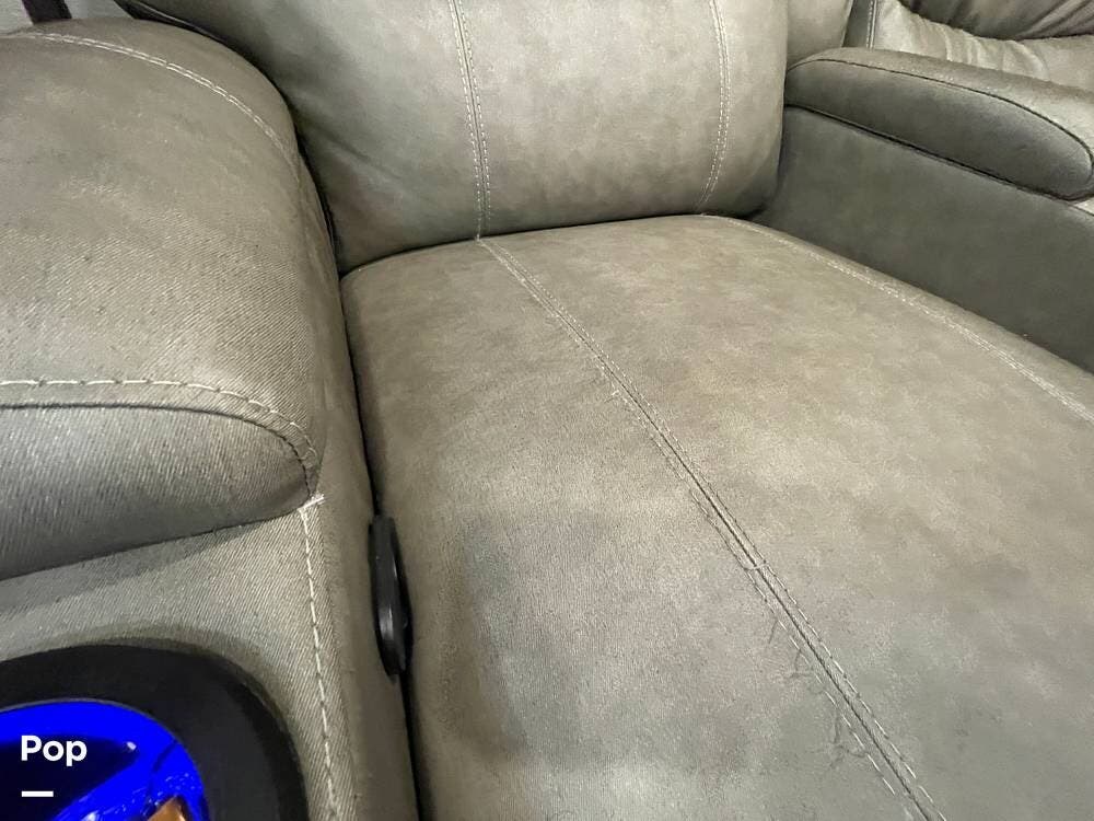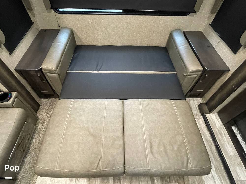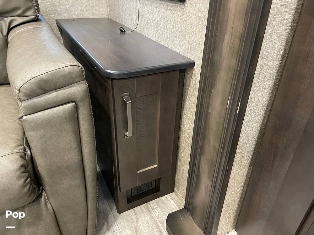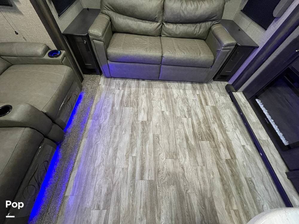 Also located in the slide next to the dining table is a pair of recliners. The recliners feature LED illuminated cup holders and heat and massage functions.