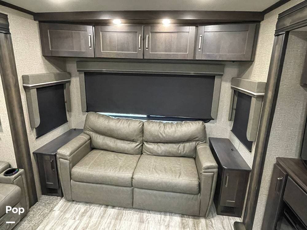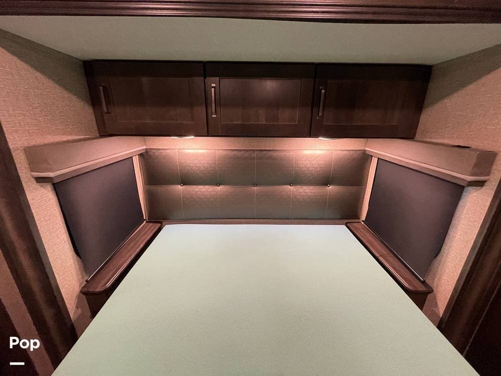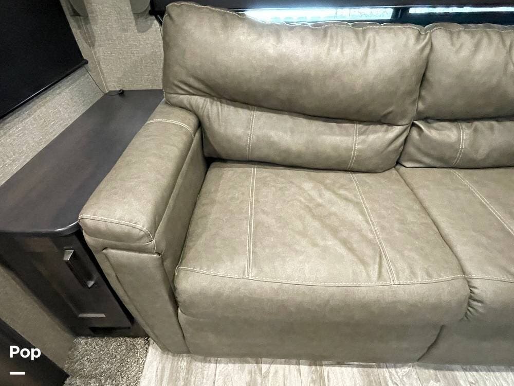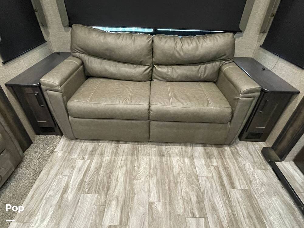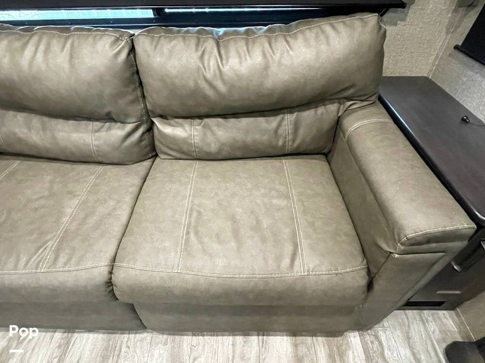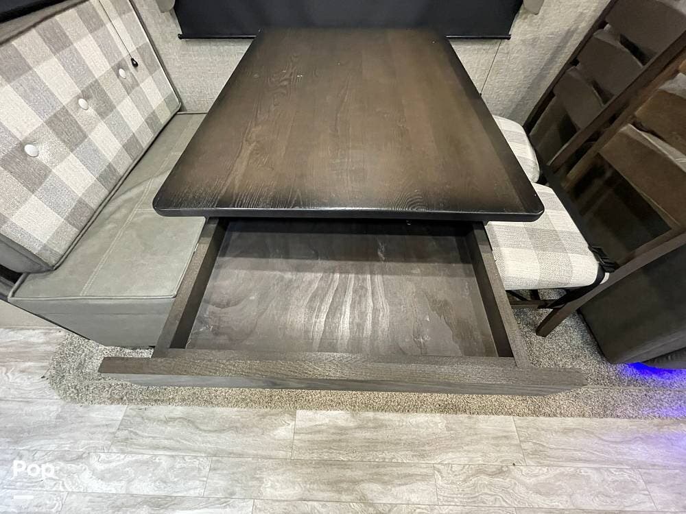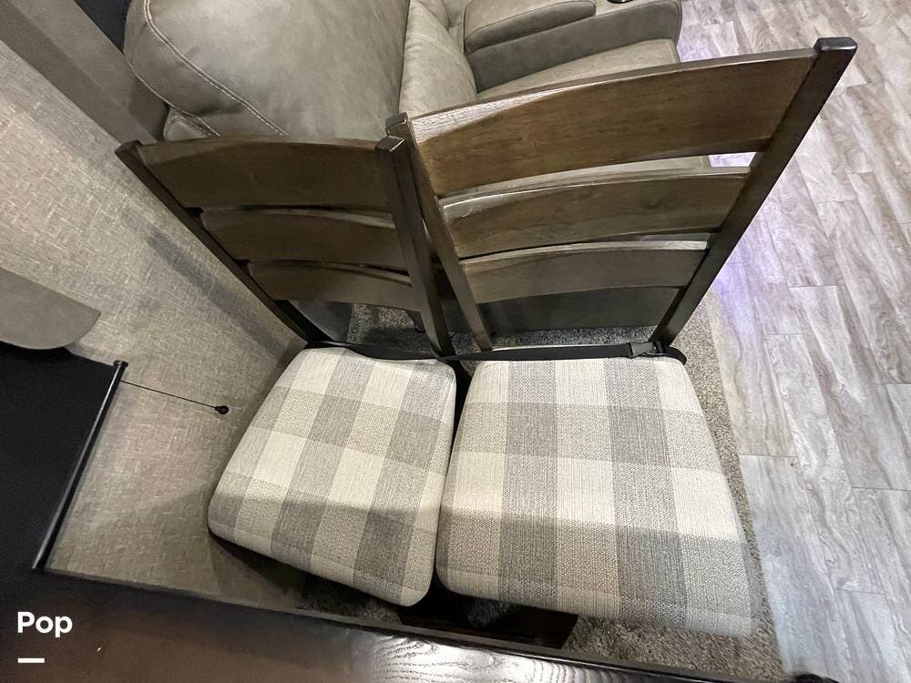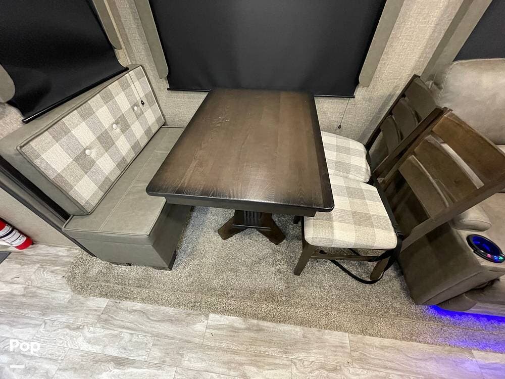 Also located in the slide next to the dining table is a pair of recliners. The recliners feature LED illuminated cup holders and heat and massage functions.