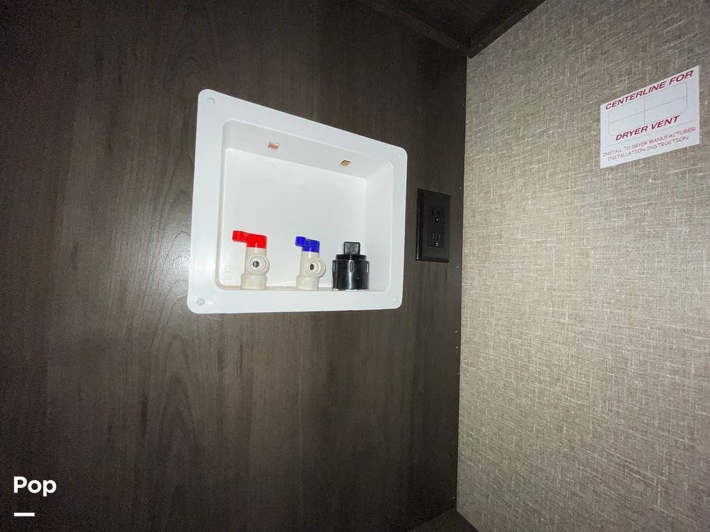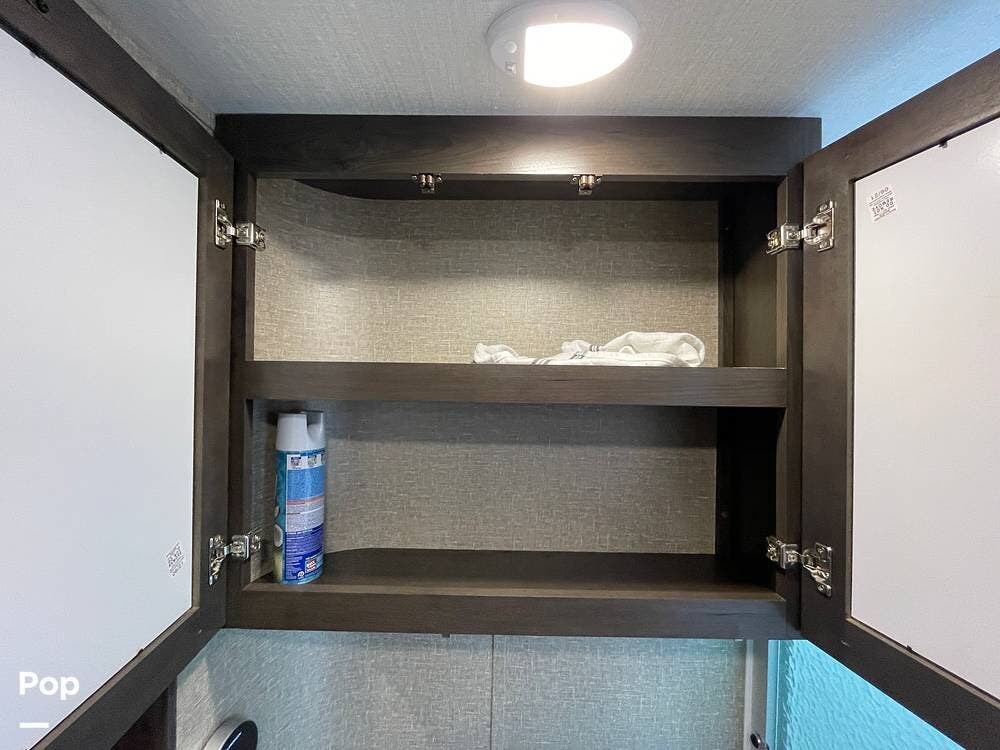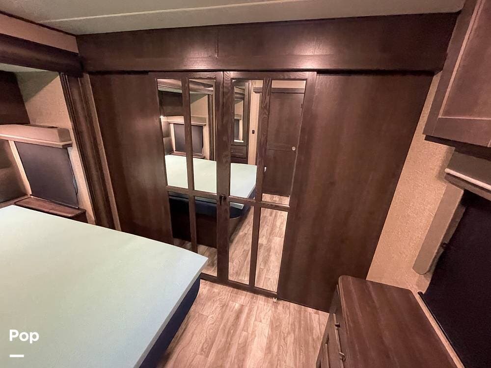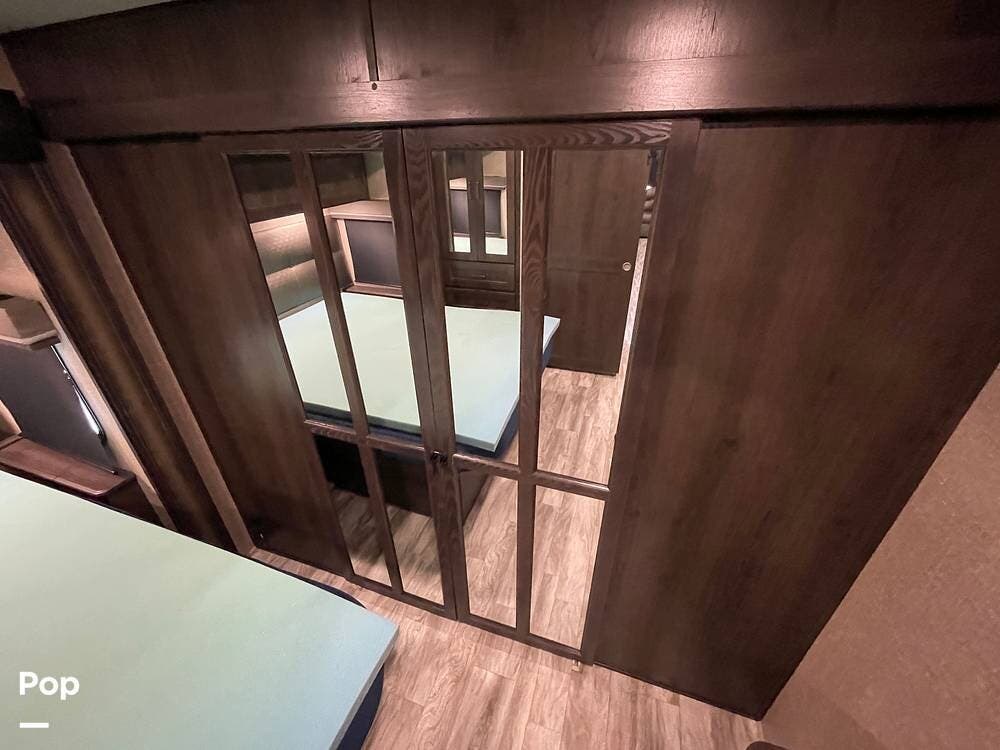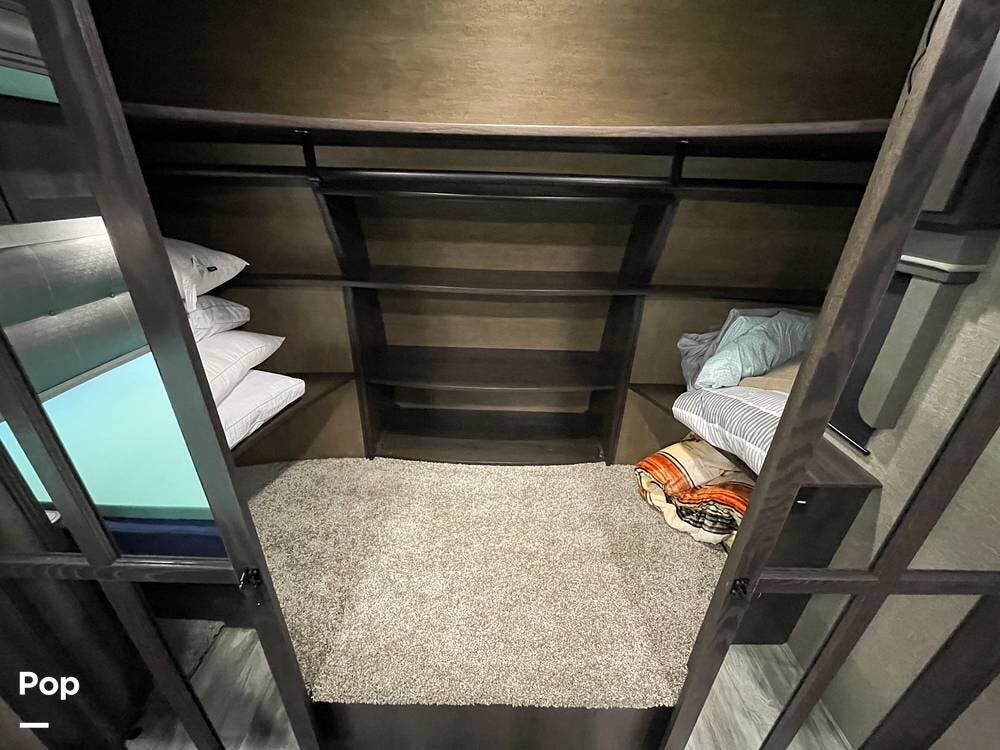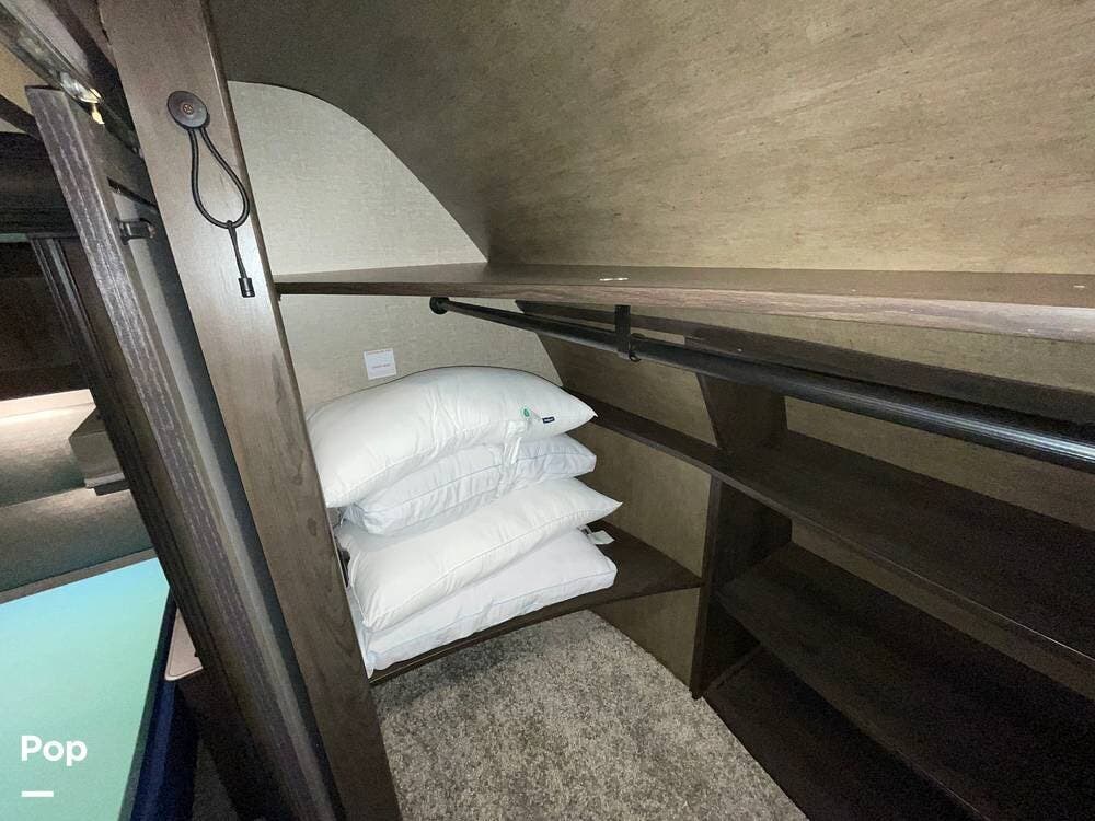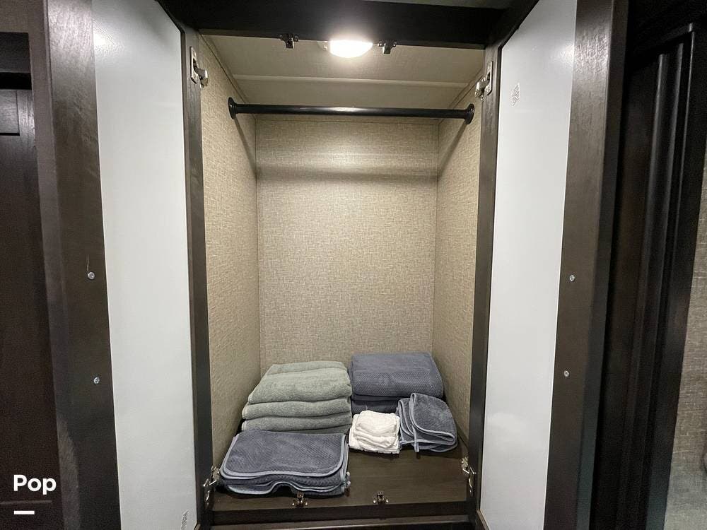 Running along the front of the RV is a large closet with mirrored doors providing much storage. The closet features built-in shelving, motion-activated lights, and is washer/dryer prepped.